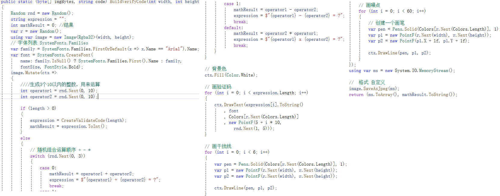 SixLaborsImageHelper.BuildVerifyCode函数内部调用SixLabors包相关类及函数生成验证码图形,其主要生成验证码的逻辑如下所示: