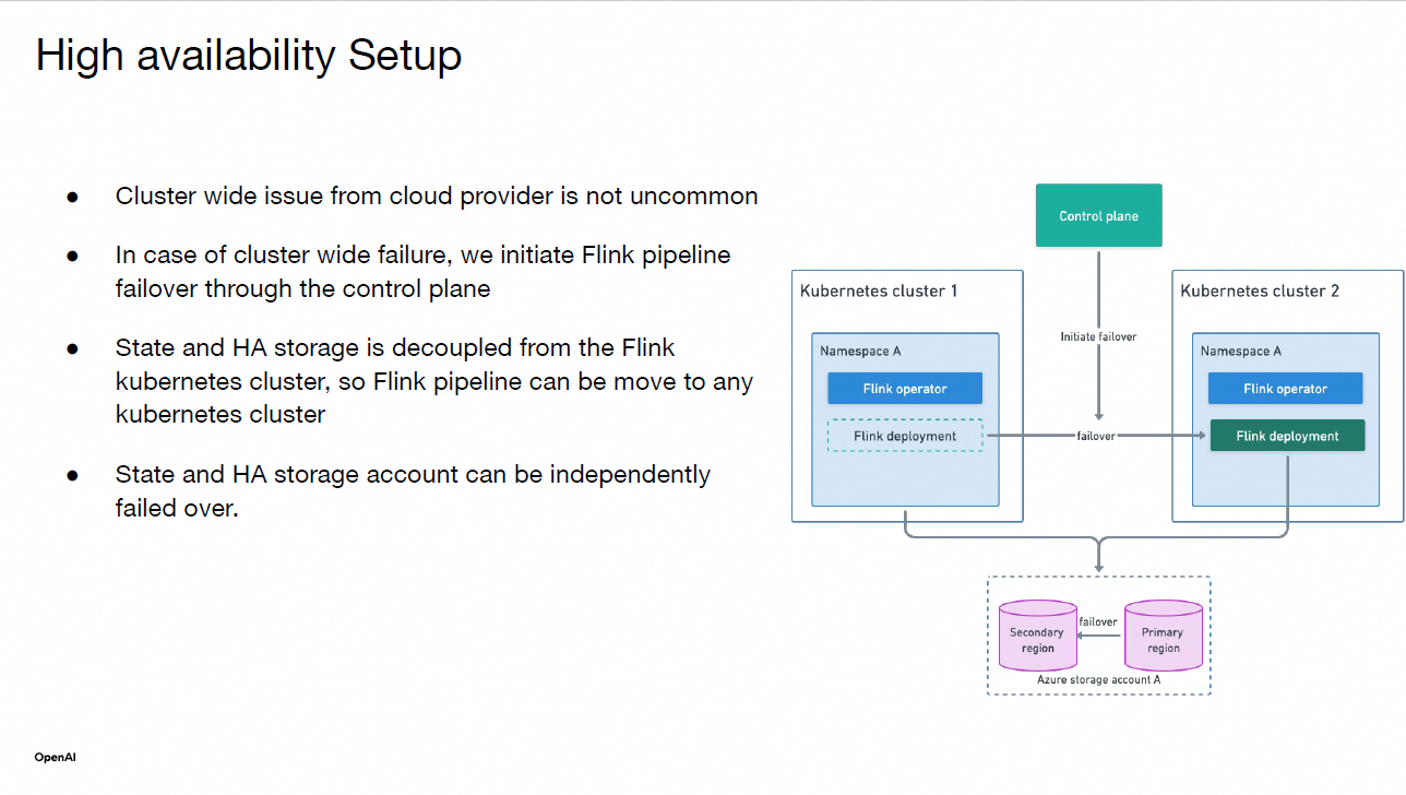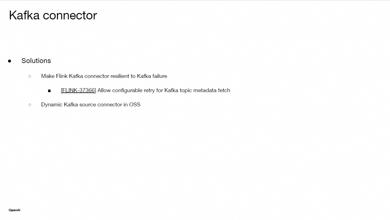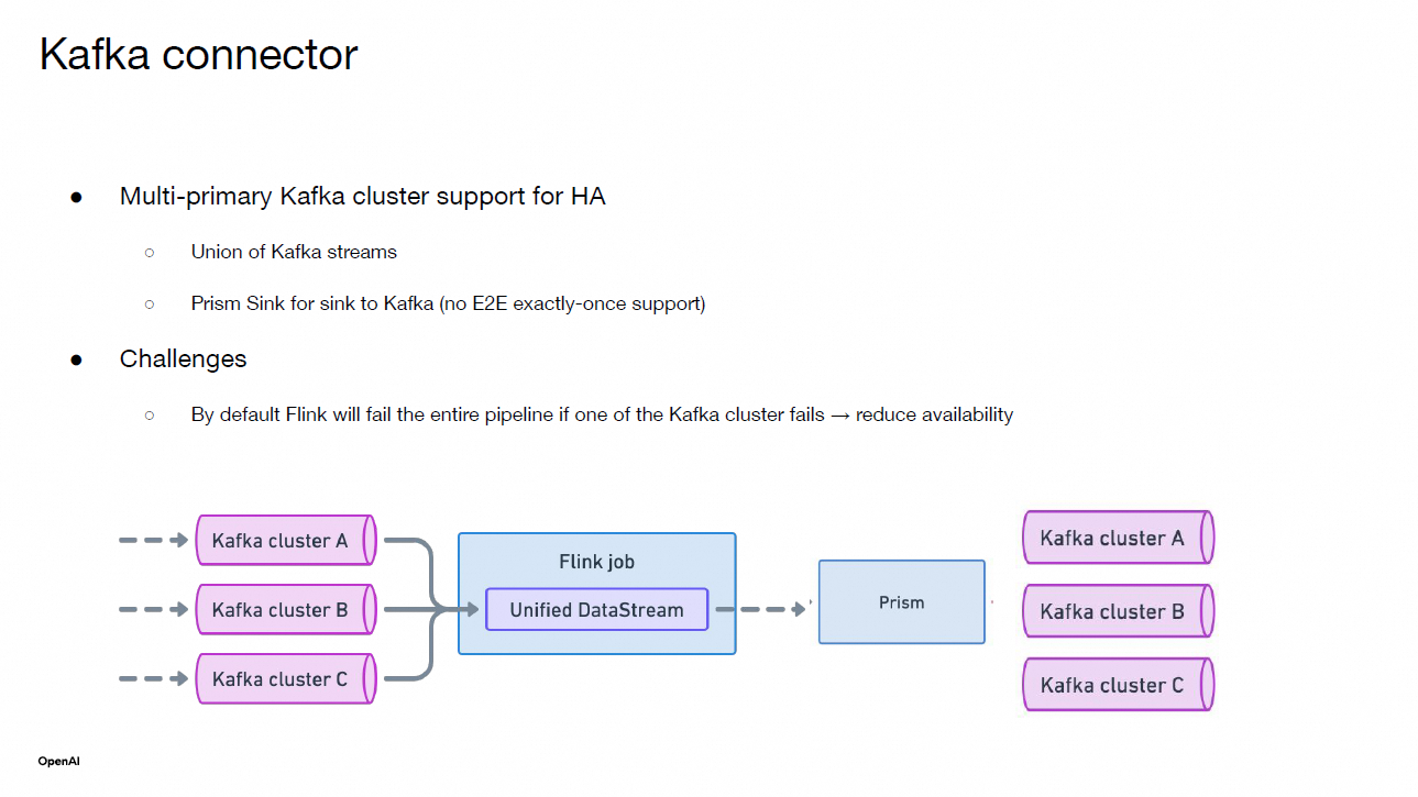 最后,我们还将 Flink 与 OpenAI 的 Kafka 生态系统进行了深度集成,以确保 Flink 能够与我们上面讨论的 Kafka HA 设置可靠地协同工作。