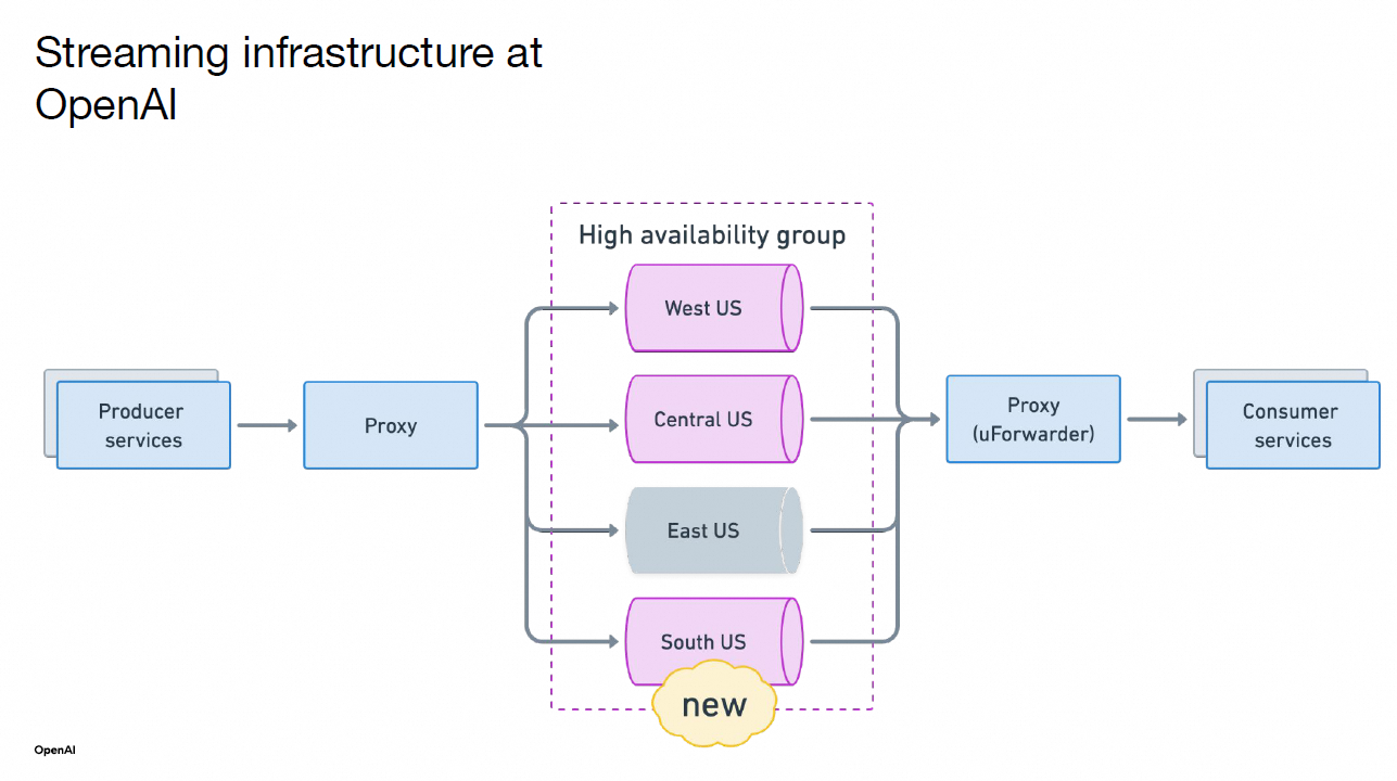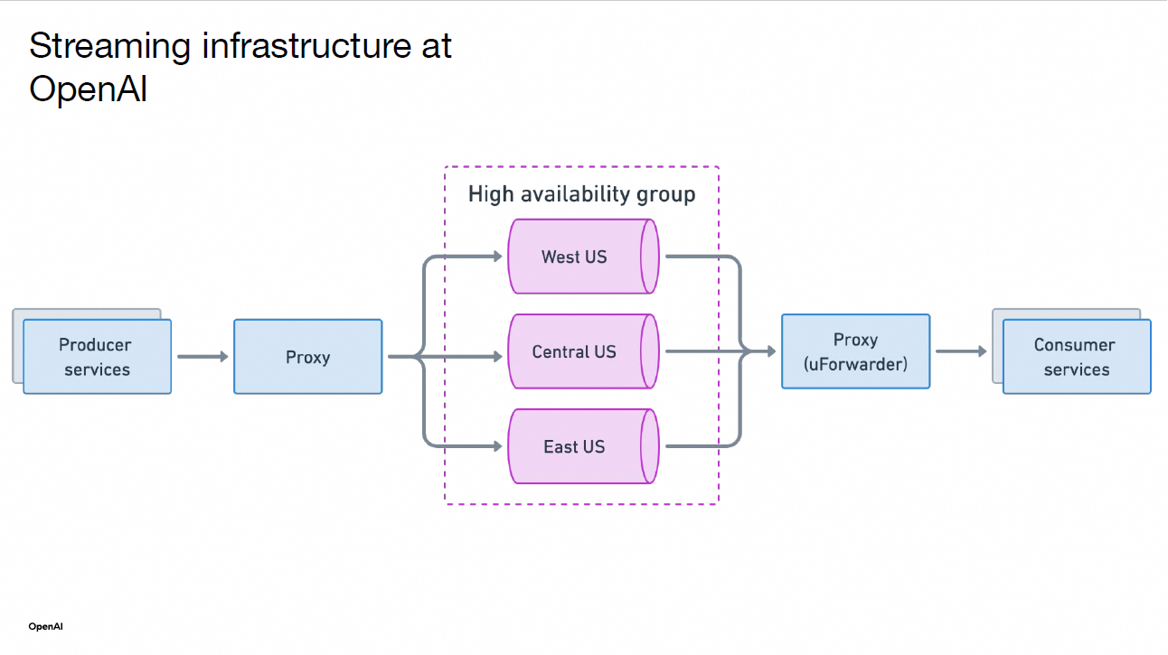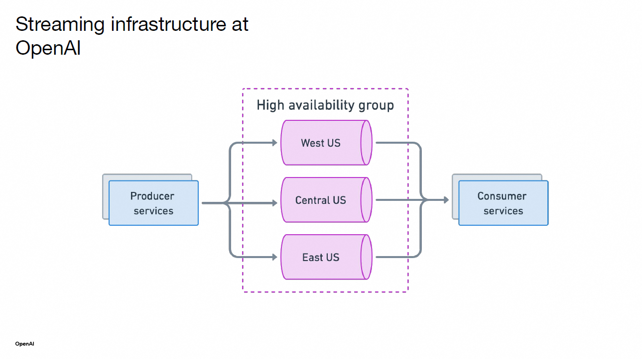 回顾一年前,OpenAI 的流式基础设施主要围绕 Kafka 及其生产者和消费者服务构建。Kafka 被广泛用于数据摄入、异步处理和服务间通信。随着 ChatGPT 的上线,Kafka 需求迅速增长,已成为支撑众多关键业务的核心基础设施之一。