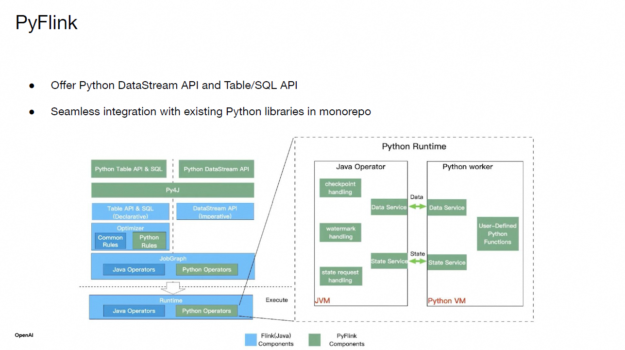 首先,我们来看看 Python。开源的 PyFlink 提供了 DataStream API 和 Table/SQL API 。在 OpenAI 内部,我们将 PyFlink 与我们的单体仓库(monorepo)系统集成,使用户可以像开发常规 Python 项目一样,复用所有现有的 Python 库。