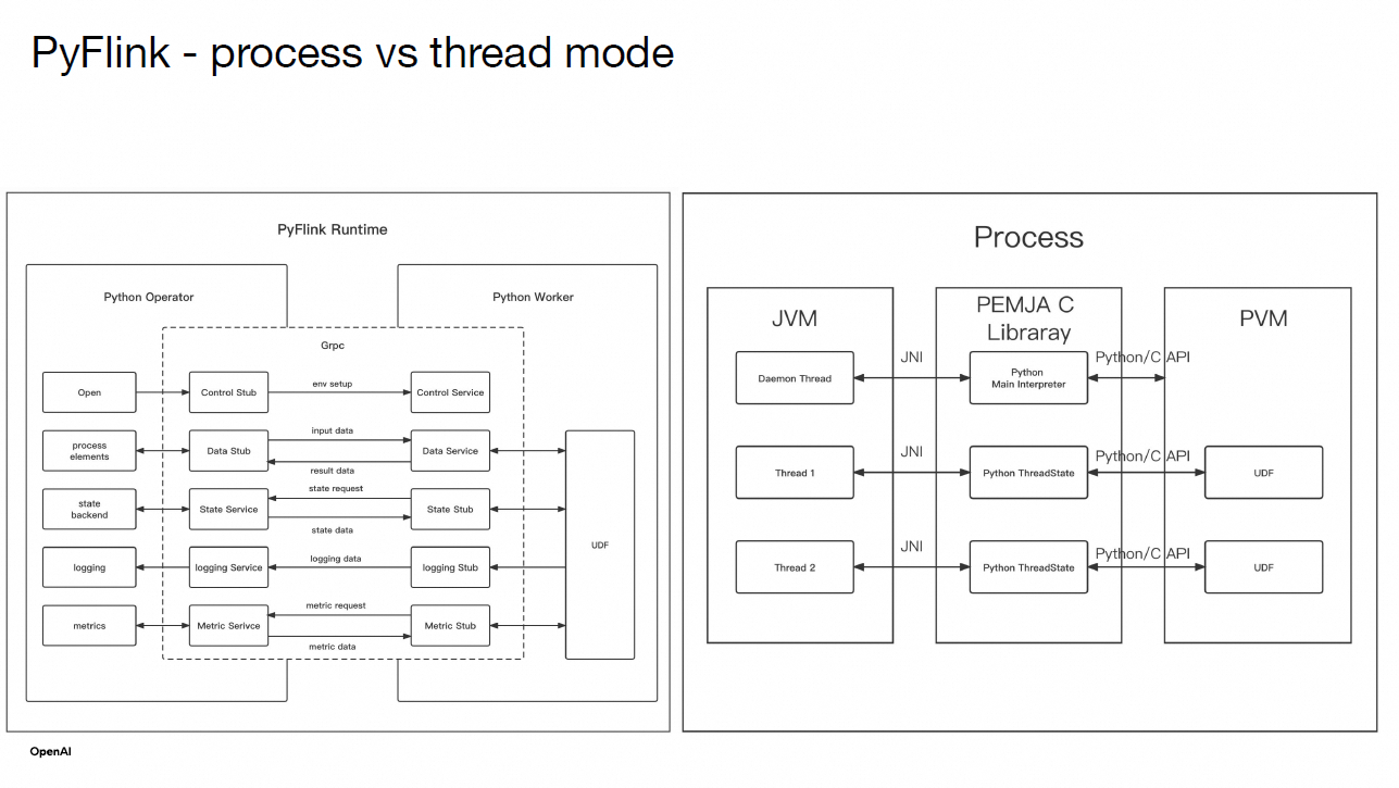 PyFlink 目前支持两种不同的执行模式来运行 Python 用户自定义函数:进程模式(process mode)和线程模式(thread mode)。默认模式是进程模式。在进程模式下,用户的 Python 函数作为单独的进程运行,并使用 Apache Beam 的可移植性框架与 JVM 算子通信。它具有良好的资源隔离性,总体上也更成熟。然而,其局限性在于 IPC 开销,因为它们使用 gRPC 在 JVM 进程和 Python 进程之间进行通信。这会带来序列化和反序列化的开销。此外,这也需要更多的调优参数来适应不同类型的工作负载,例如批处理大小(batch size)和批处理超时(batch timeout)。