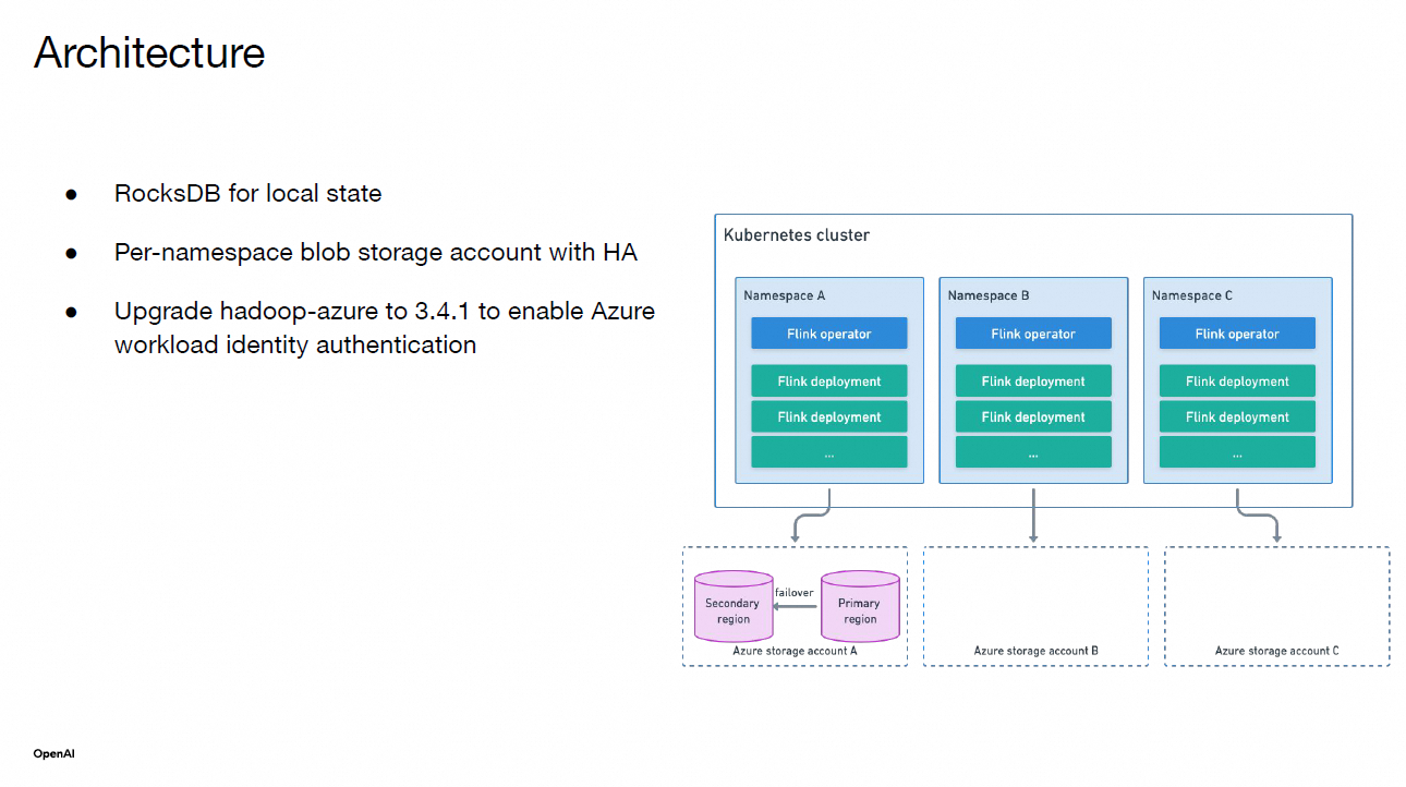 在构建过程中,我们遇到了一个需要注意的问题:目前开源的 Apache Flink 实际上并不支持 Azure Workload Identity 身份验证,而这是 Azure 推荐的用于安全访问存储账户的方式。为了解决这个问题,我们内部将 hadoop-azure 库升级到了 3.4.1,以启用 Azure Workload Identity 身份验证。我们也计划将此贡献回社区。