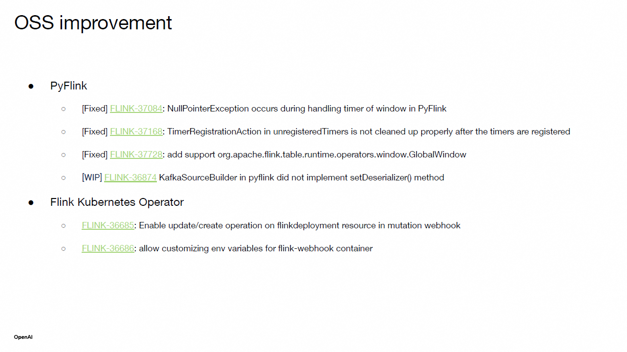 在结束本次分享之前,我们想简要谈谈未来的演进方向。这一路走来,我们踩过不少坑,也向社区提交了一系列 issue 和 PR。其中不少集中在 PyFlink 上------比如相比 Java 版本仍存在的功能缺失或稳定性问题;还有一些则涉及更细粒度的部署定制和云环境特有的挑战。
