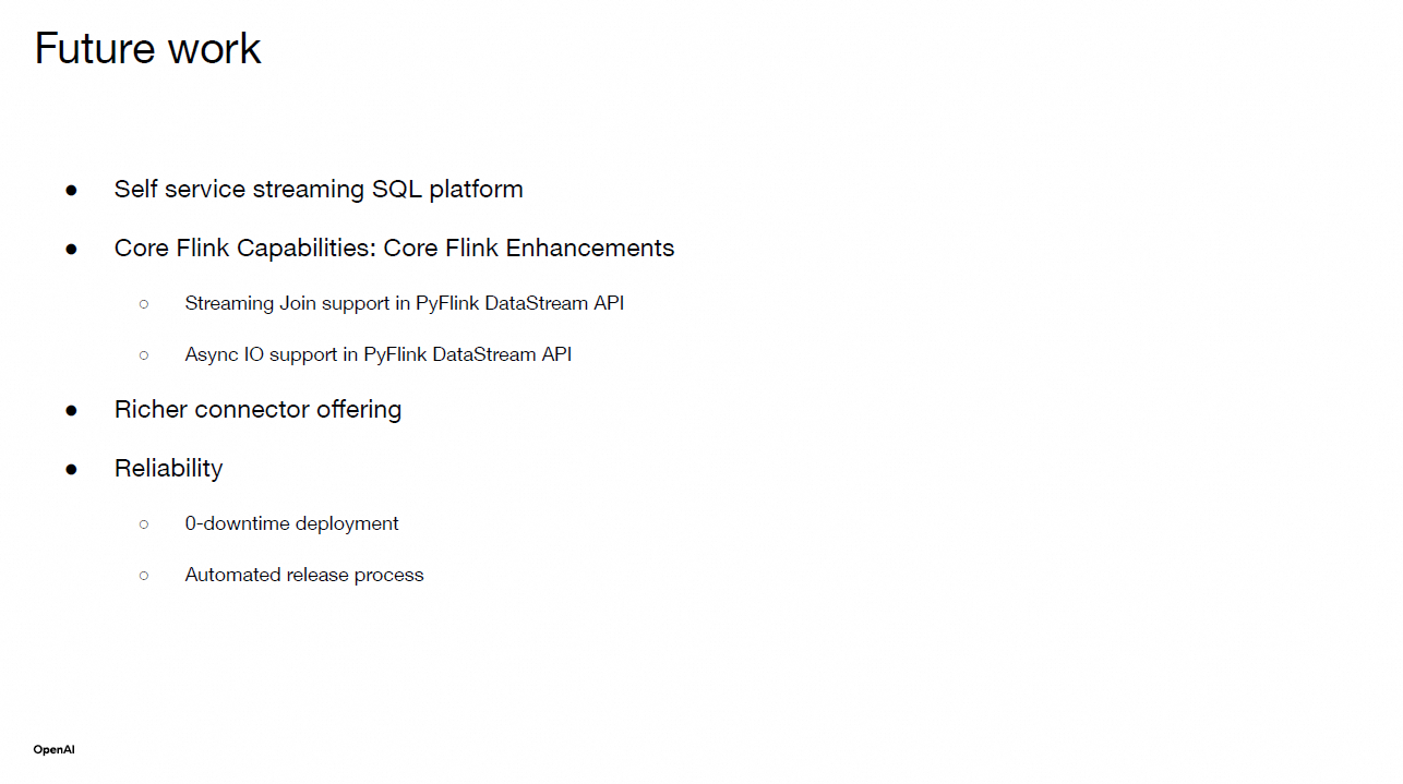 到目前为止,我们已经在 OpenAI 将 PyFlink 投入生产。然而,我们也观察到了一些挑战,首先是效率问题。基本上,正如我们所见,所有的 Python 函数(用户逻辑)都在 Python 中运行,并且在进程模式下 IPC 期间会产生额外的序列化和反序列化成本。因此,对于大规模作业,我们也支持用户用 Java 实现他们的处理函数。PyFlink 实际上支持从 Python DataStream API 调用它们,因此我们可以支持用 Python 编排流处理逻辑,但实际代码将在 JVM 中运行。