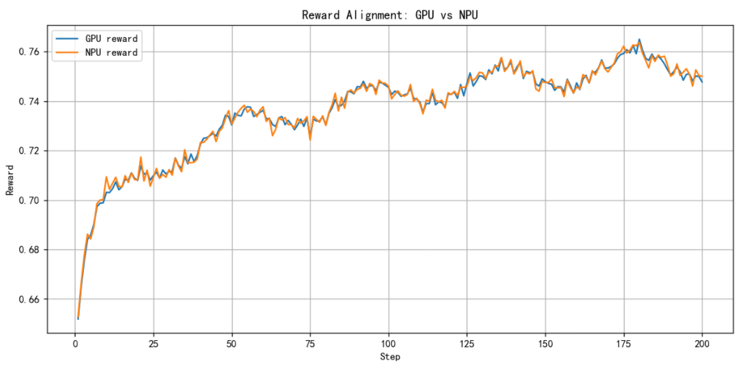 GPU 与 NPU 在前 200 步的 Reward 曲线对齐结果。可以看到两者趋势一致,误差保持在约 0.015% 范围内,满足 GRPO 强化学习对奖励信号的一致性要求。