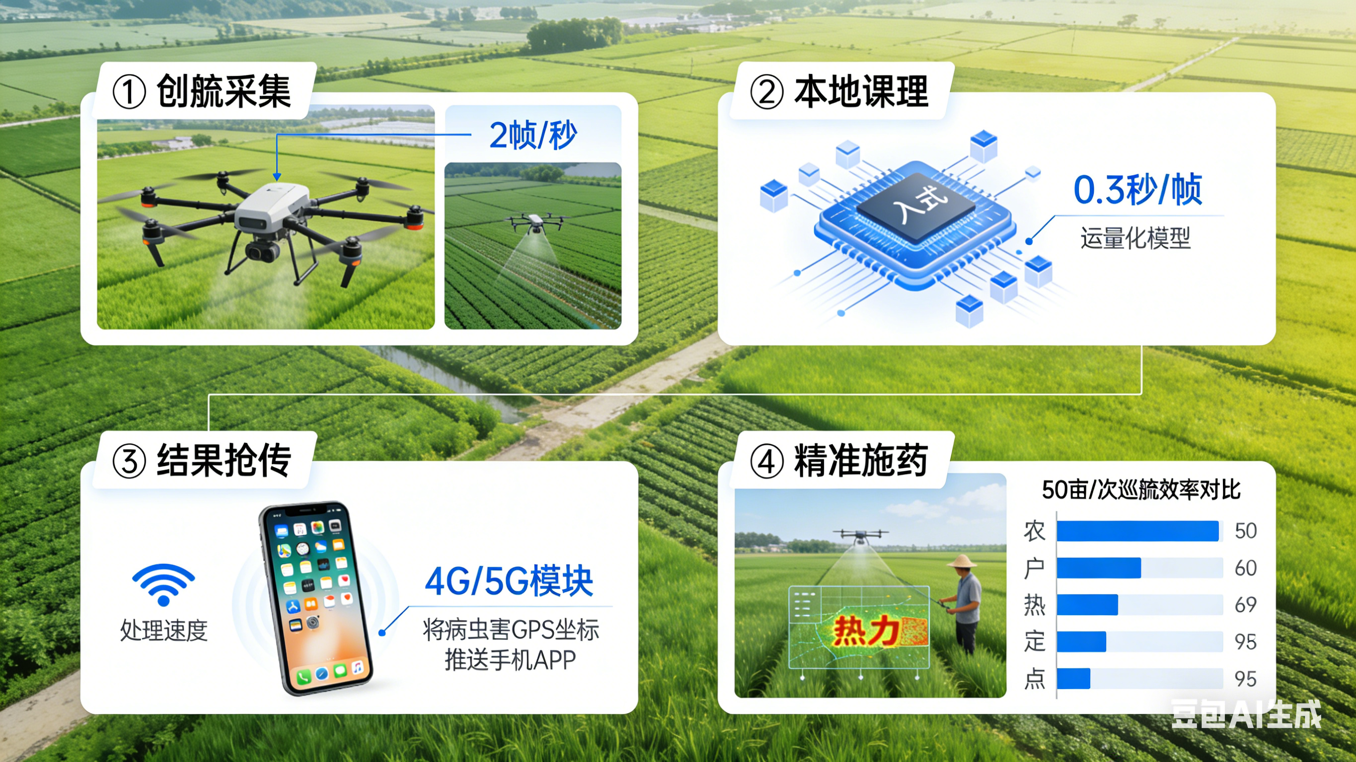 压缩后的模型在无人机本地实时处理图像,0.3秒内完成单帧图像的病虫害识别(包括病虫害类型、严重程度、感染面积占比);