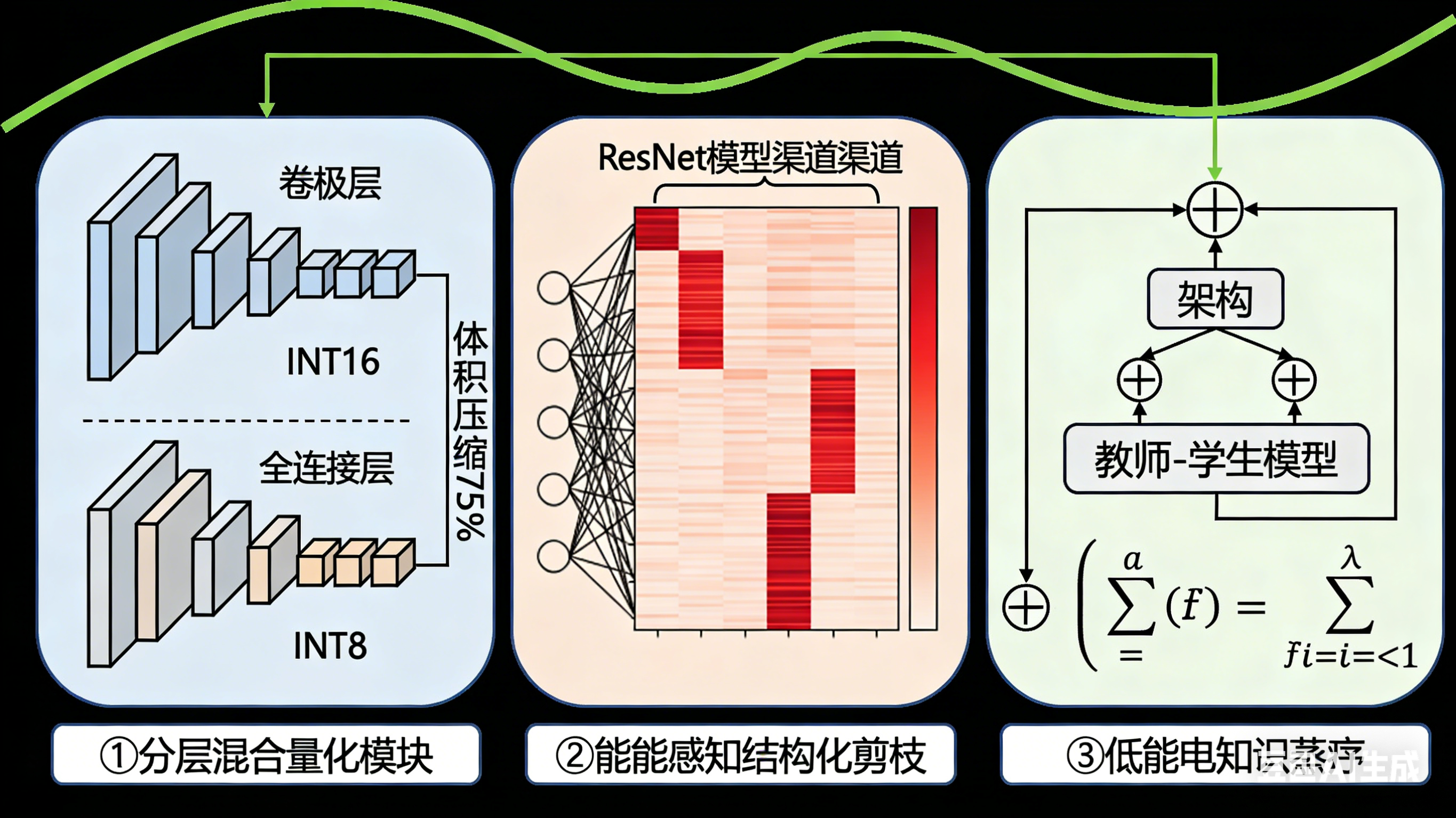 不同于传统仅追求"体积压缩"的算法,这款方案以"能源效率"为核心目标,设计"三维优化"压缩策略,在缩减模型体积的同时,从底层降低训练与推理能耗: