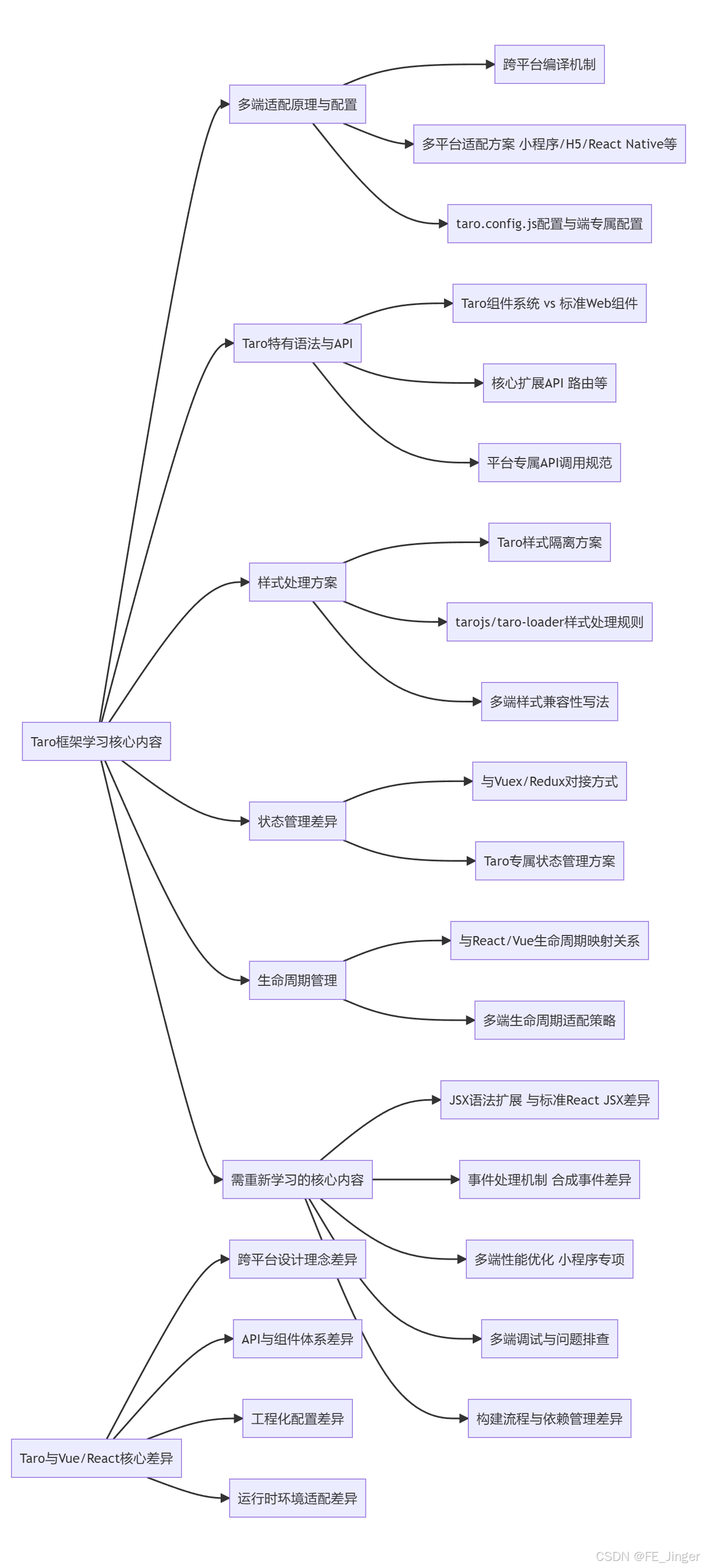 先通过思维导图明确Taro学习的整体脉络,清晰定位核心模块、跨框架差异及重学内容的关联关系: