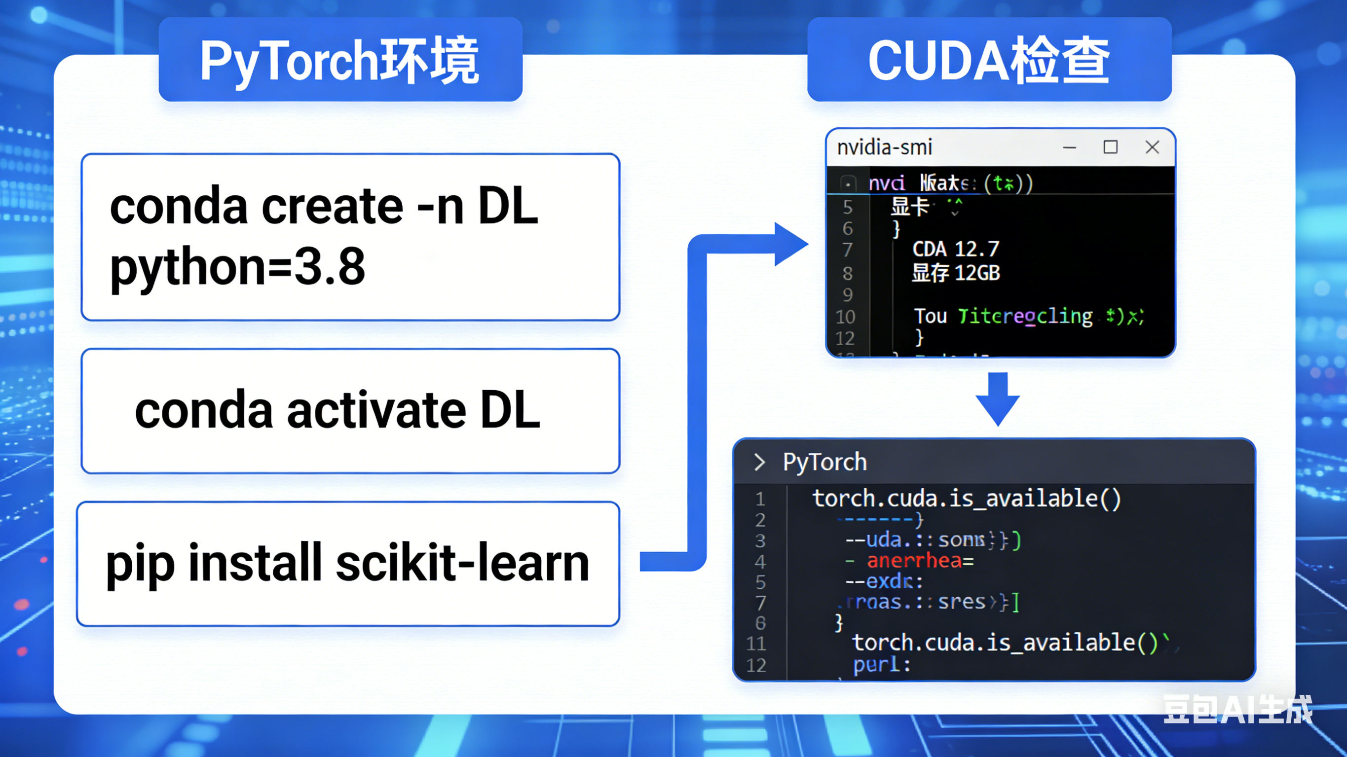 DL的conda环境(Python 3.8),安装了pytorch、scikit-learn等核心依赖;区分了CPU/GPU版本的PyTorch安装,GPU版本需依赖NVIDIA显卡的CUDA/CUDNN组件。 - CUDA验证 :通过