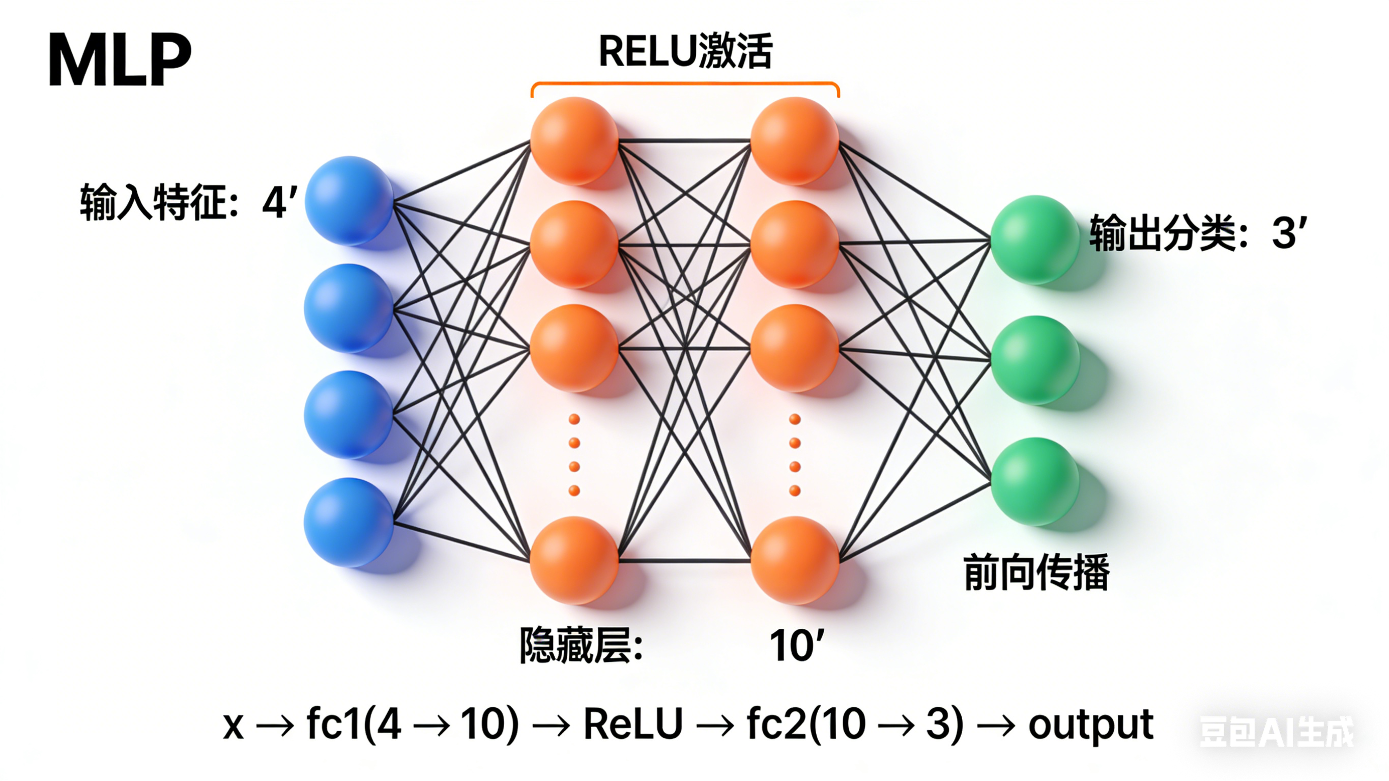 nn.Linear(4, 10)):4个特征→10个隐藏神经元; - 激活函数(ReLU):引入非线性,解决线性模型表达能力不足的问题;