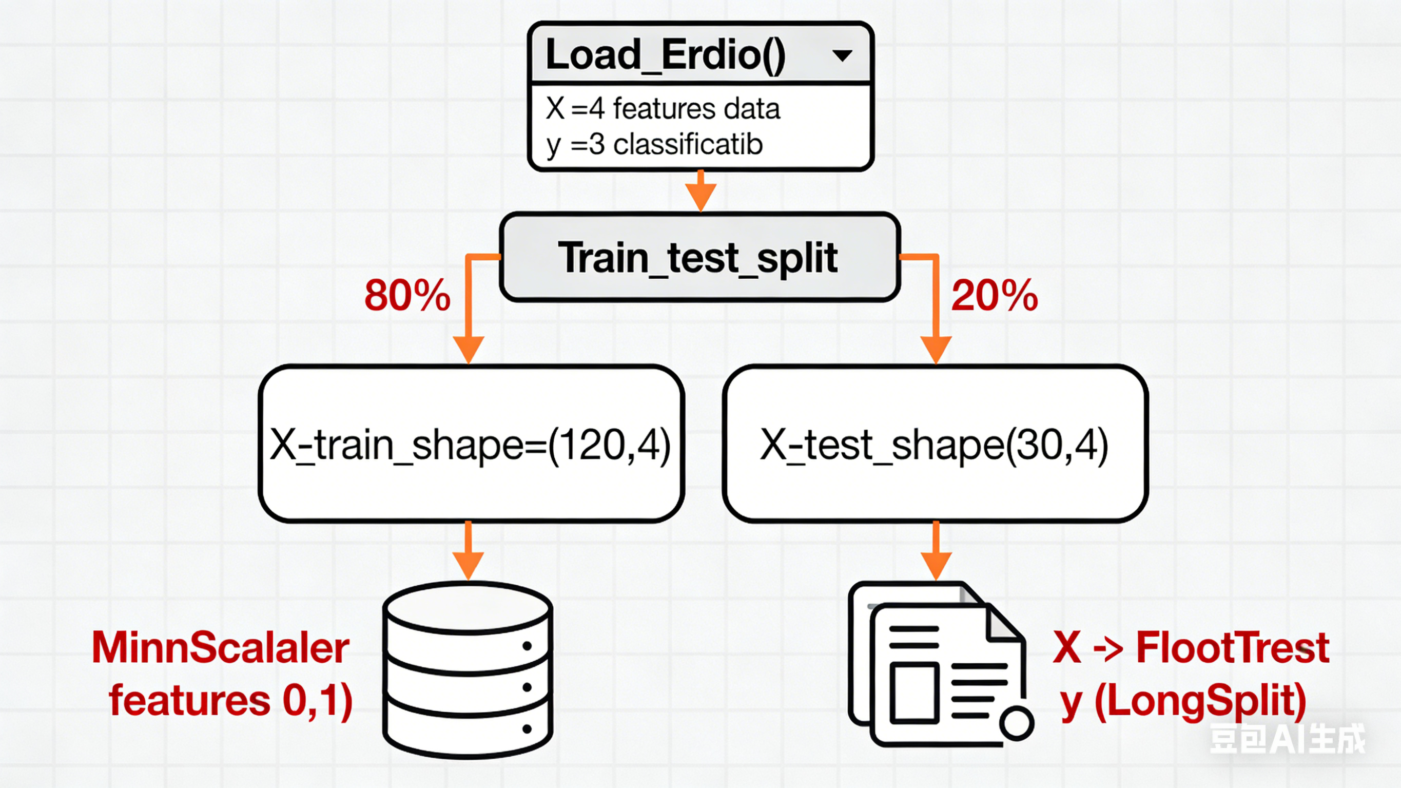 图2:鸢尾花数据集预处理流程图。呈现从数据加载、划分、归一化到张量转换的全过程,标注数据维度变化。