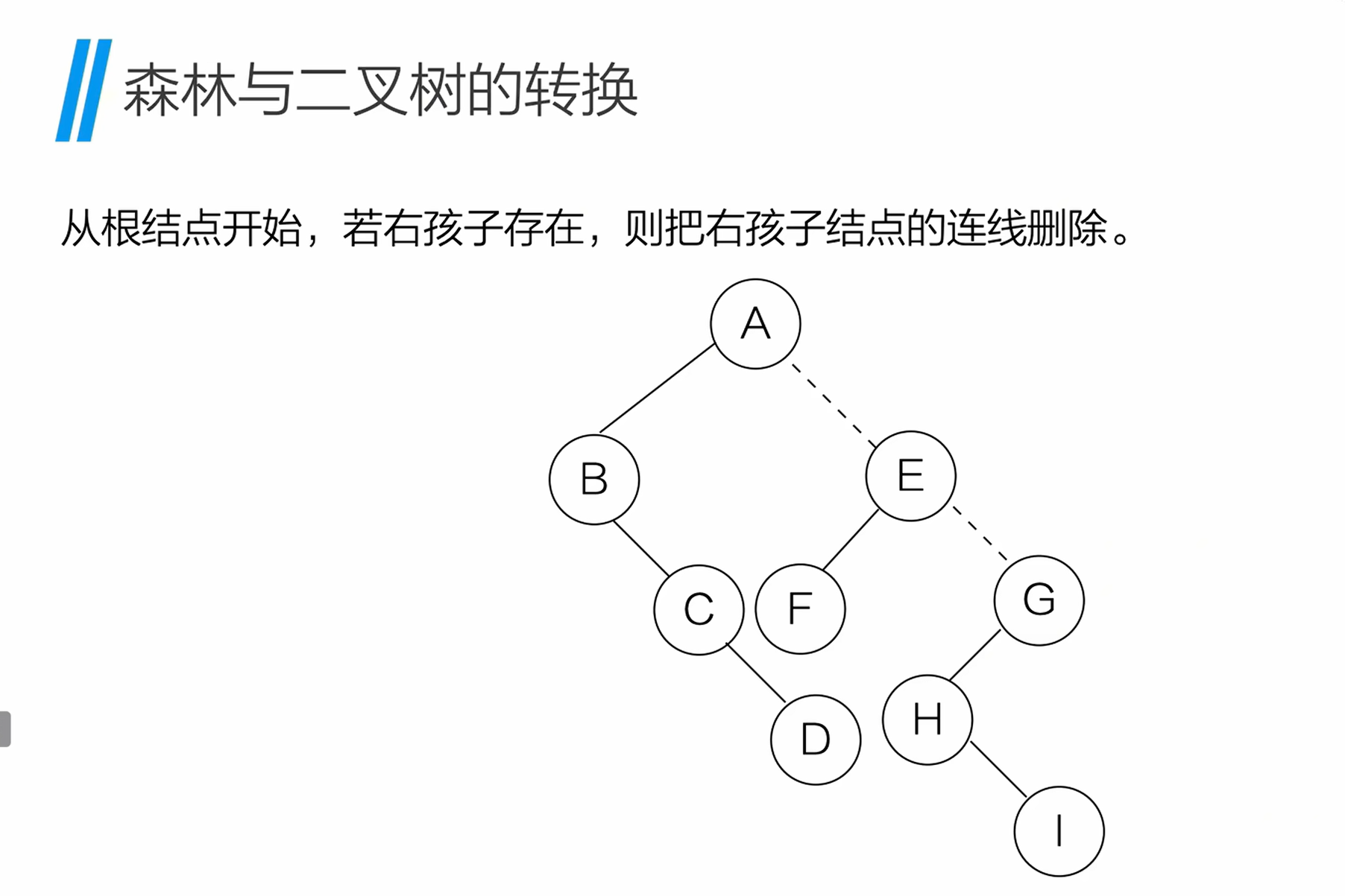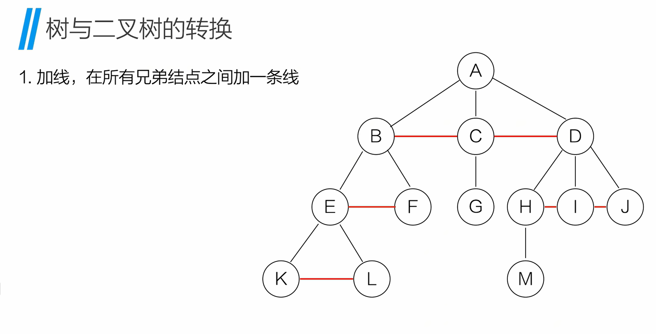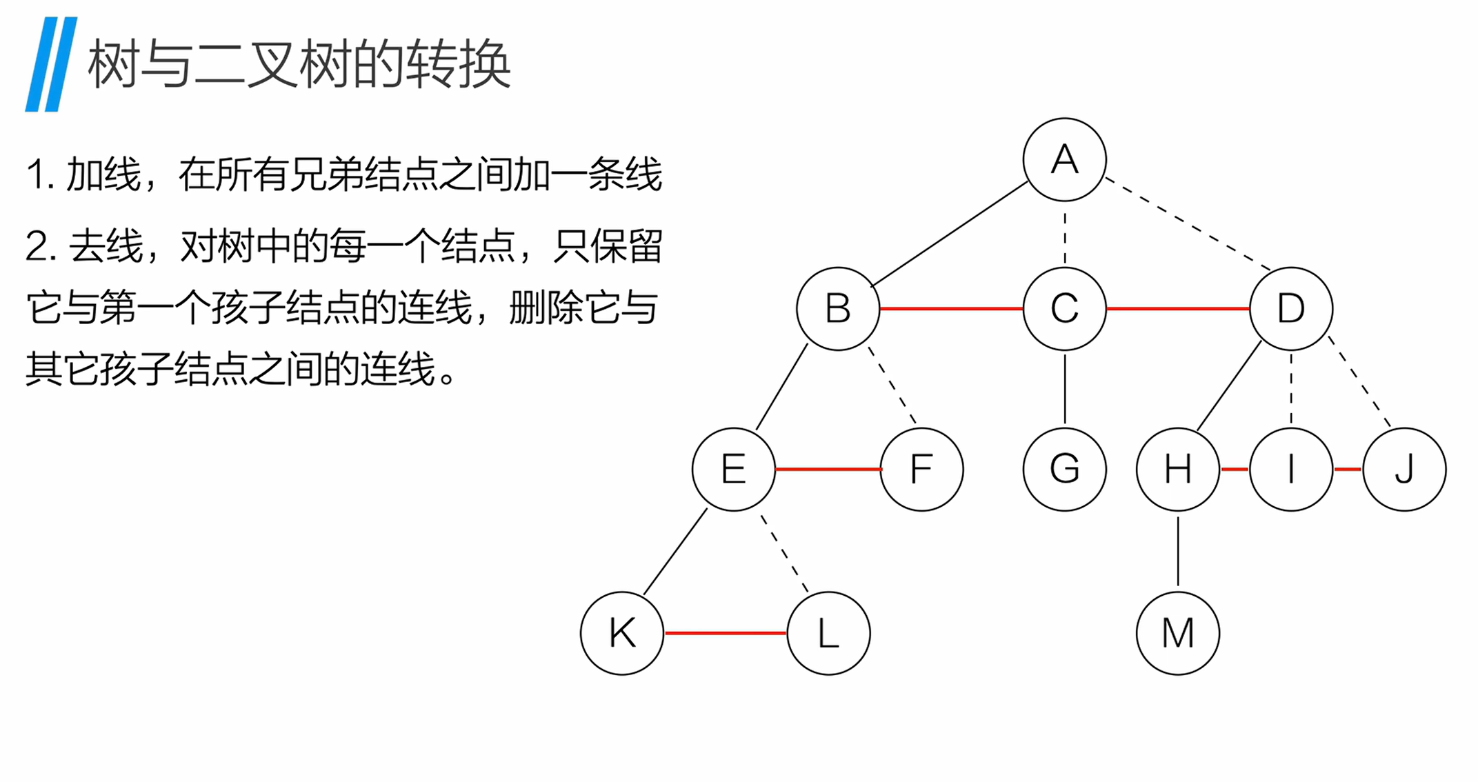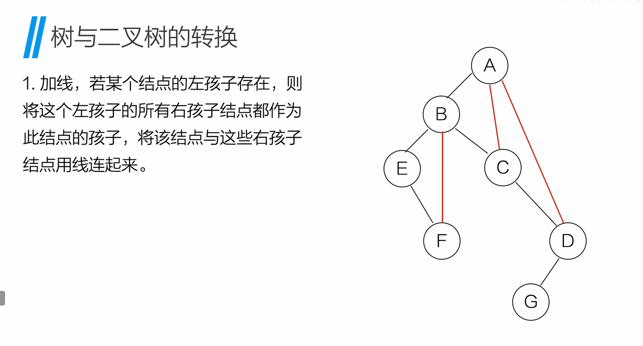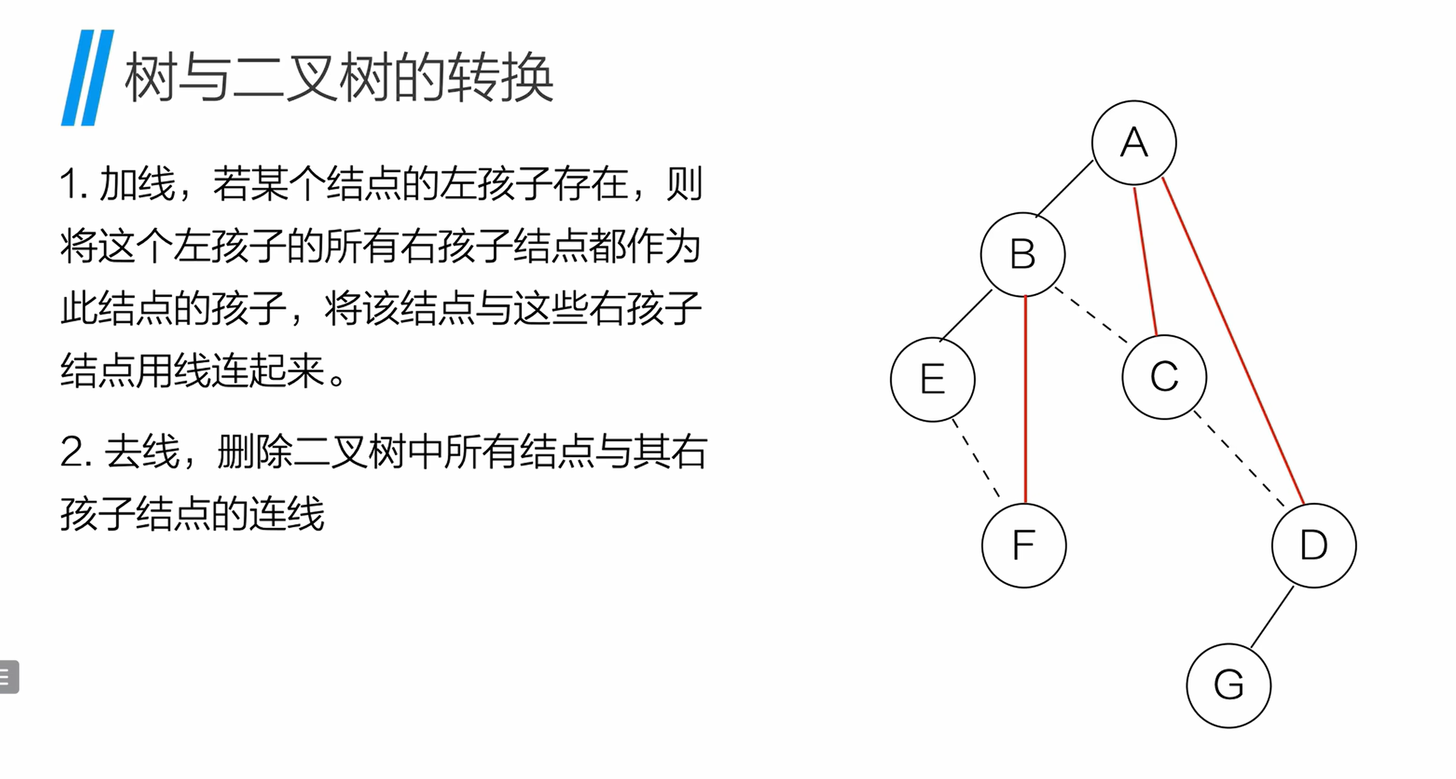 - 去线 :对每个节点,仅保留与第一个孩子的连线,删除与其他孩子的连线;