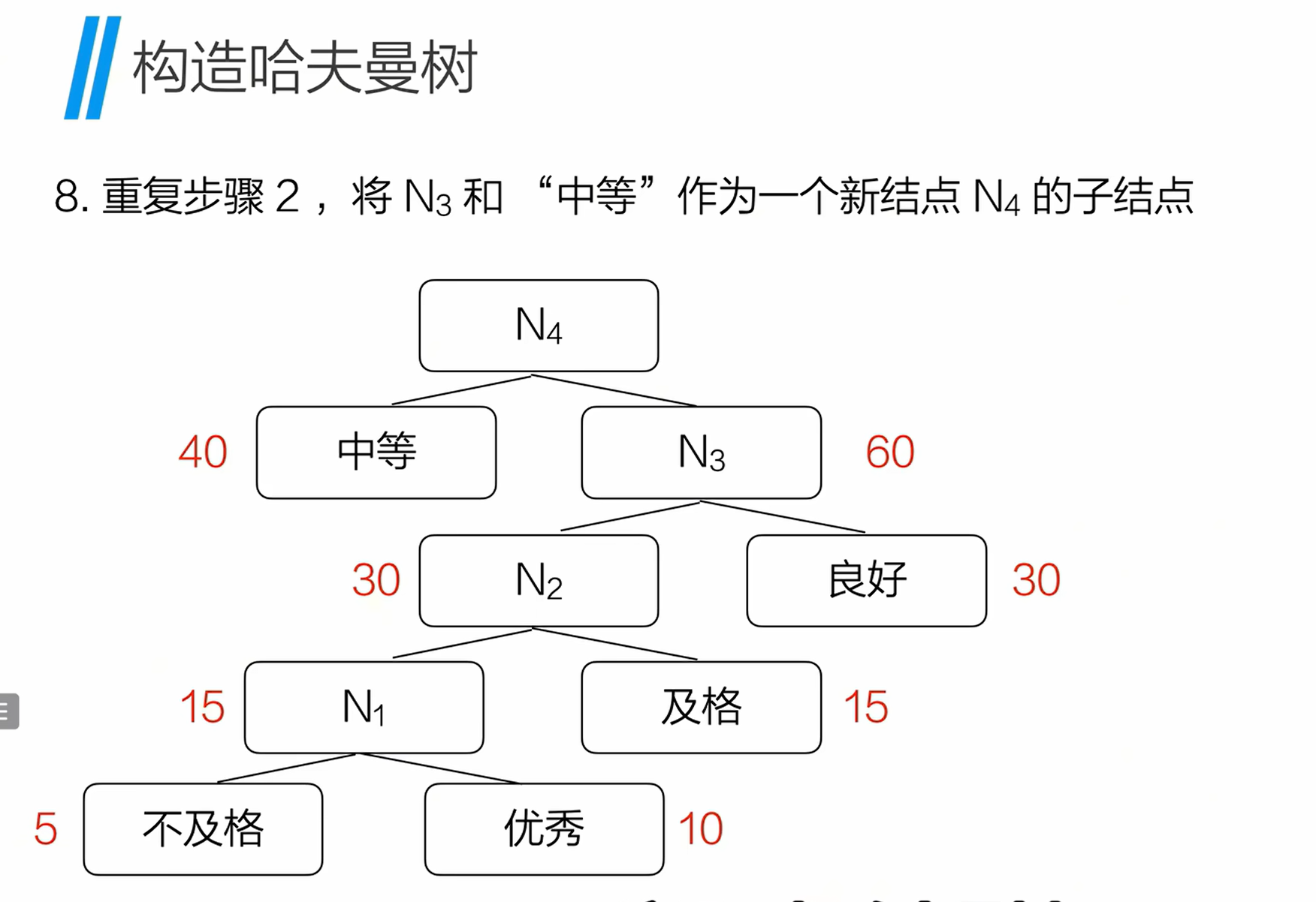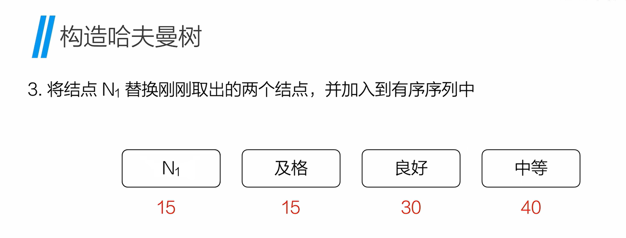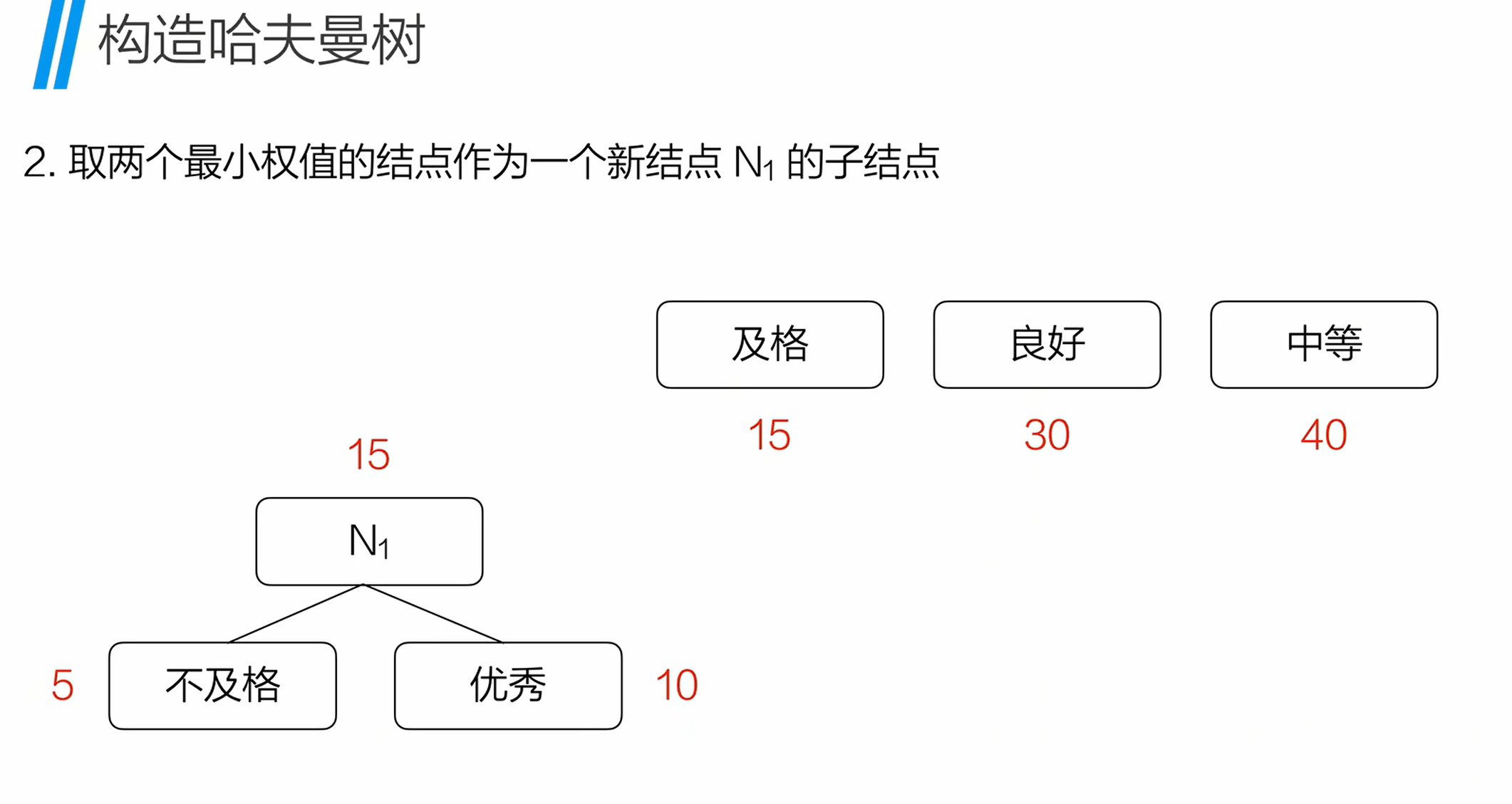 N₁替换取出的两个节点,新序列为:15(N₁)、15(及格)、30(良好)、40(中等); - 重复合并与更新 :