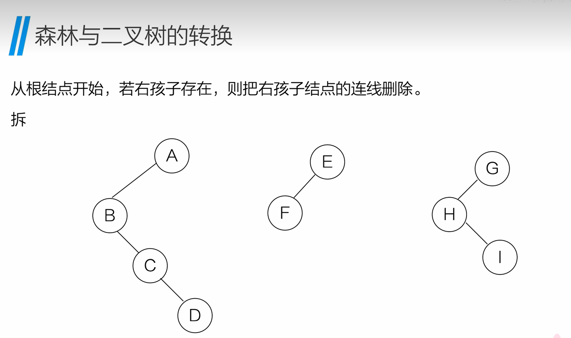 - 从根节点开始,若存在右孩子,则删除根节点与右孩子的连线,拆分出一棵新的二叉树;