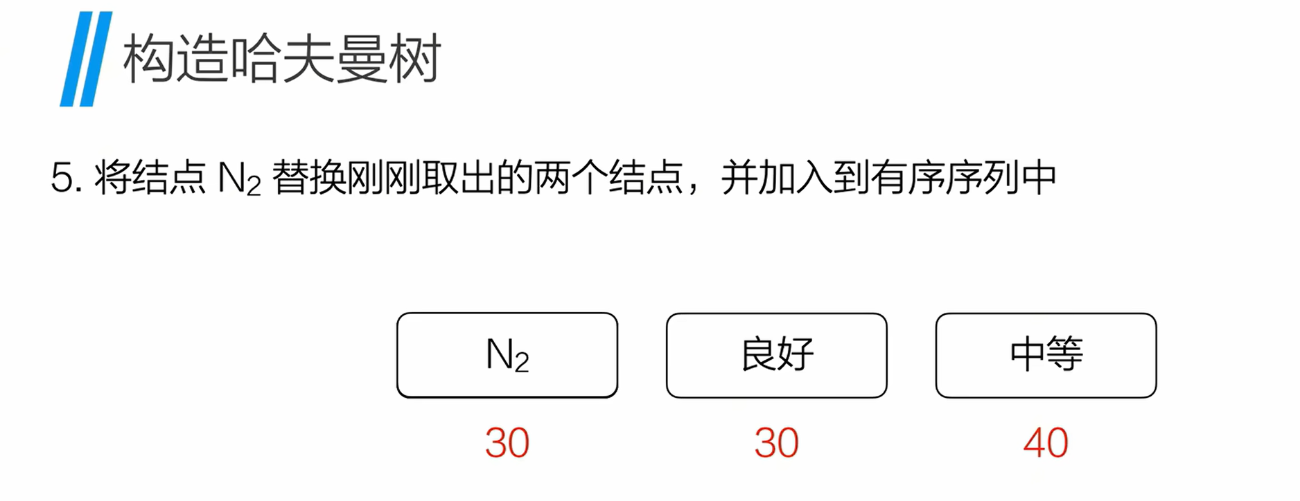 N₂(权值 30),更新序列为:30(N₂)、30(良好)、40(中等); - 取 30、30,合并为新节点