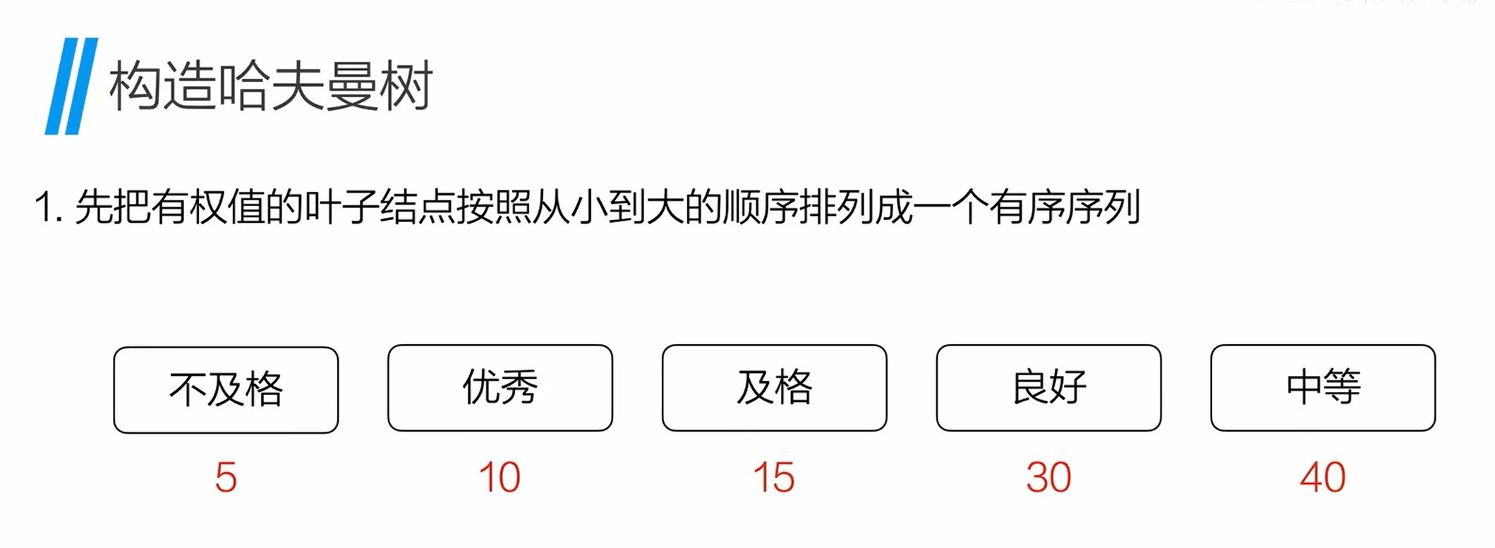 以权值为5(不及格)、10(优秀)、15(及格)、30(良好)、40(中等)的叶节点为例: