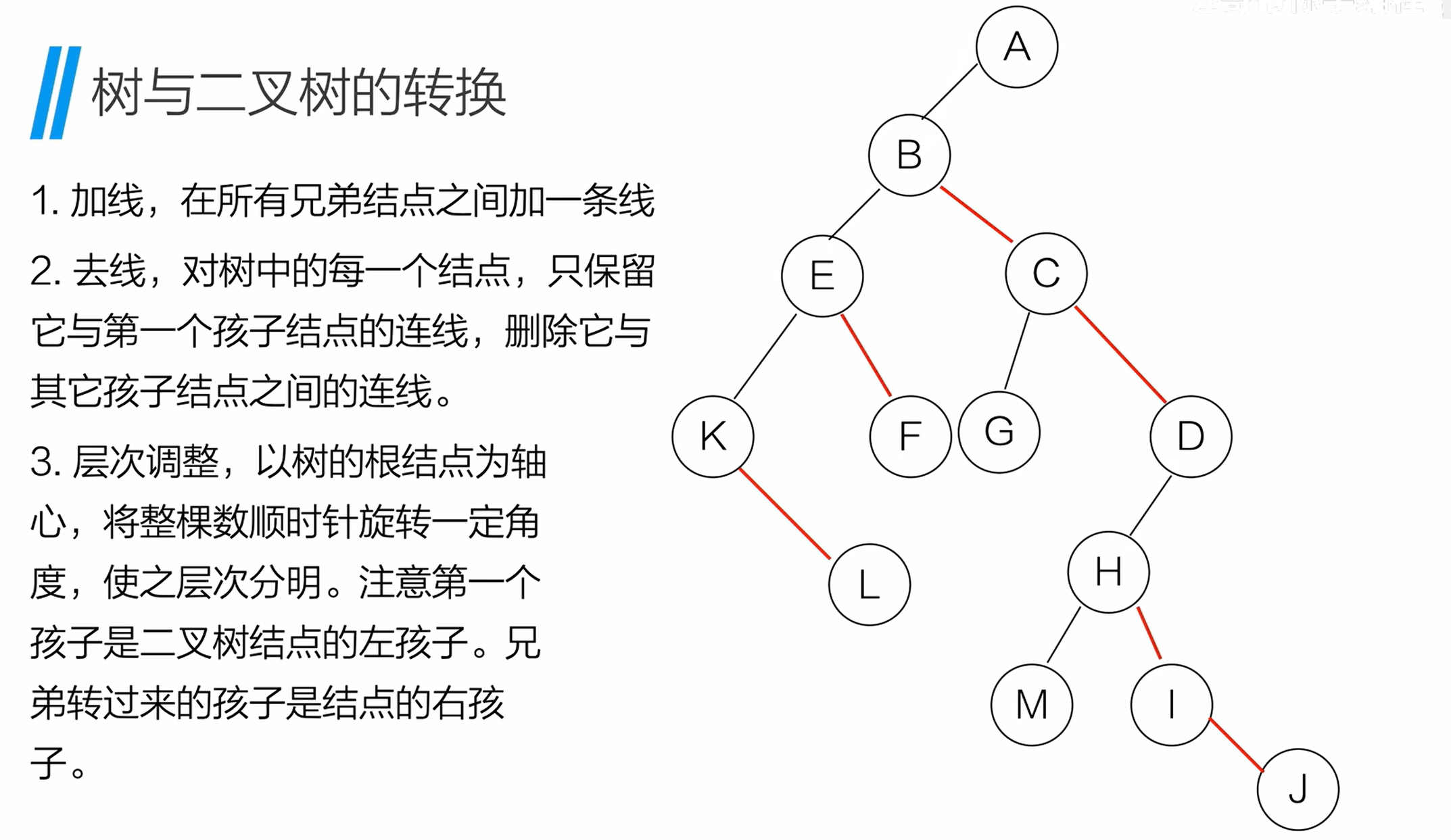 - 层次调整:以根节点为轴心,顺时针旋转树,使 "第一个孩子" 成为二叉树的左孩子,"兄弟节点" 成为右孩子。