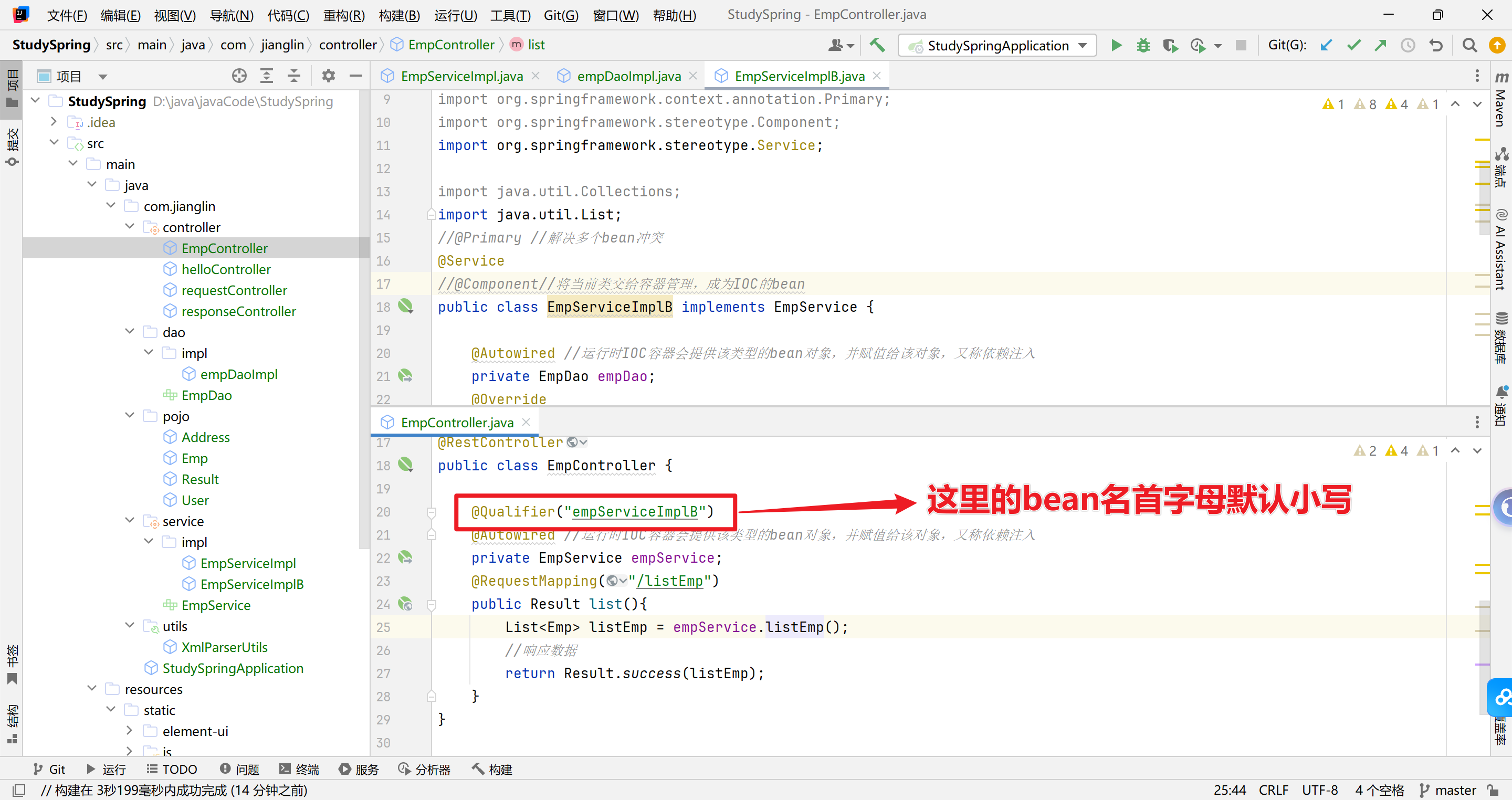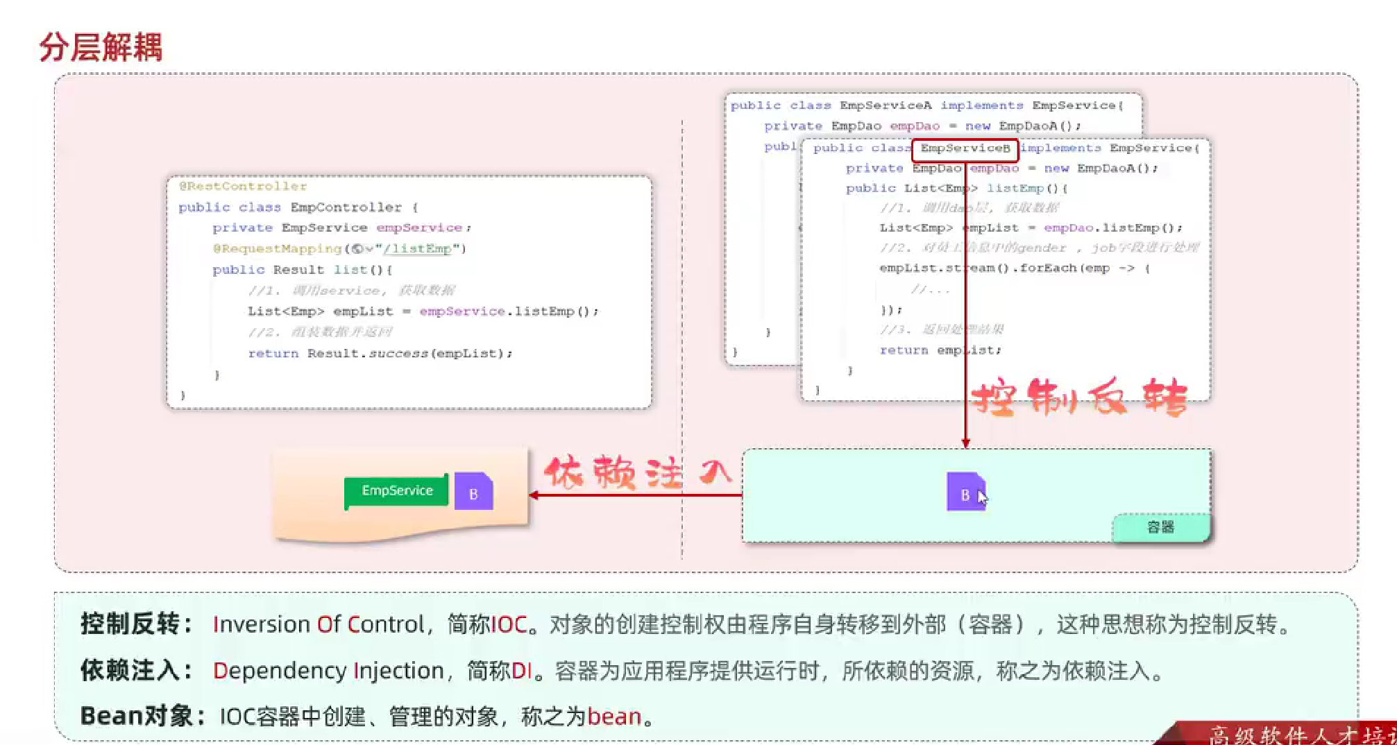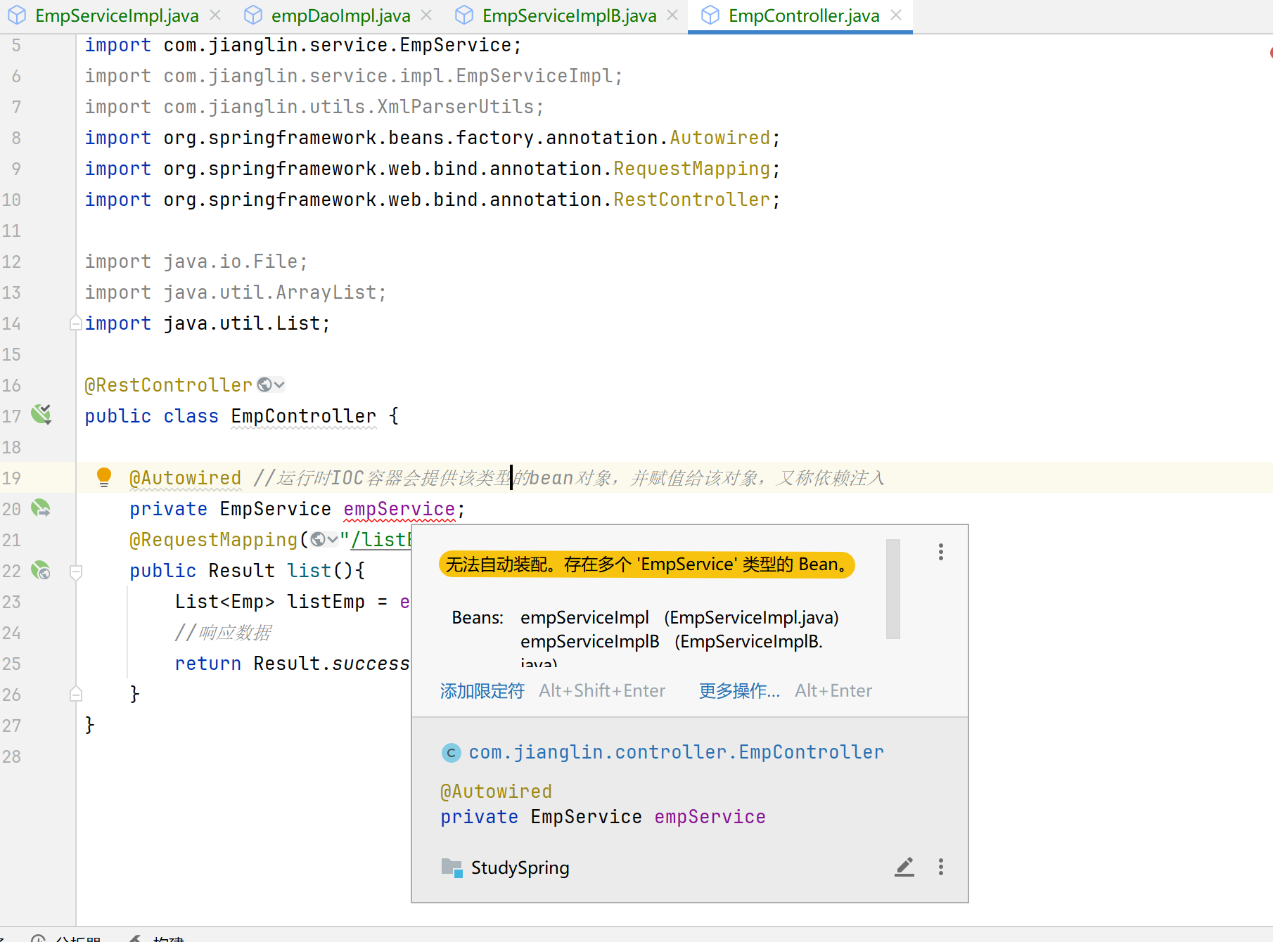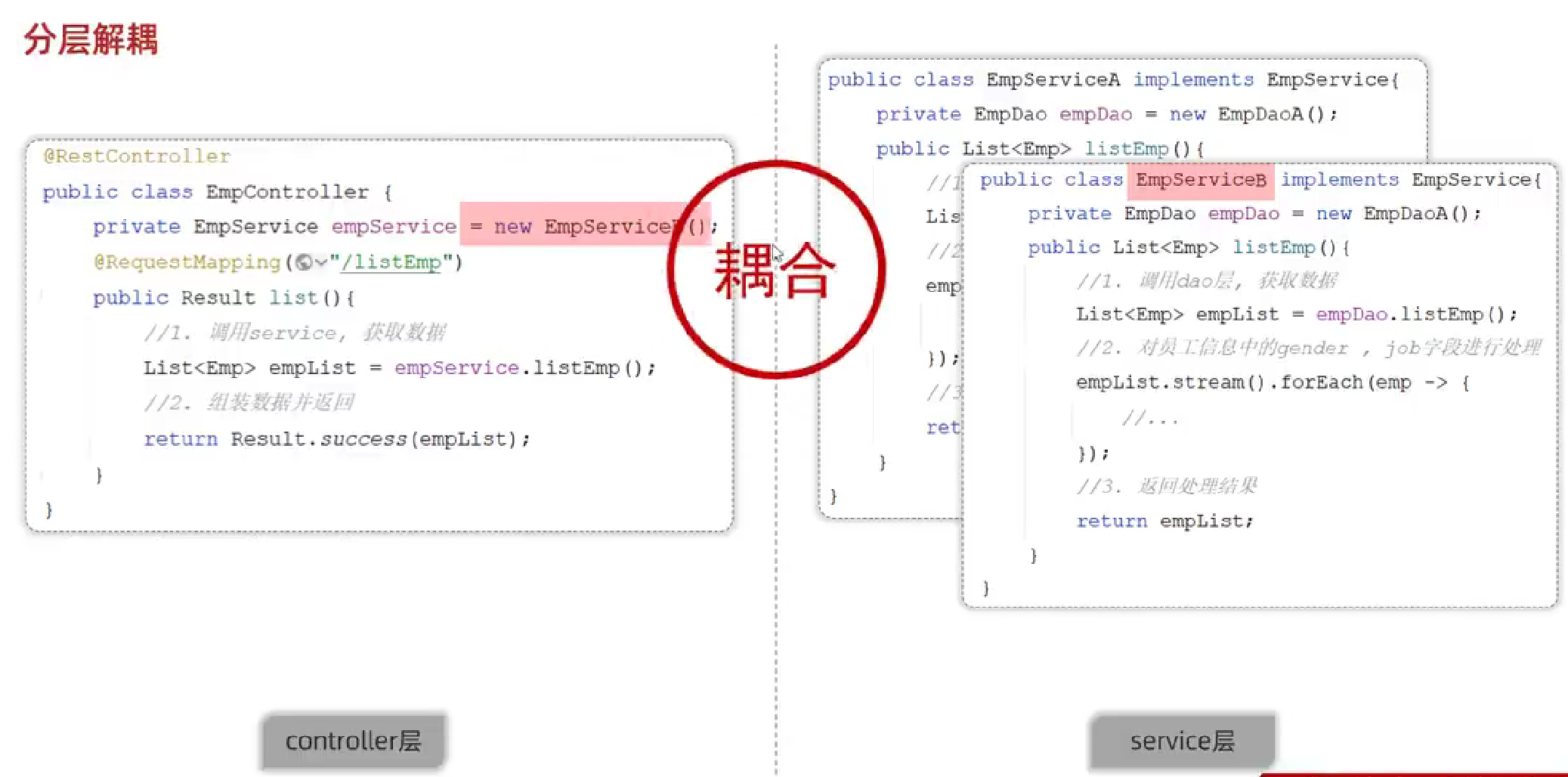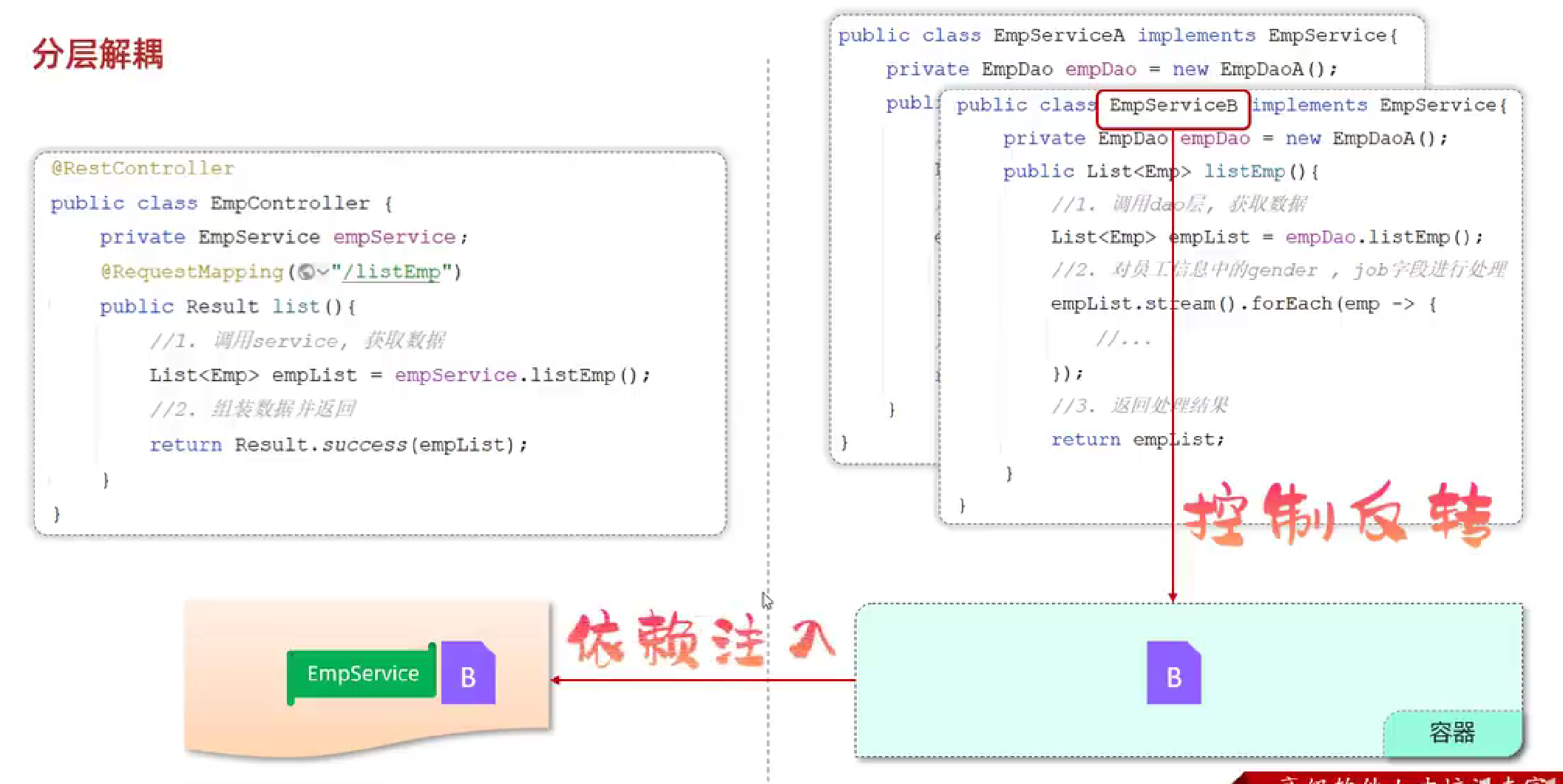 如果我们想要实现service层中的EmpServiceImplB的方法,则只需将该类添加@Component注解即可,并将EmpServiceImpl的注解给去掉,这样我们不用去修改其它层(eg,EmpController)的代码,因为容器会自动扫描注解,创建类,从而达到解耦的目的。