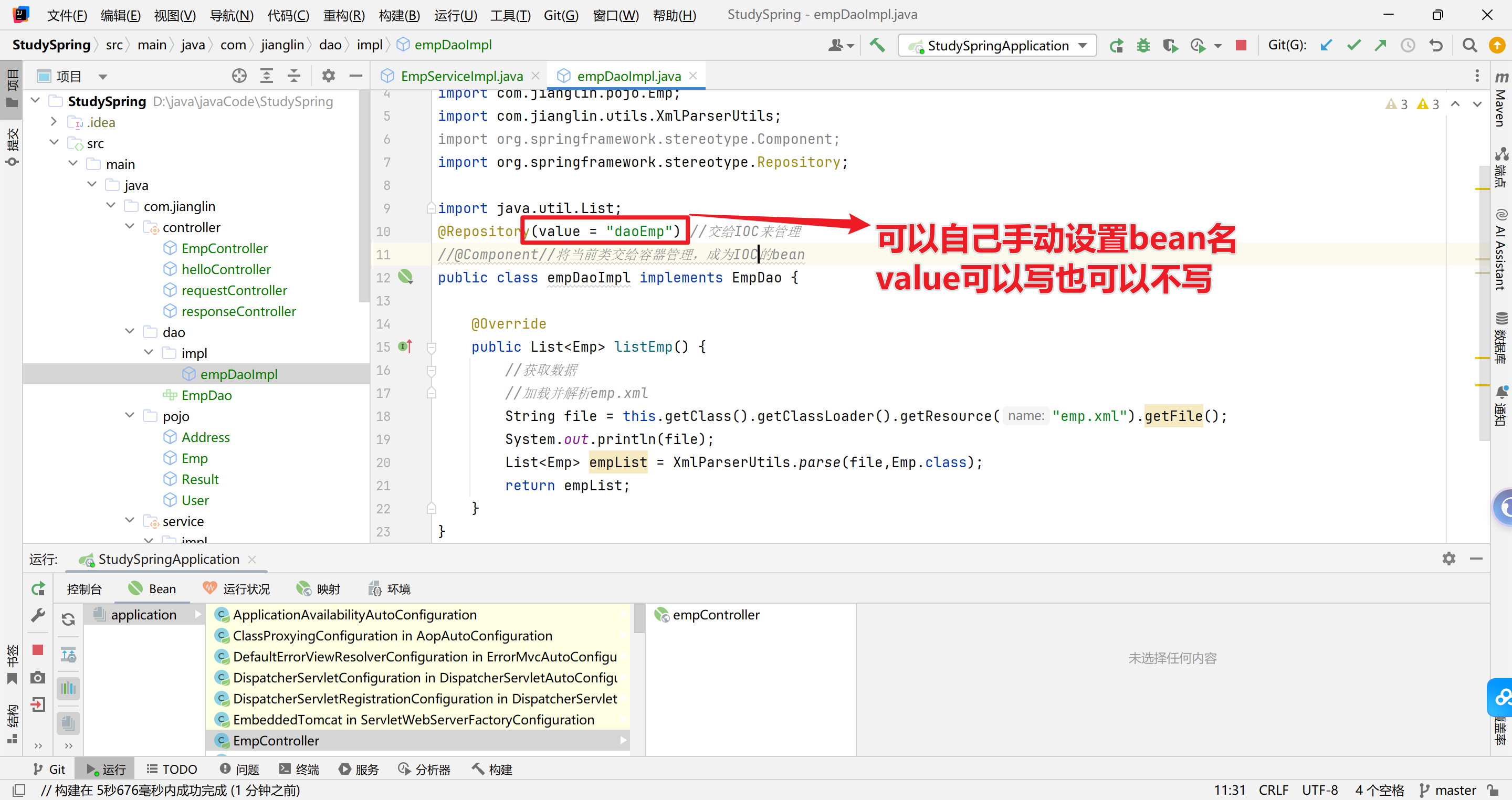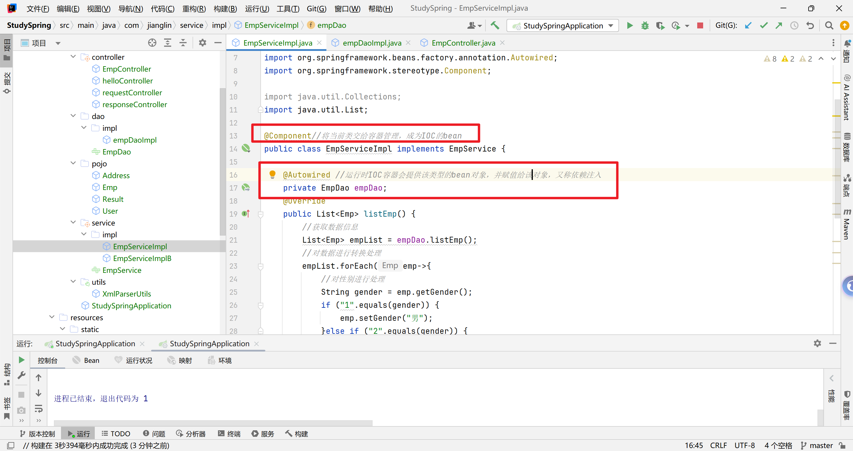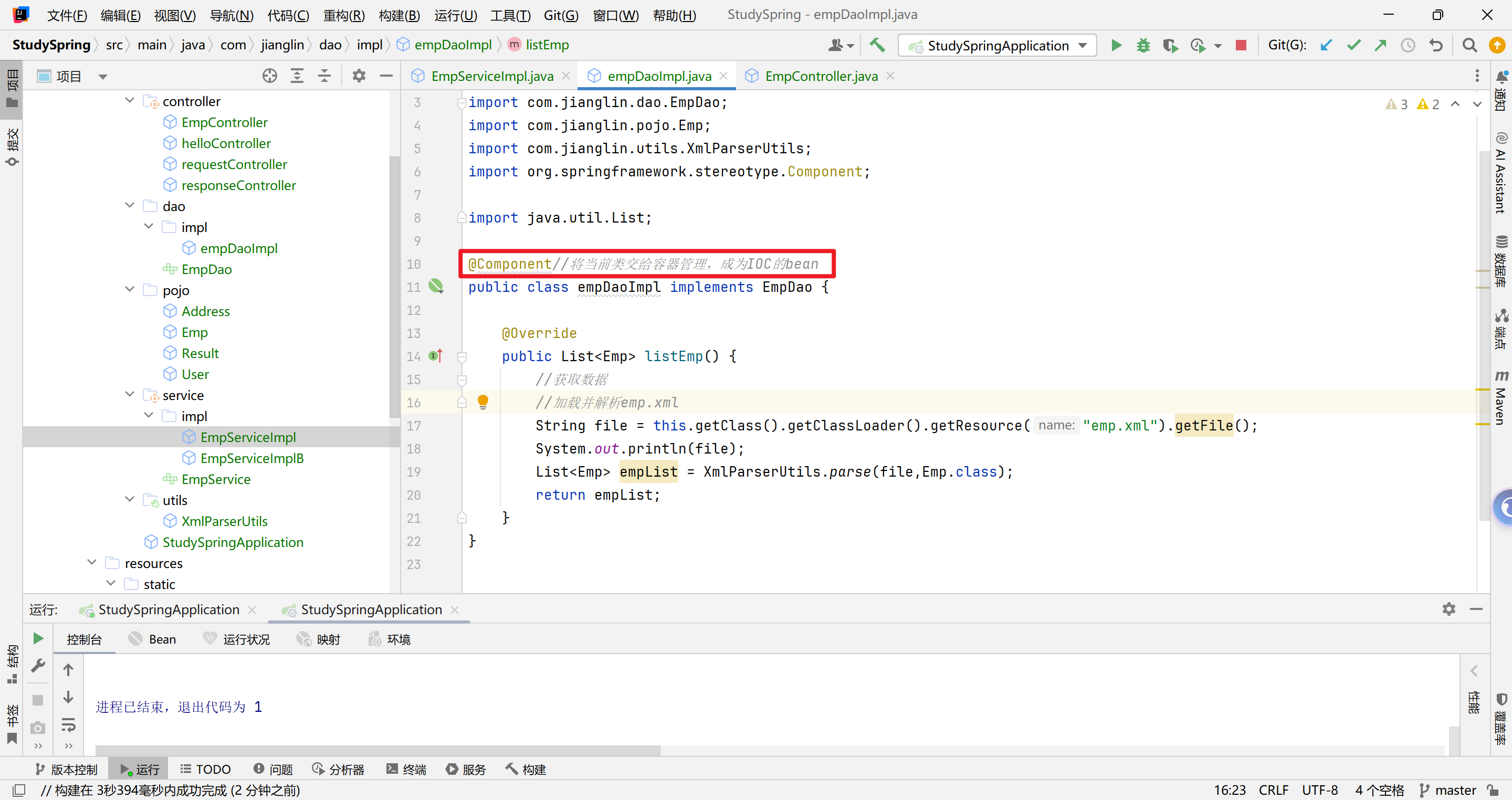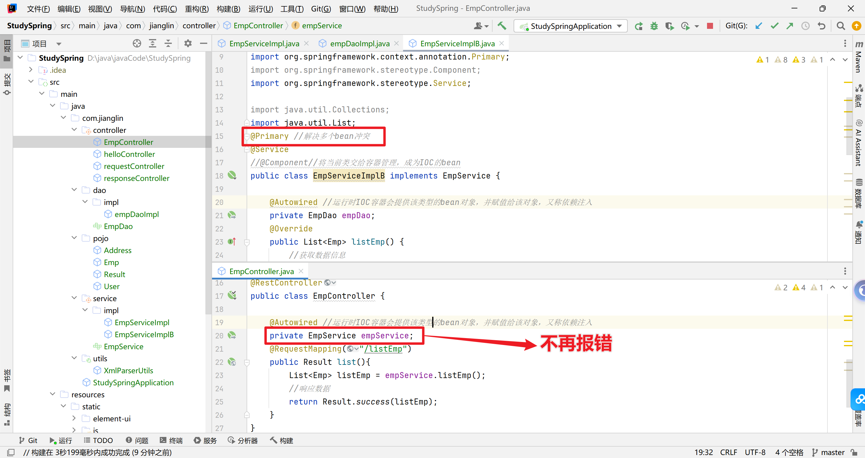 如果我们想要实现service层中的EmpServiceImplB的方法,则只需将该类添加@Component注解即可,并将EmpServiceImpl的注解给去掉,这样我们不用去修改其它层(eg,EmpController)的代码,因为容器会自动扫描注解,创建类,从而达到解耦的目的。