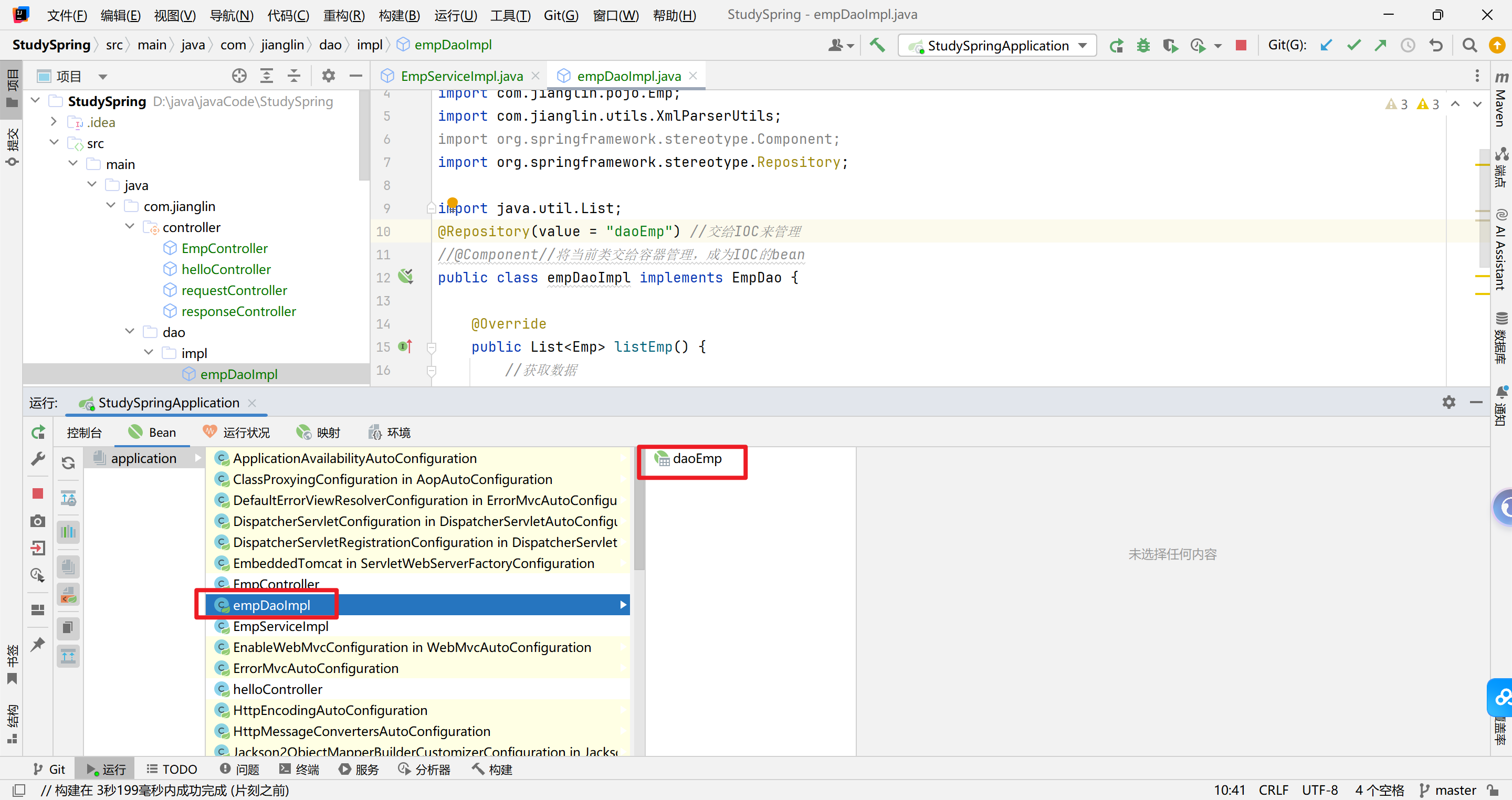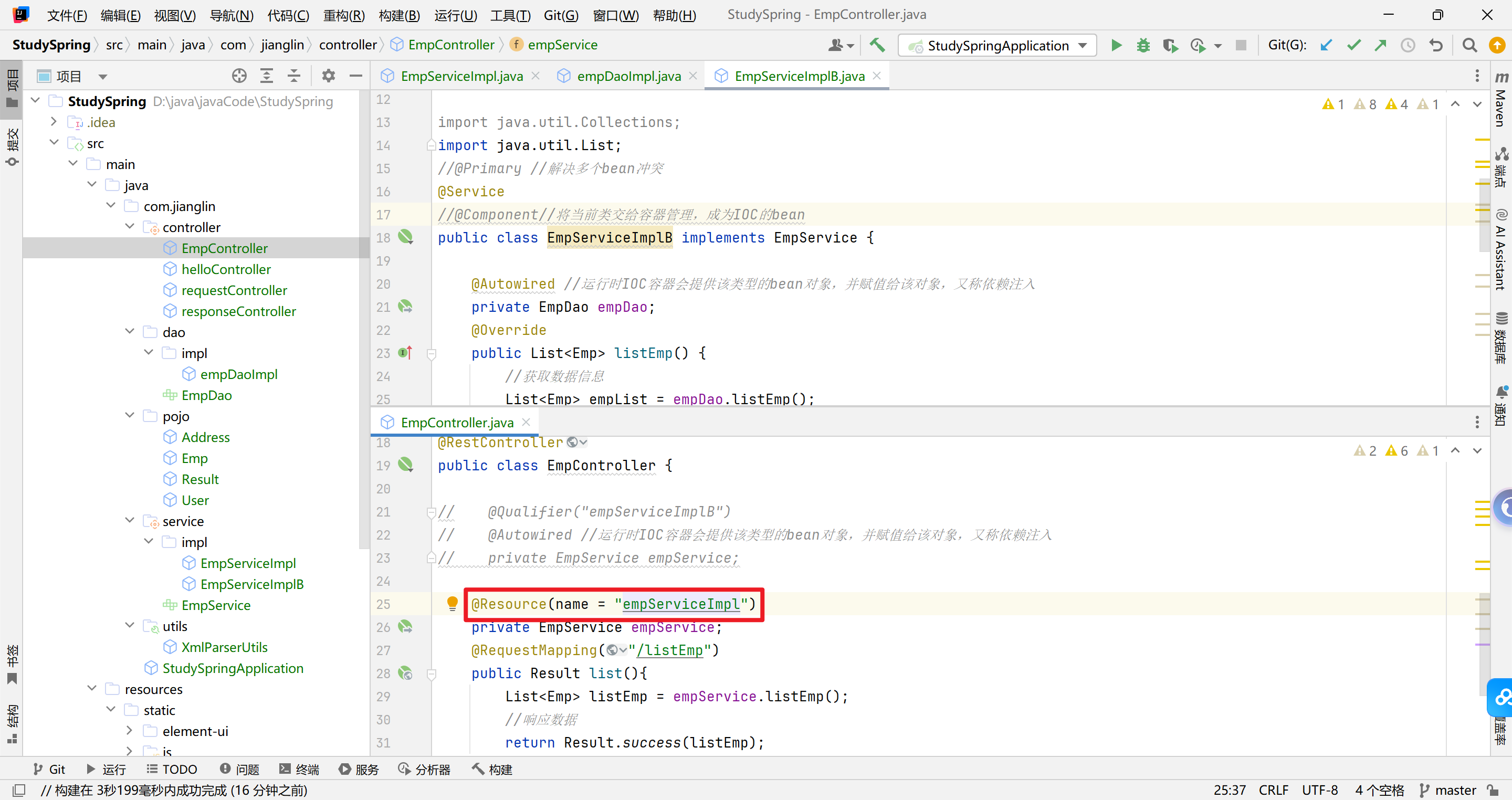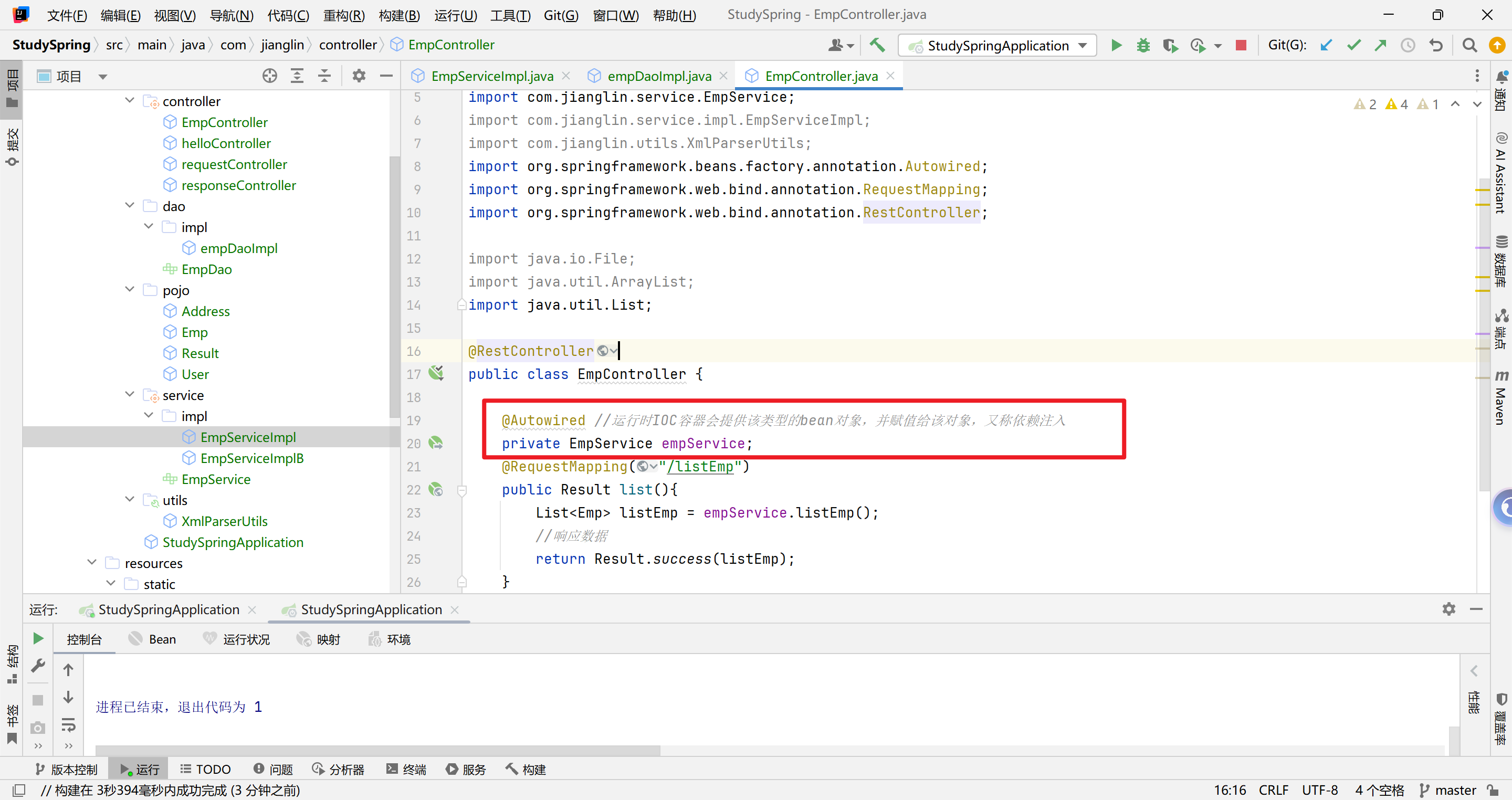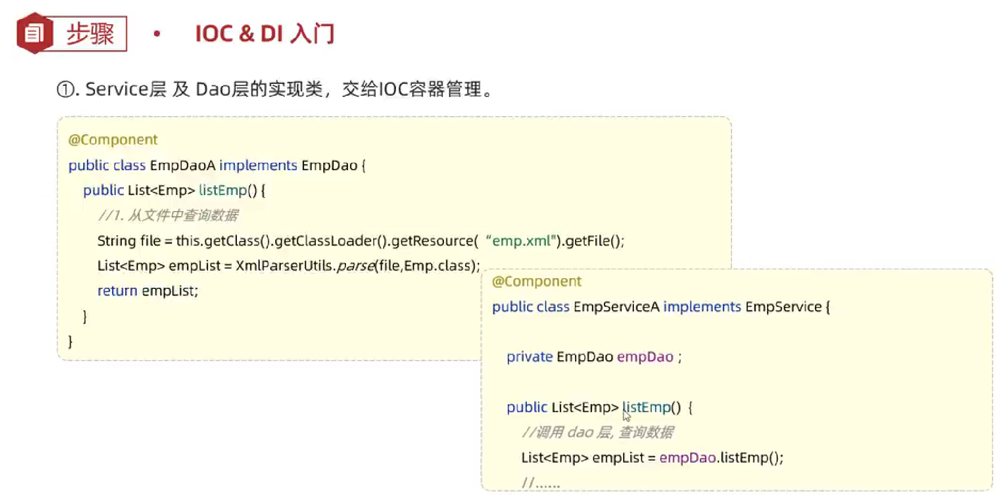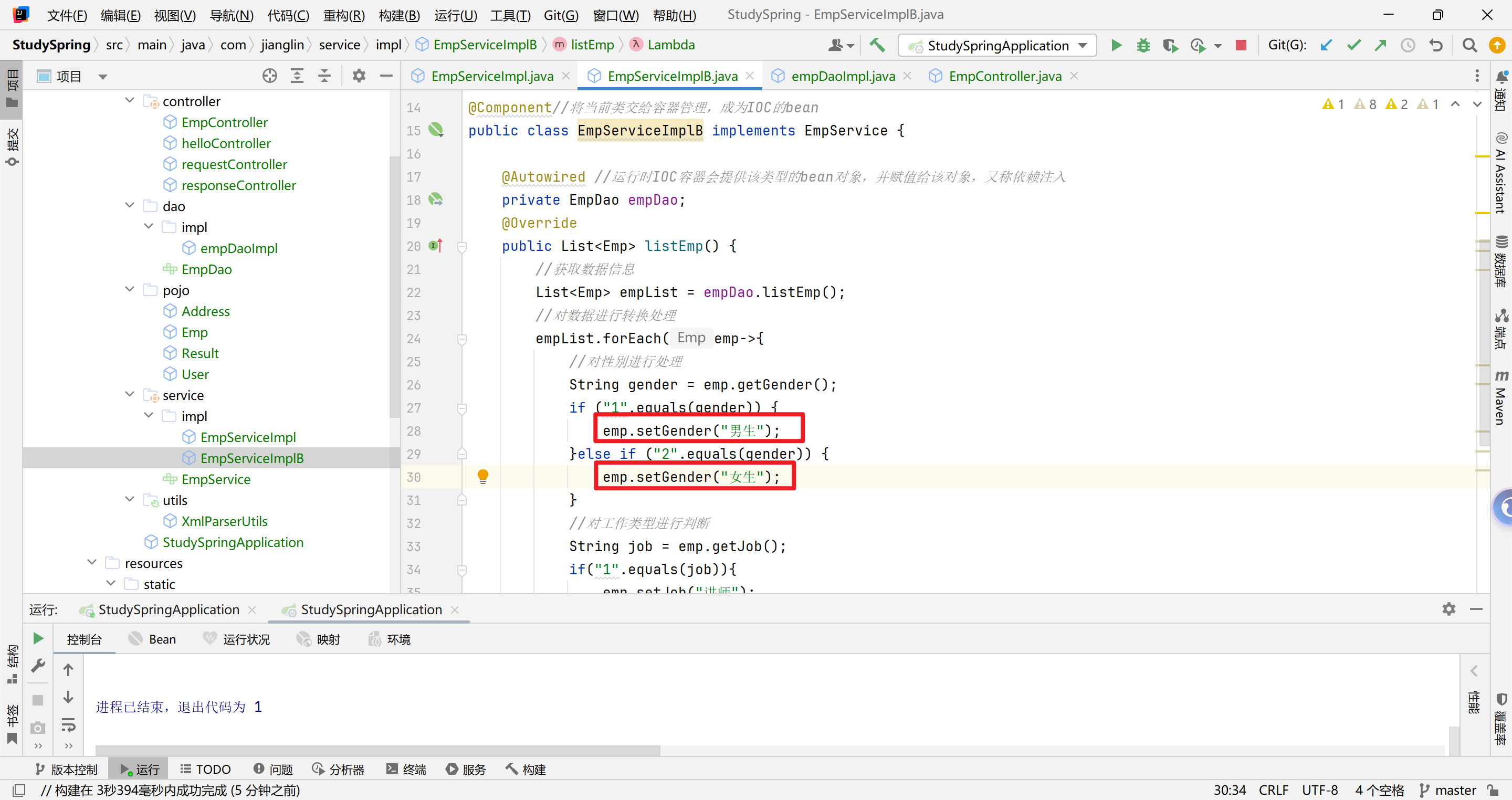 如果我们想要实现service层中的EmpServiceImplB的方法,则只需将该类添加@Component注解即可,并将EmpServiceImpl的注解给去掉,这样我们不用去修改其它层(eg,EmpController)的代码,因为容器会自动扫描注解,创建类,从而达到解耦的目的。