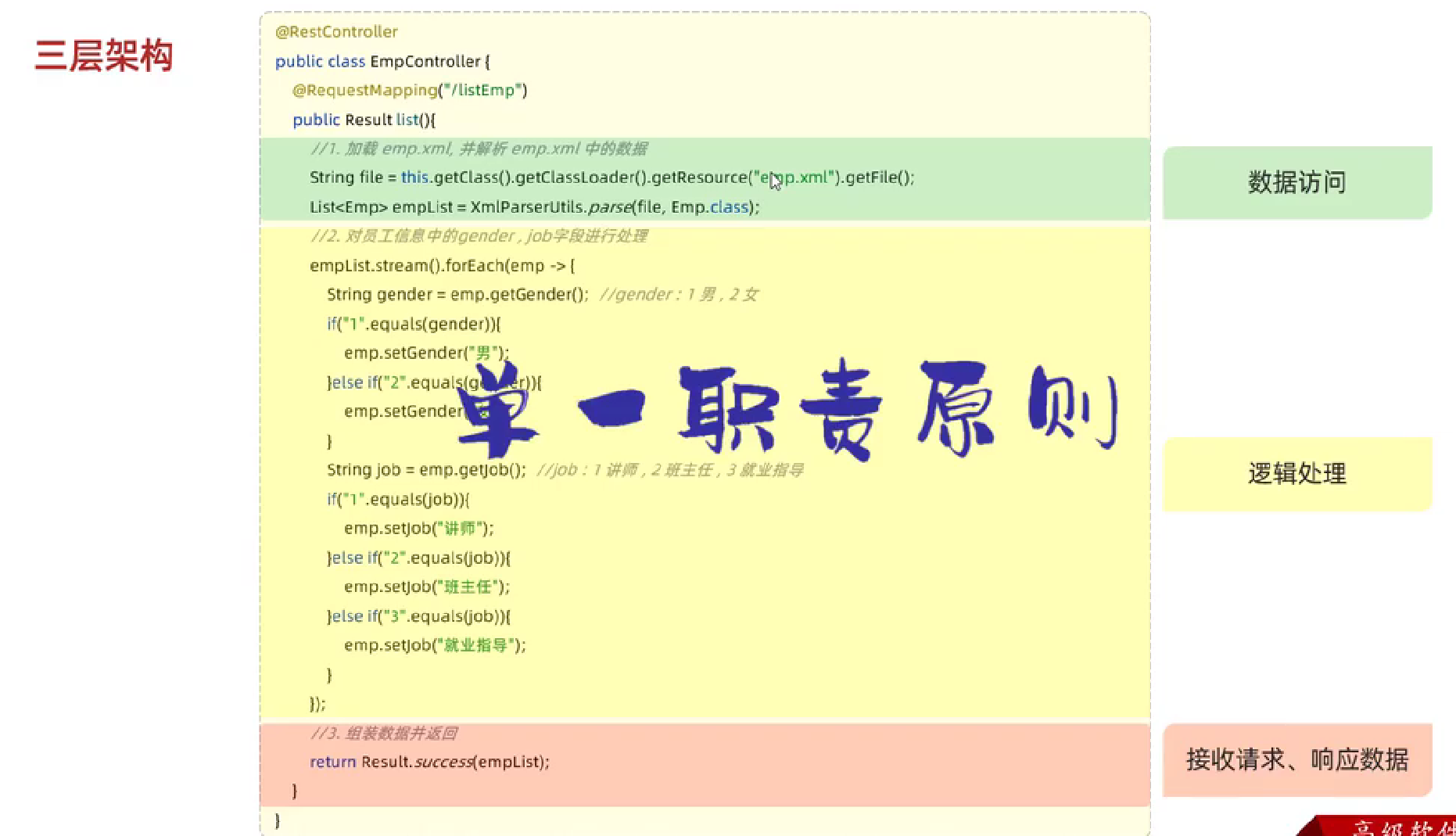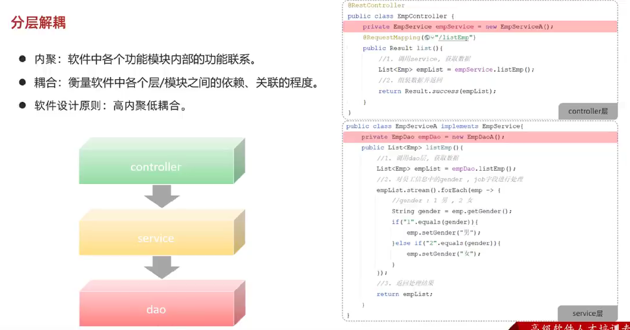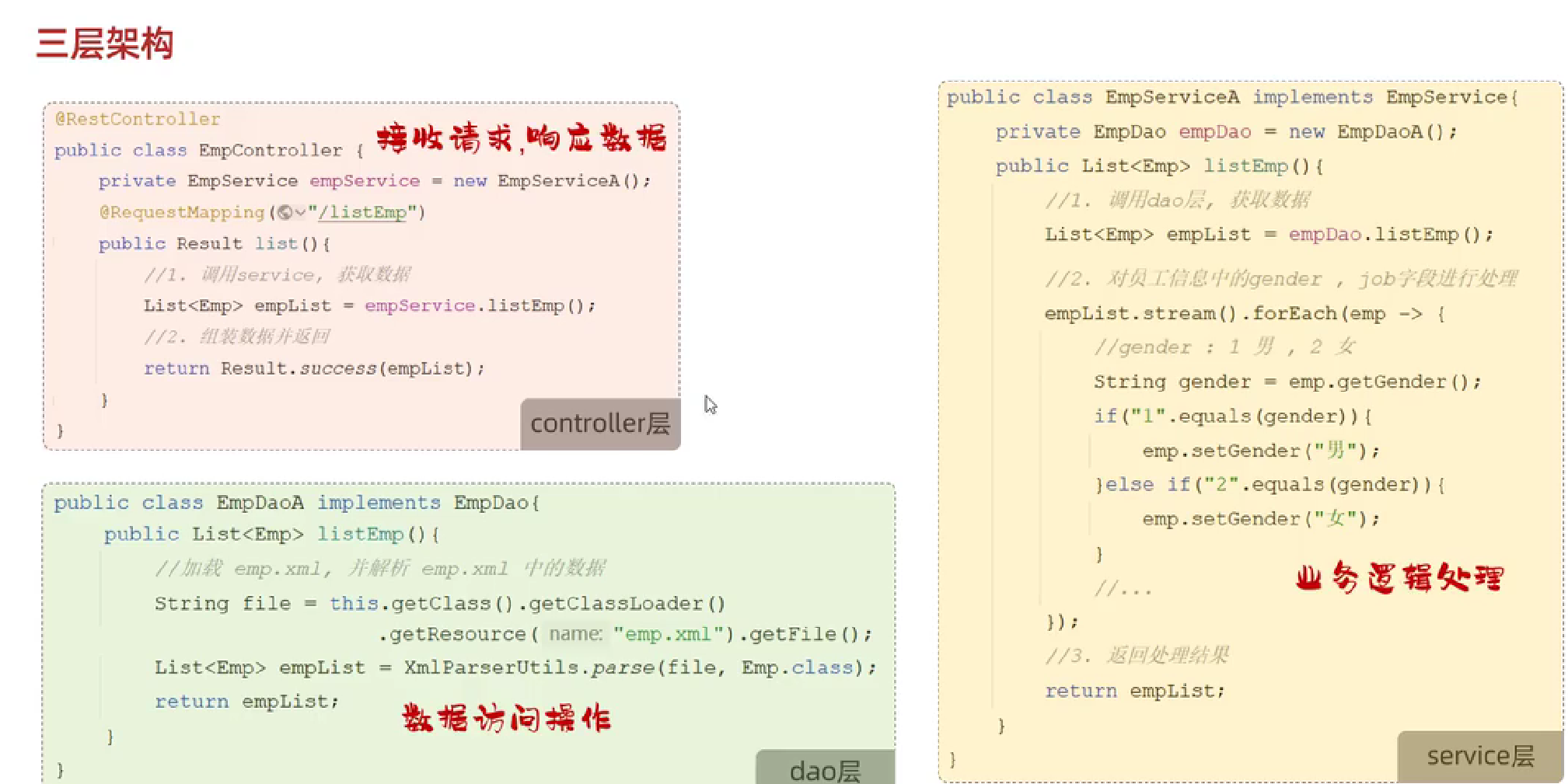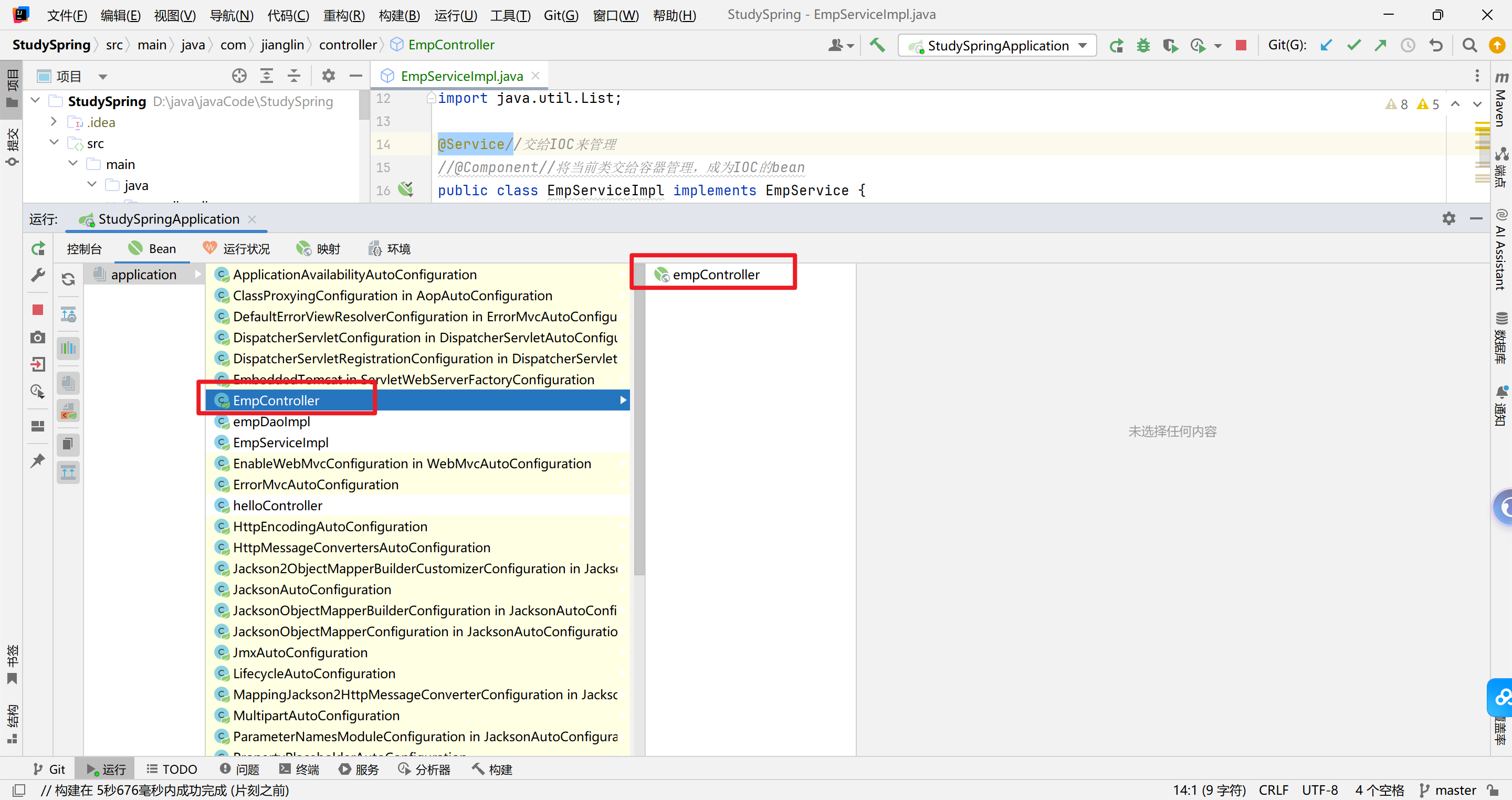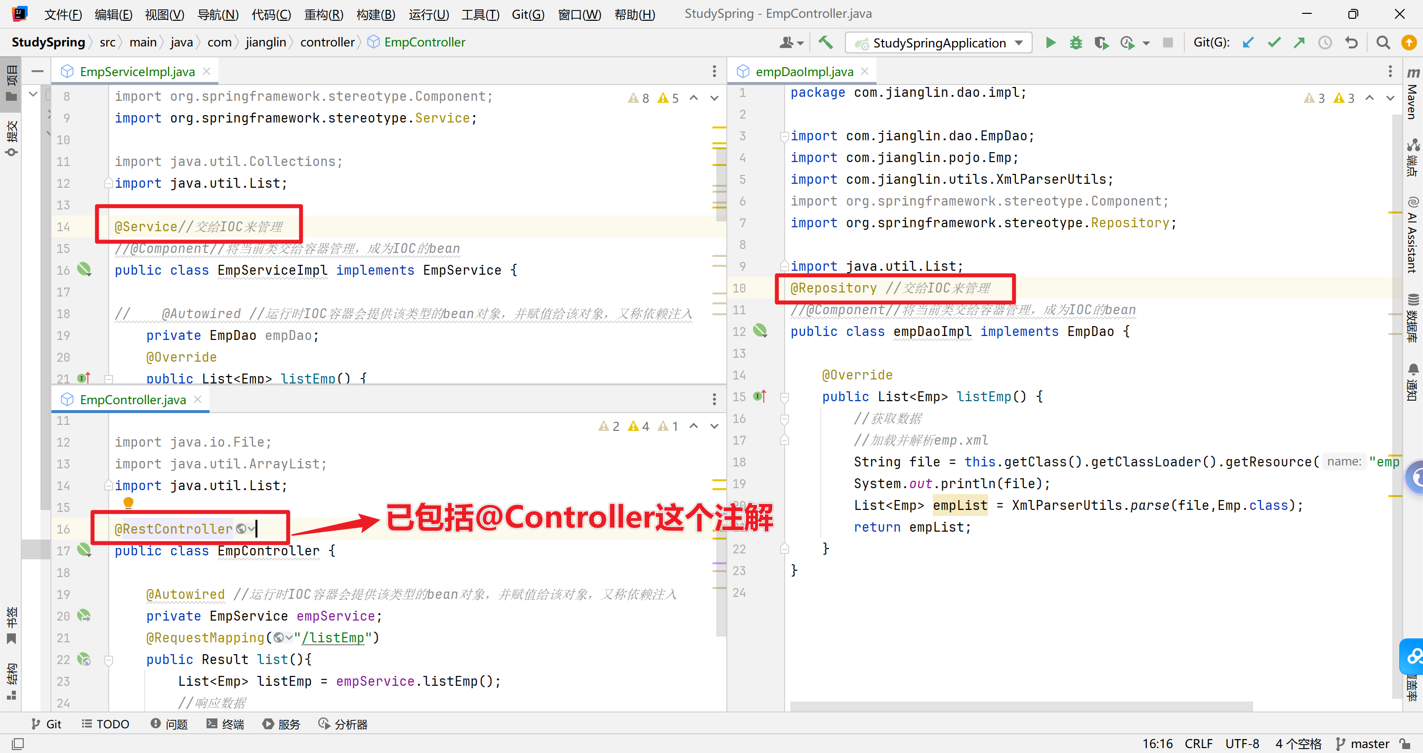 如果我们想要实现service层中的EmpServiceImplB的方法,则只需将该类添加@Component注解即可,并将EmpServiceImpl的注解给去掉,这样我们不用去修改其它层(eg,EmpController)的代码,因为容器会自动扫描注解,创建类,从而达到解耦的目的。