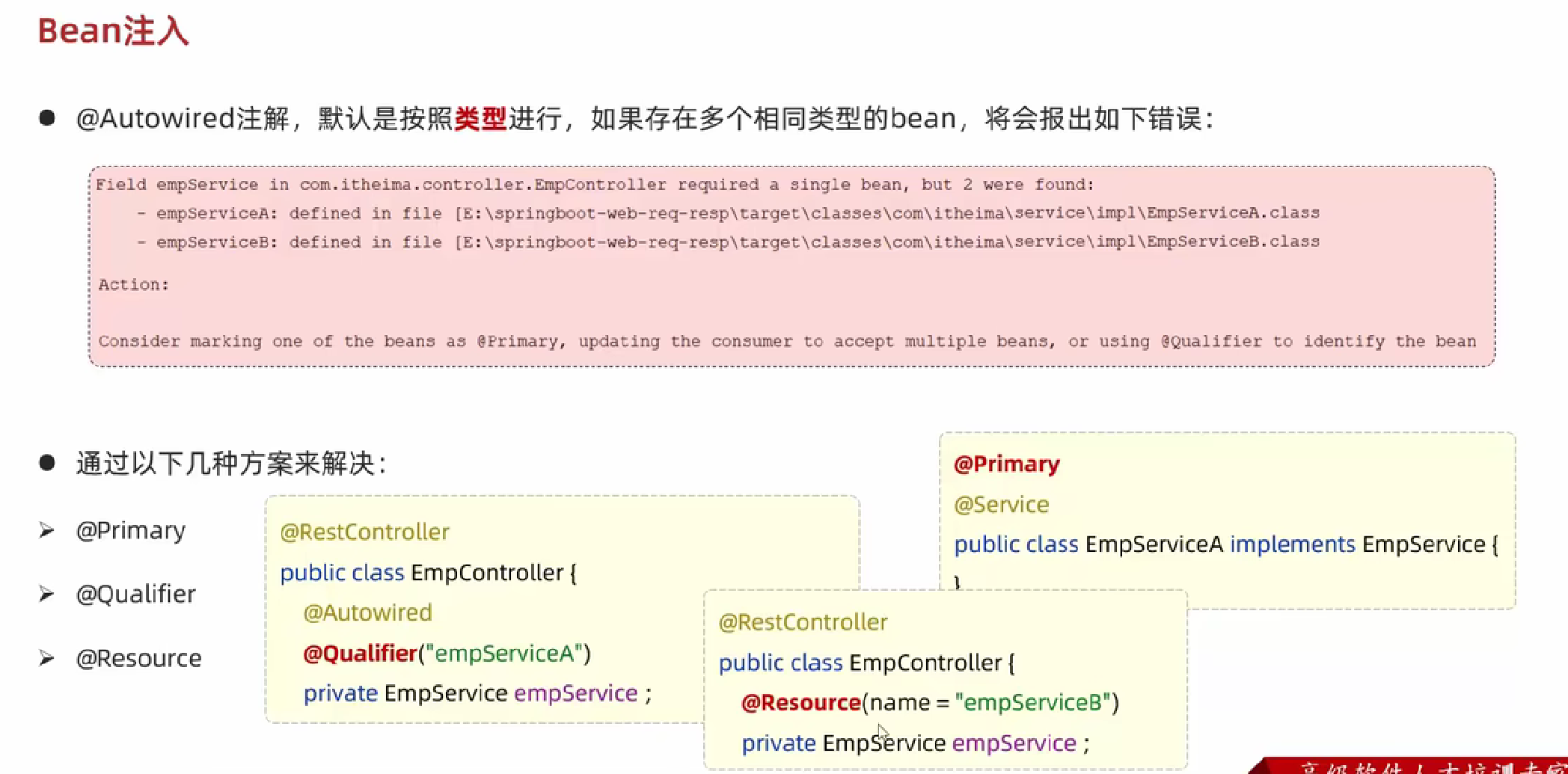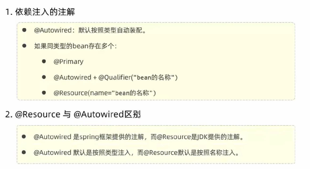 resource注解来指定我要注入的是哪个beab,指定bean的名字,那Autowired的这个注解呢,默认是按照类型进行注入的,而resource这个注解是按照名称进行注入的
