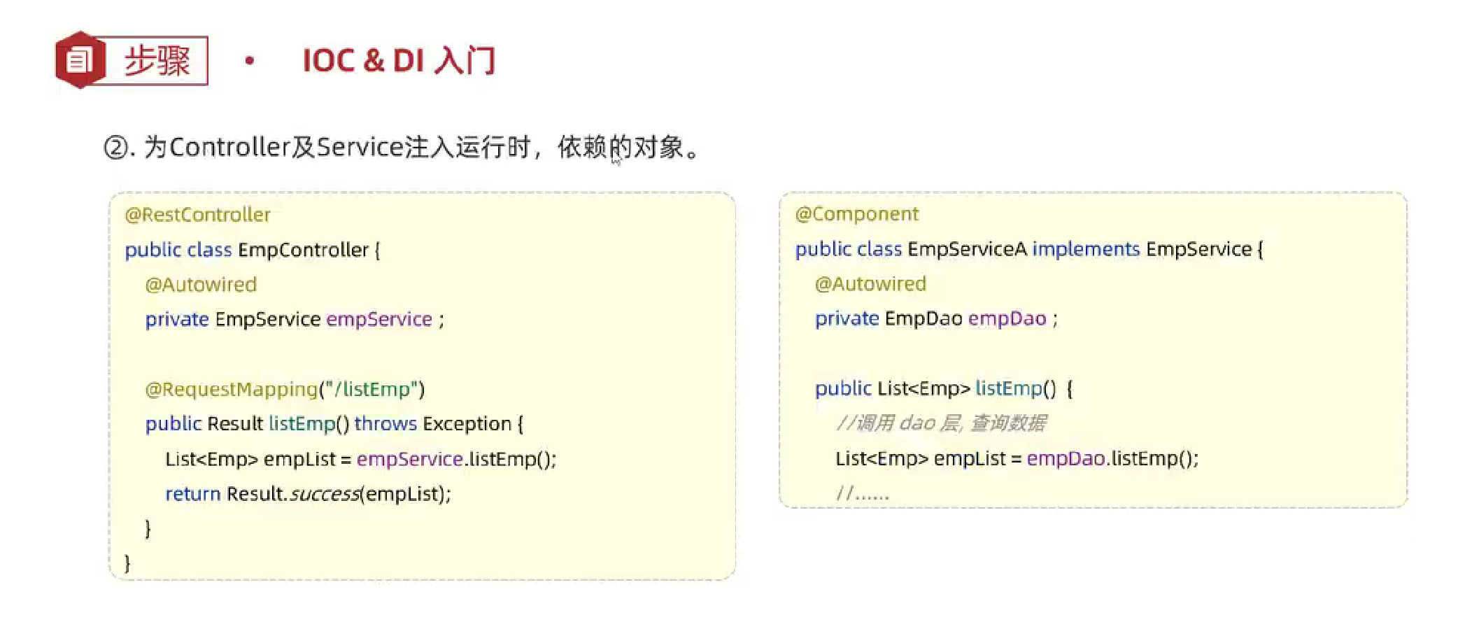 @Autowired //运行时IOC容器会提供该类型的bean对象,并赋值给该对象,又称依赖注入