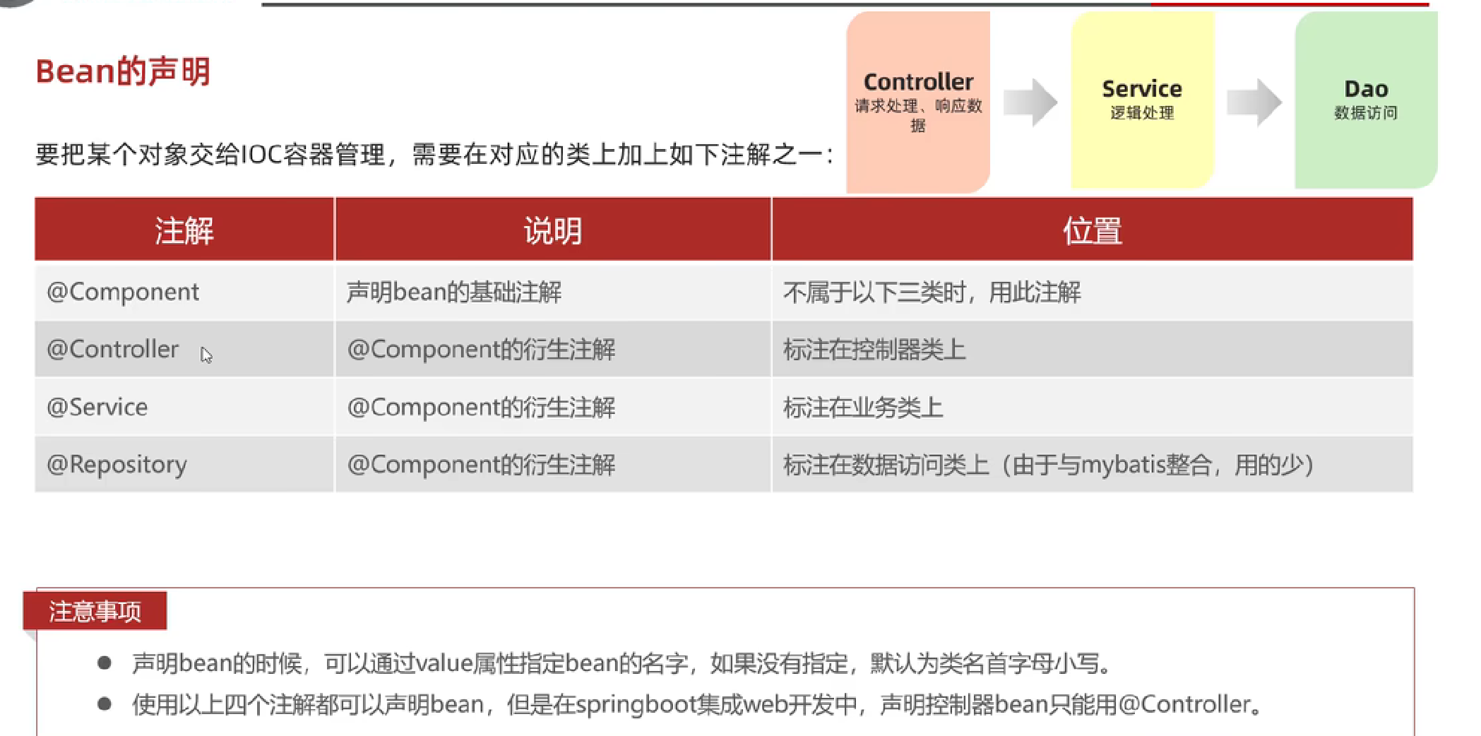 可指定bean的名字,当未设置时,默认是该类的第一个字母小写的类名
