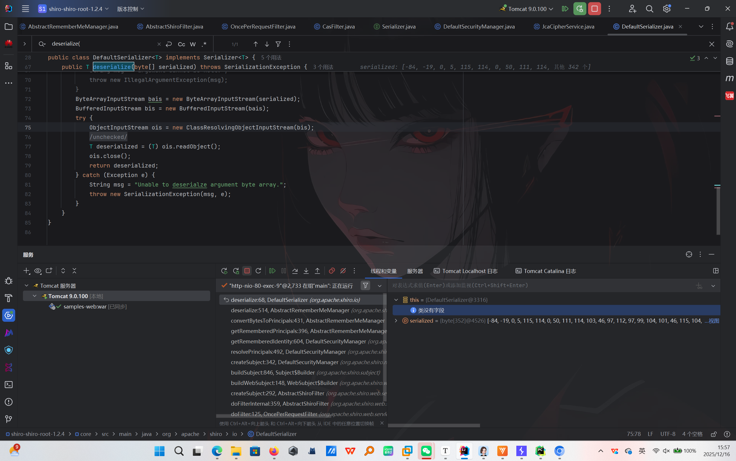 继续跟,发现DefaultSerializer类的deserialize方法开始执行反序列化
