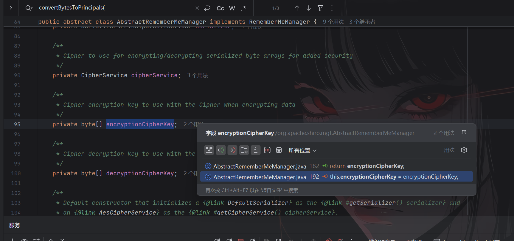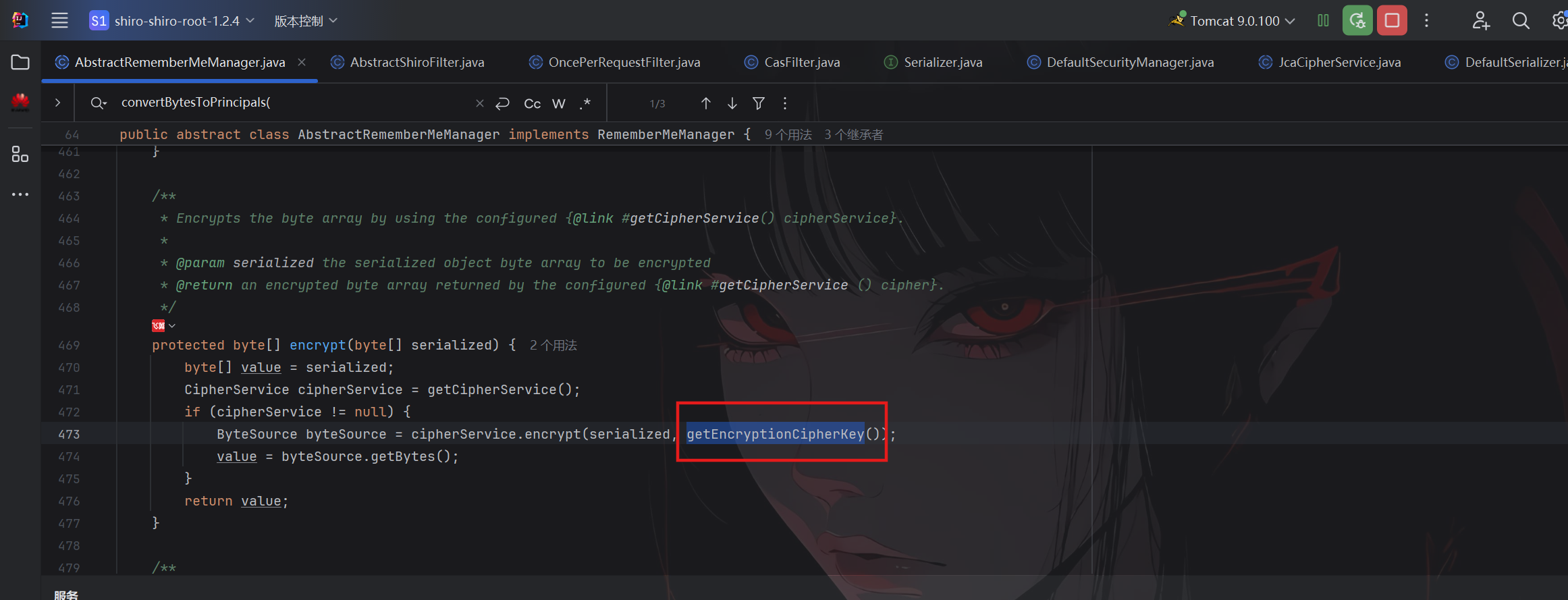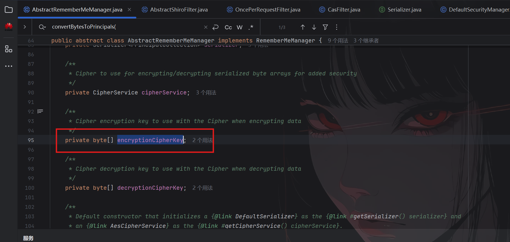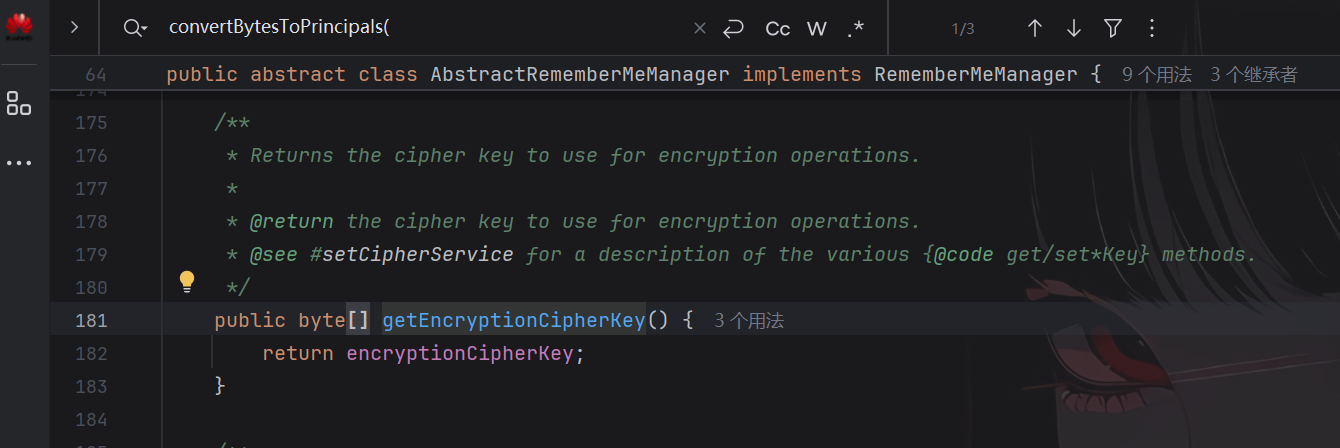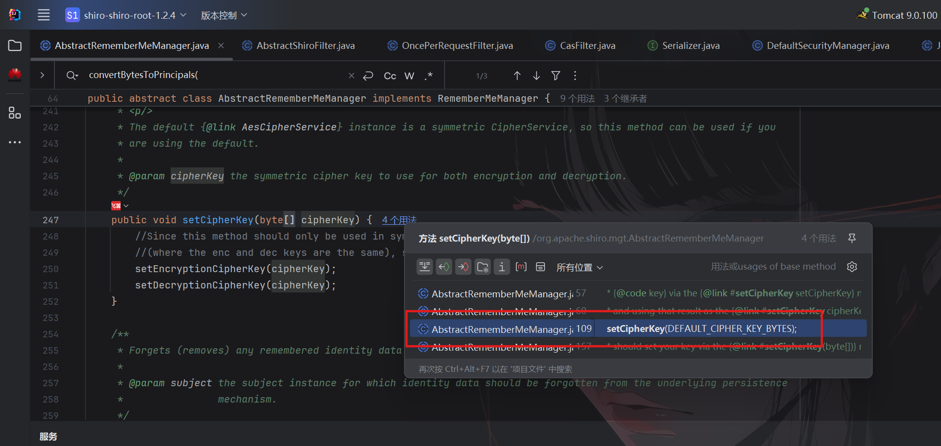选择AbstractRememberMeManager类,可以发现key来源于getEncryptionCipherKey()方法