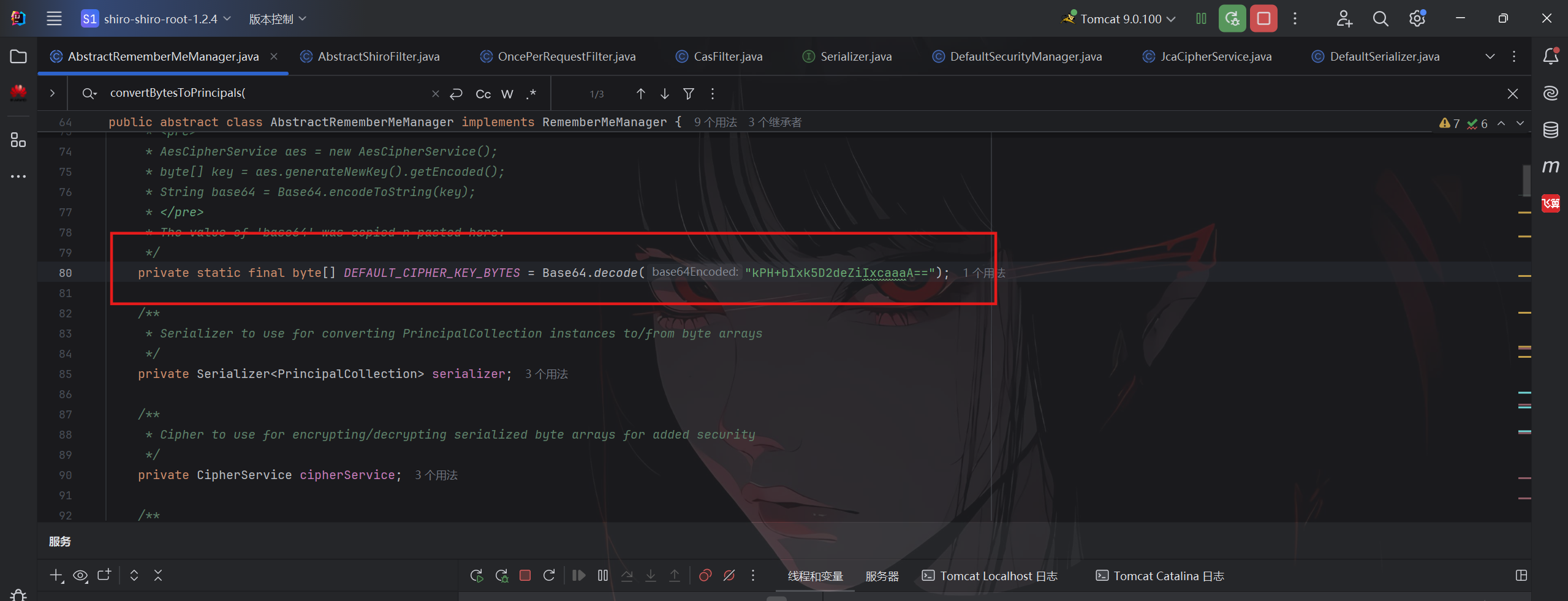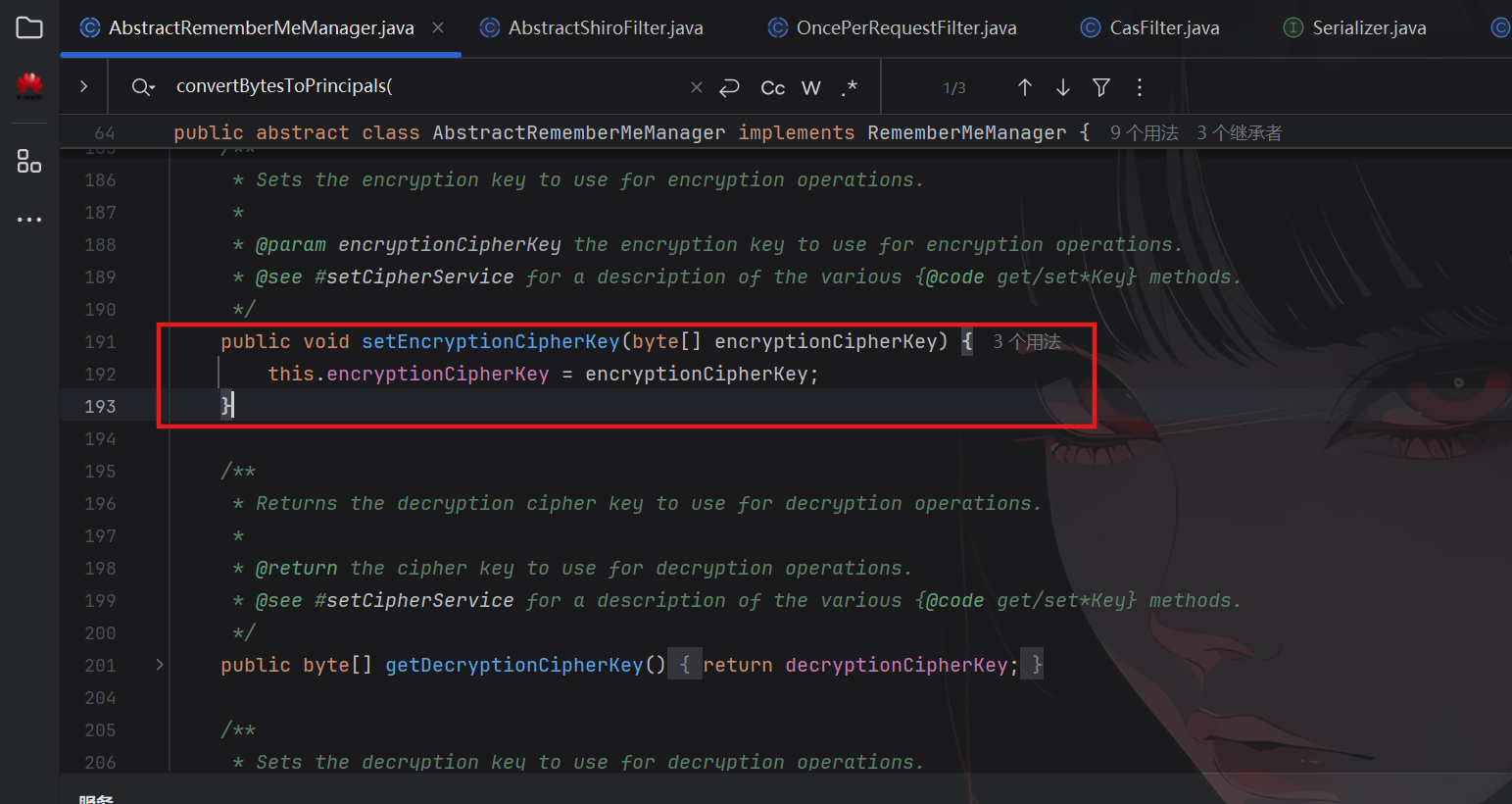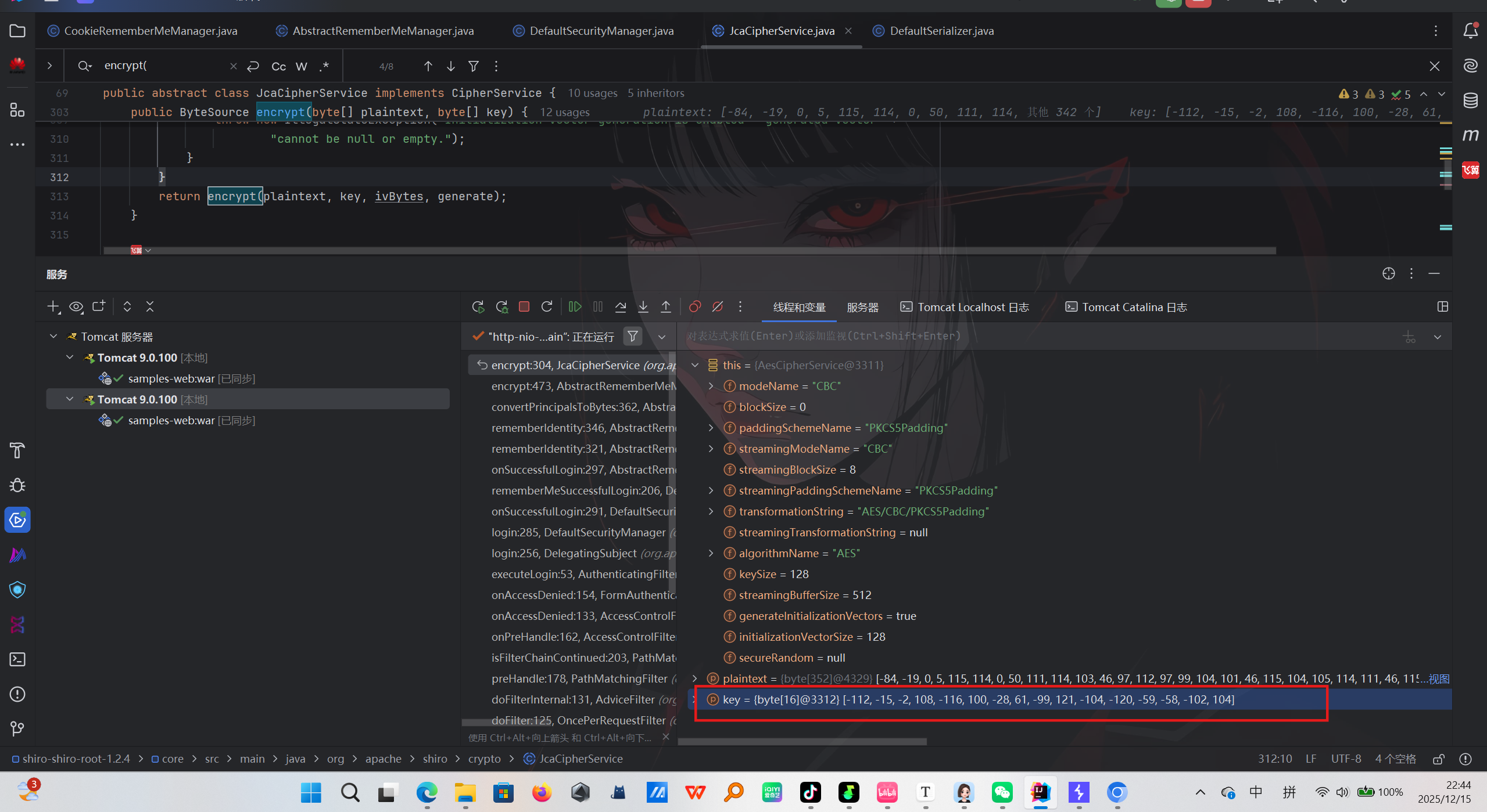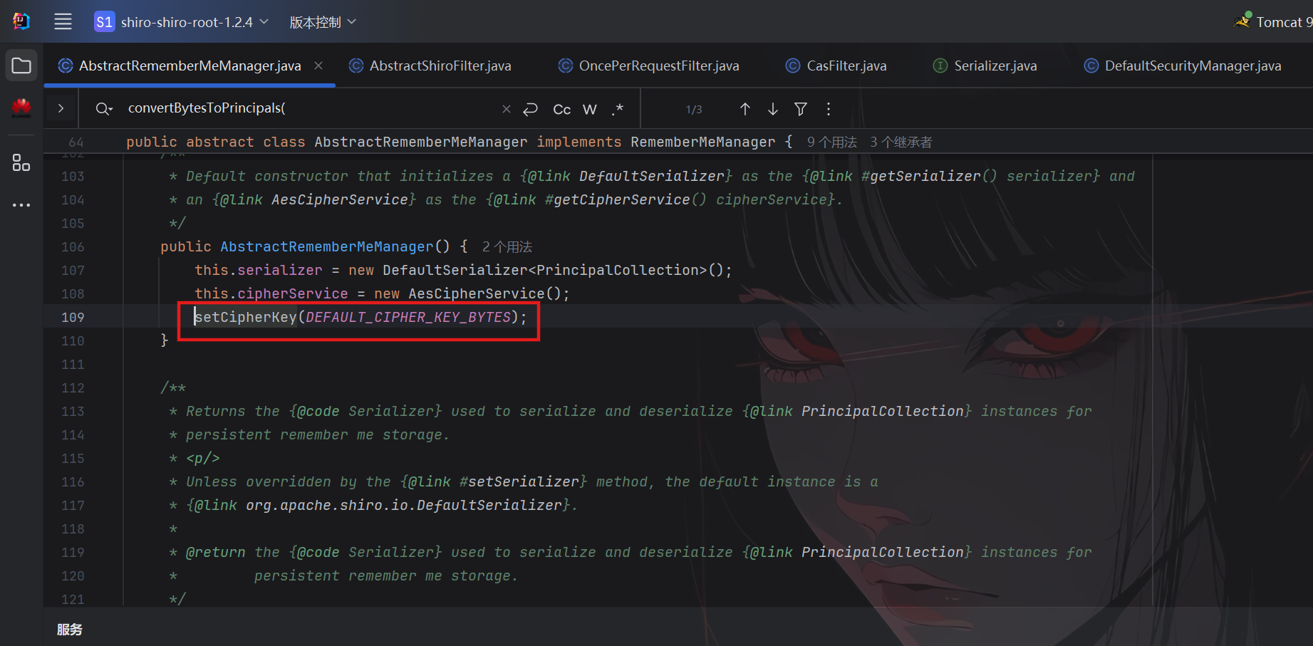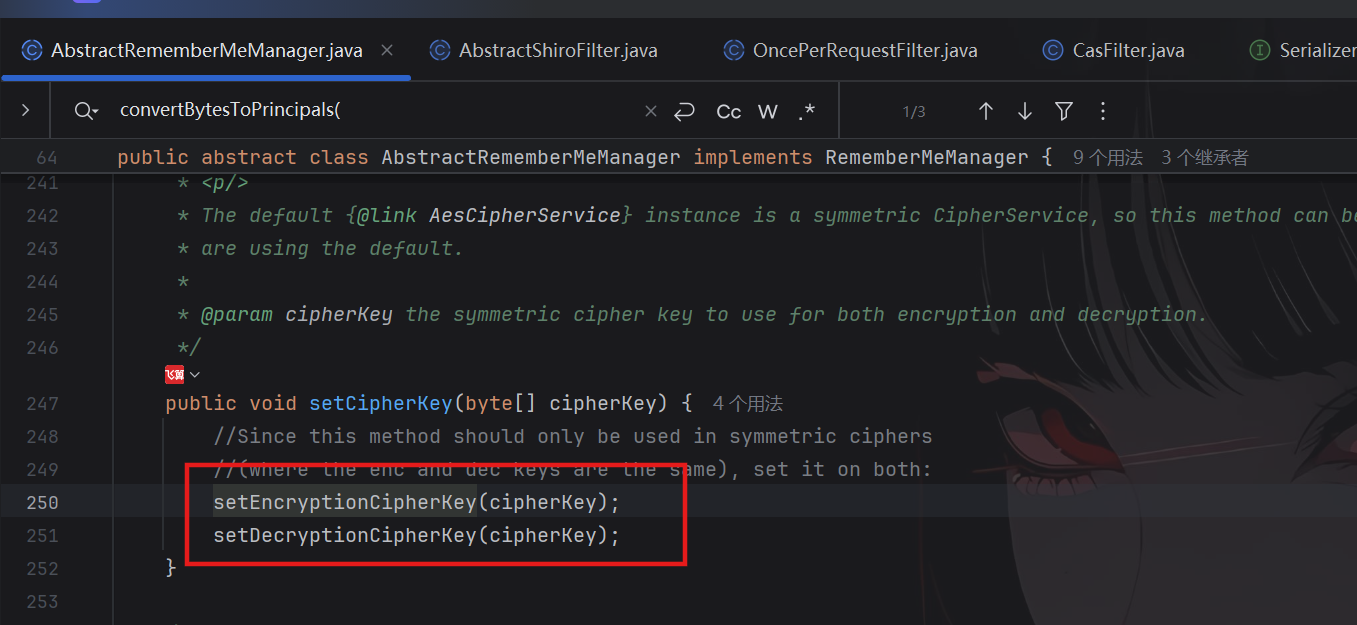 选择AbstractRememberMeManager类,可以发现key来源于getEncryptionCipherKey()方法