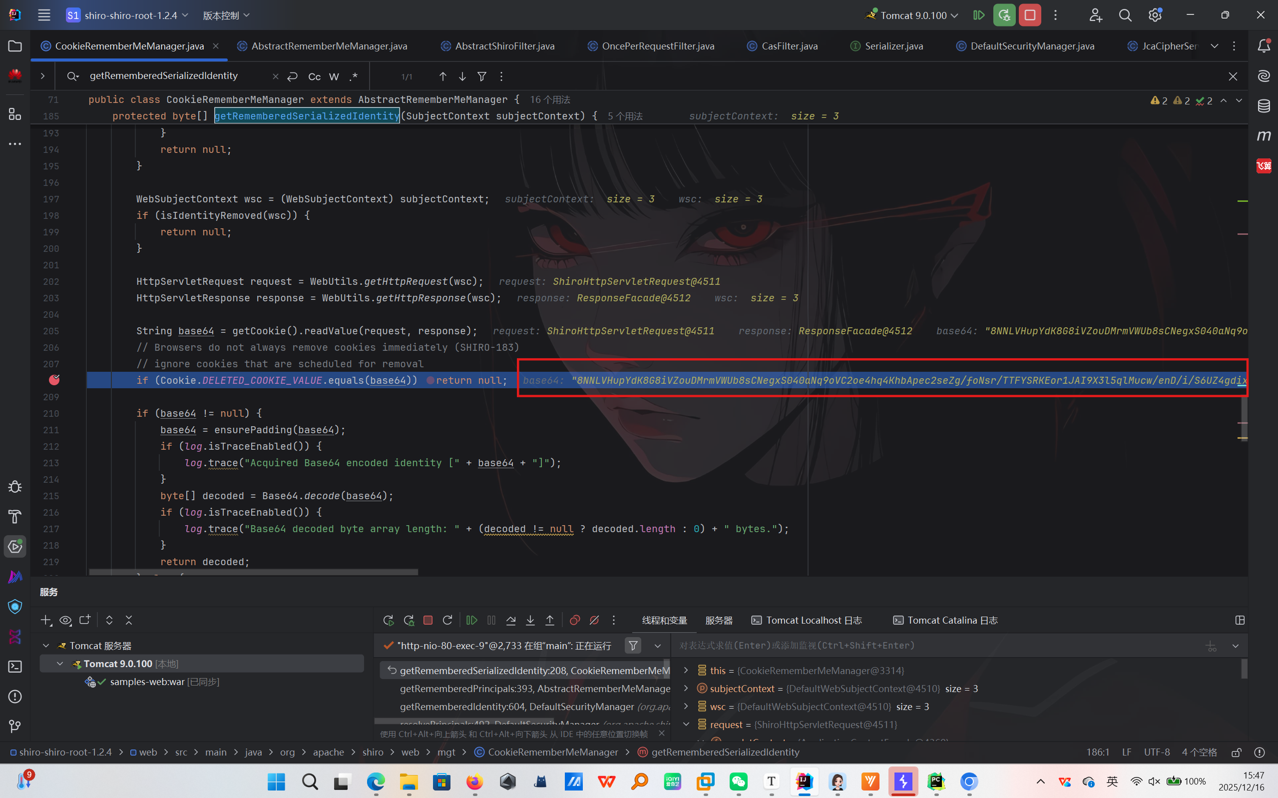 CookieRememberMeManager类下的getRememberedSerializedIdentity方法,这里获取了rememberme的值