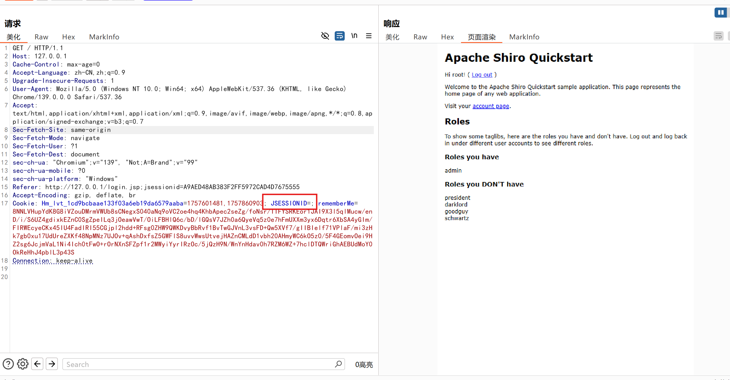 用带有rememberme参数值并且置空JSESSIONID参数值的数据包发送