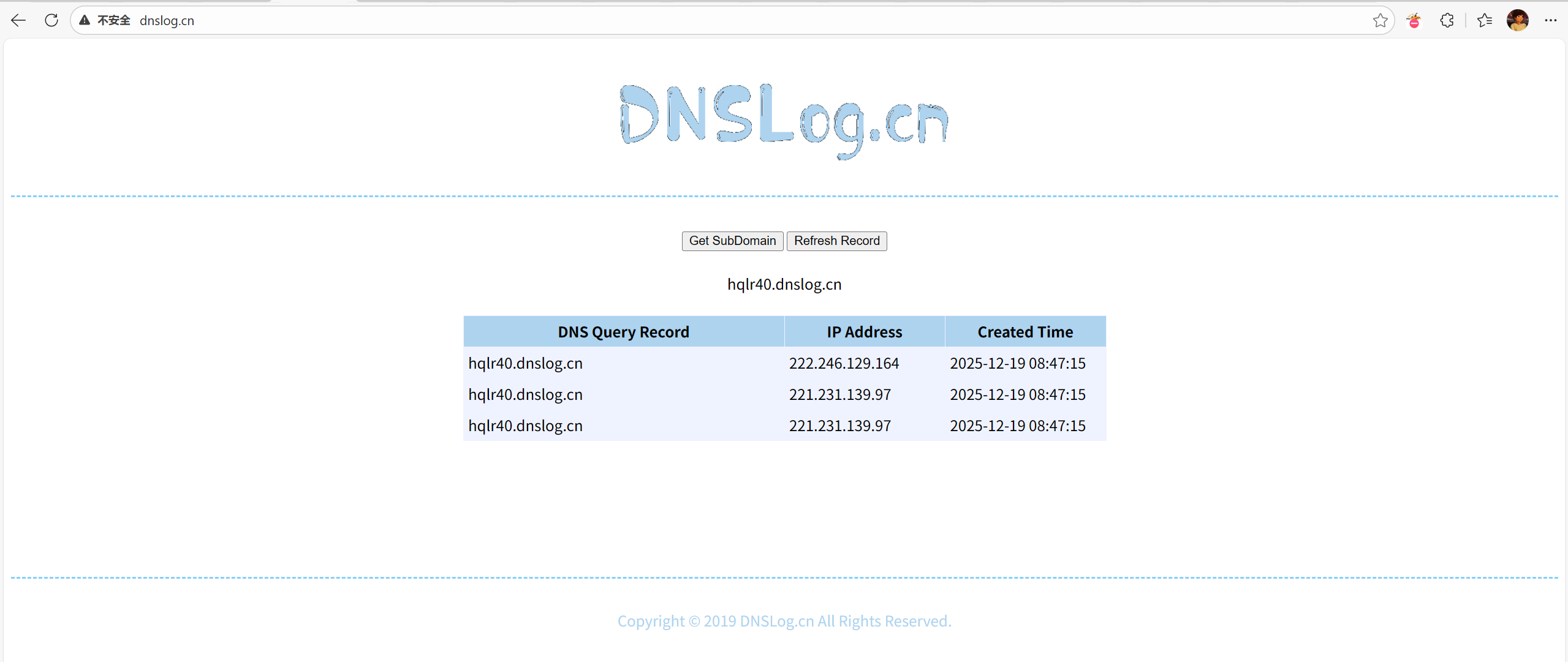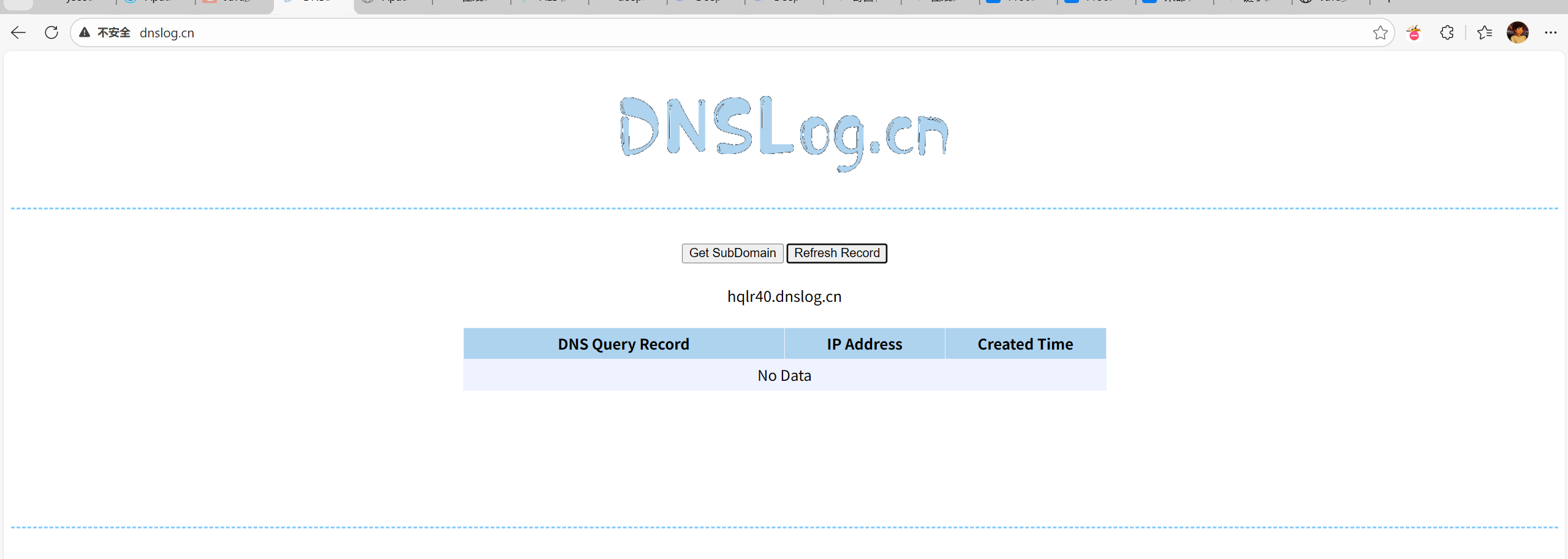 1.先通过 DNS 日志平台(如 dnslog.cn)获取一个临时 DNS 地址(如 https://hqlr40.dnslog.cn),用于验证漏洞是否触发。