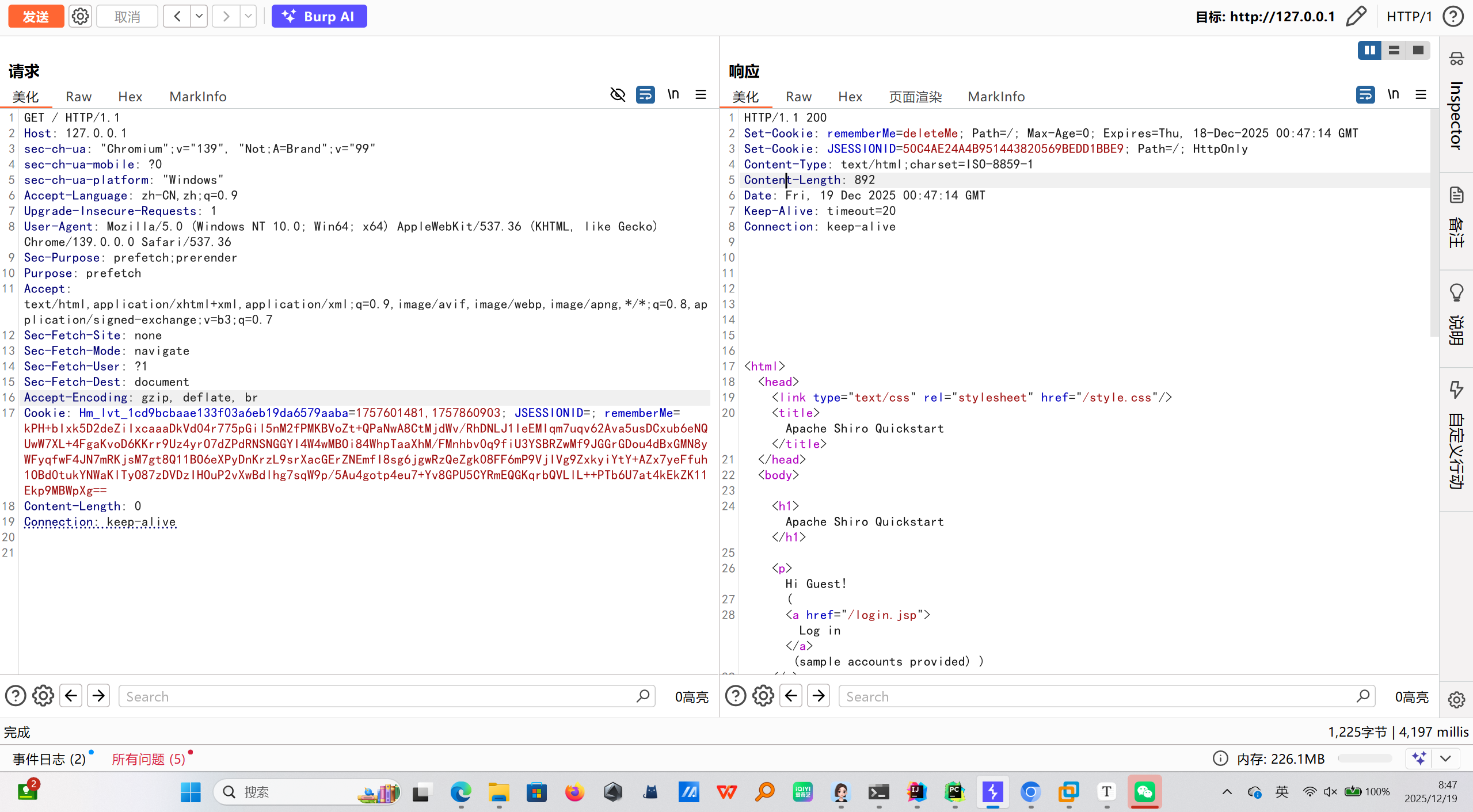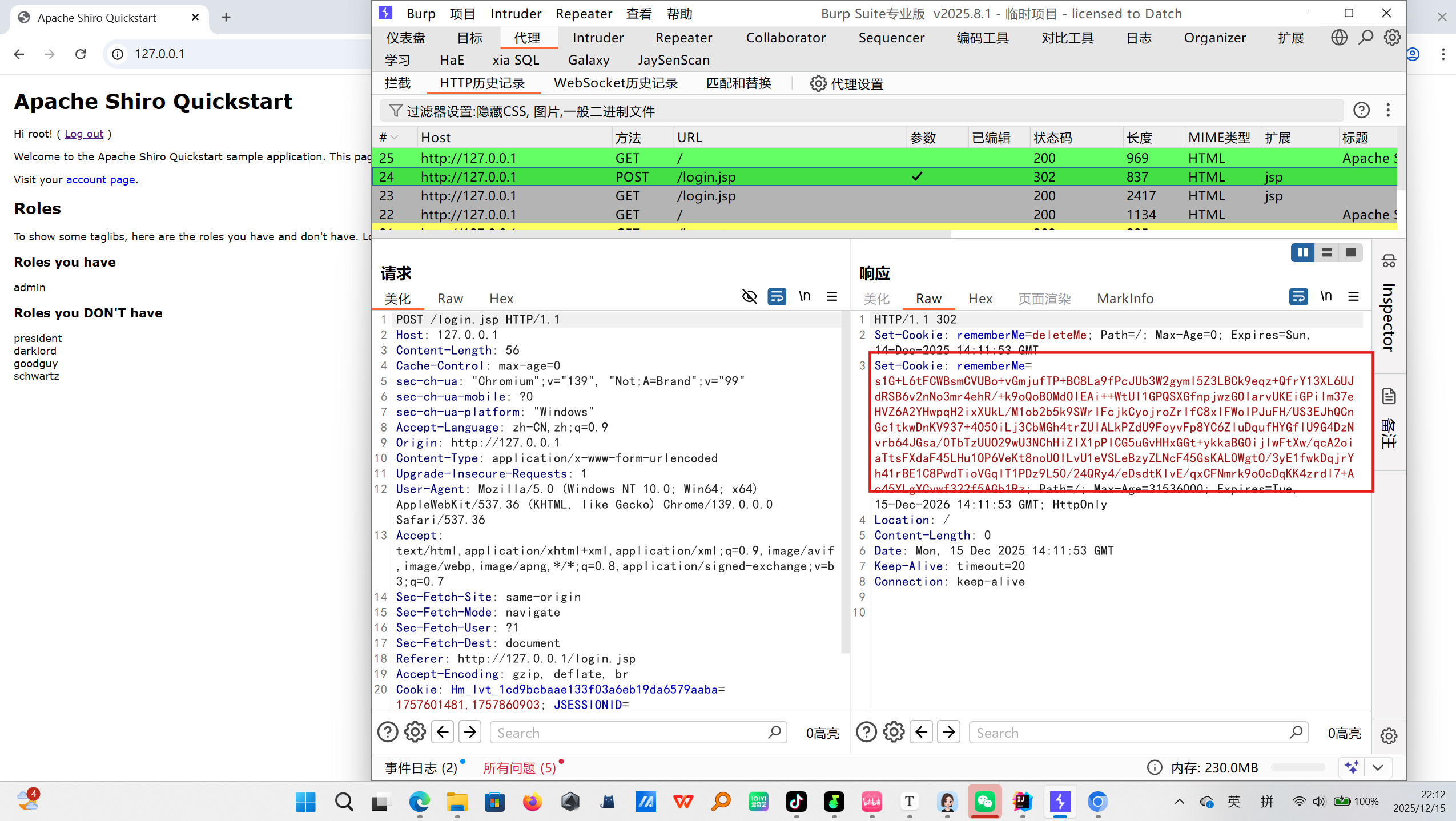 勾选「RememberMe」并登录,响应包中会出现 rememberMe 字段,其值为一串 Base64 编码字符串。