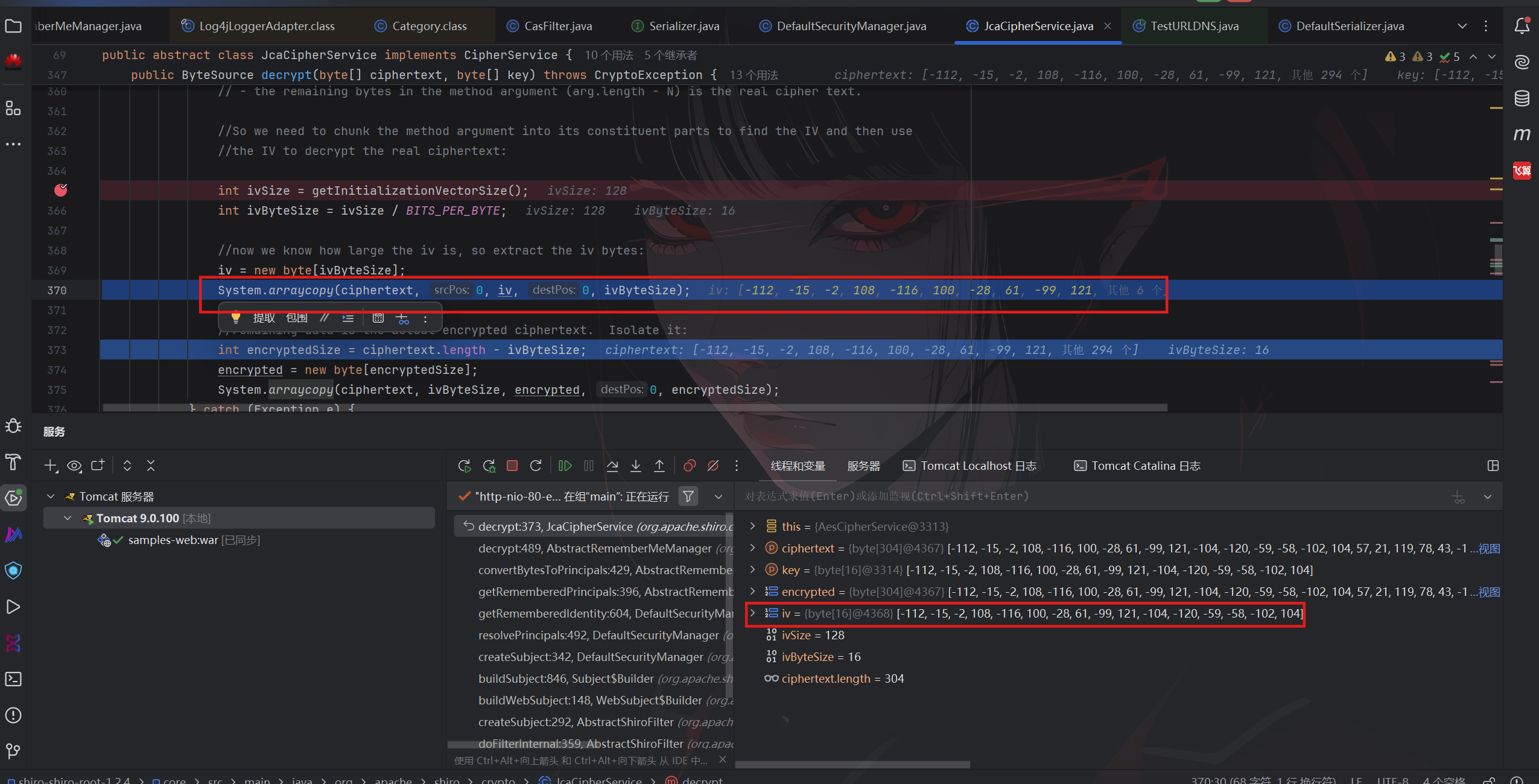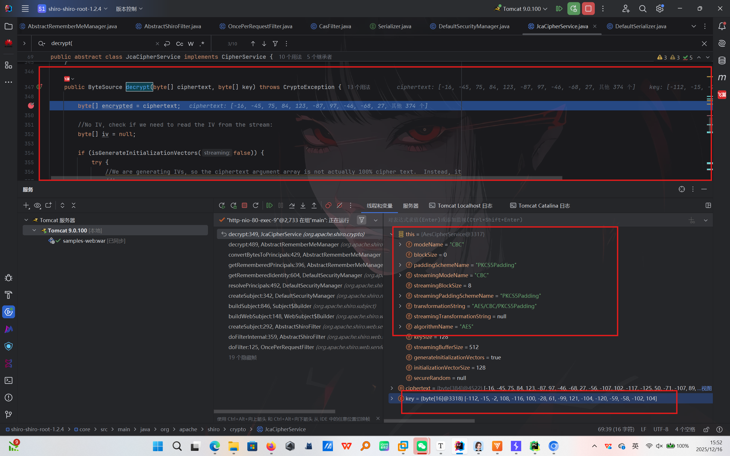 继续跟到JcaCipherService类的decrypt方法,发现了aes解密过程,这里发现key依旧没变,iv是base64解码后提取的前16位字节