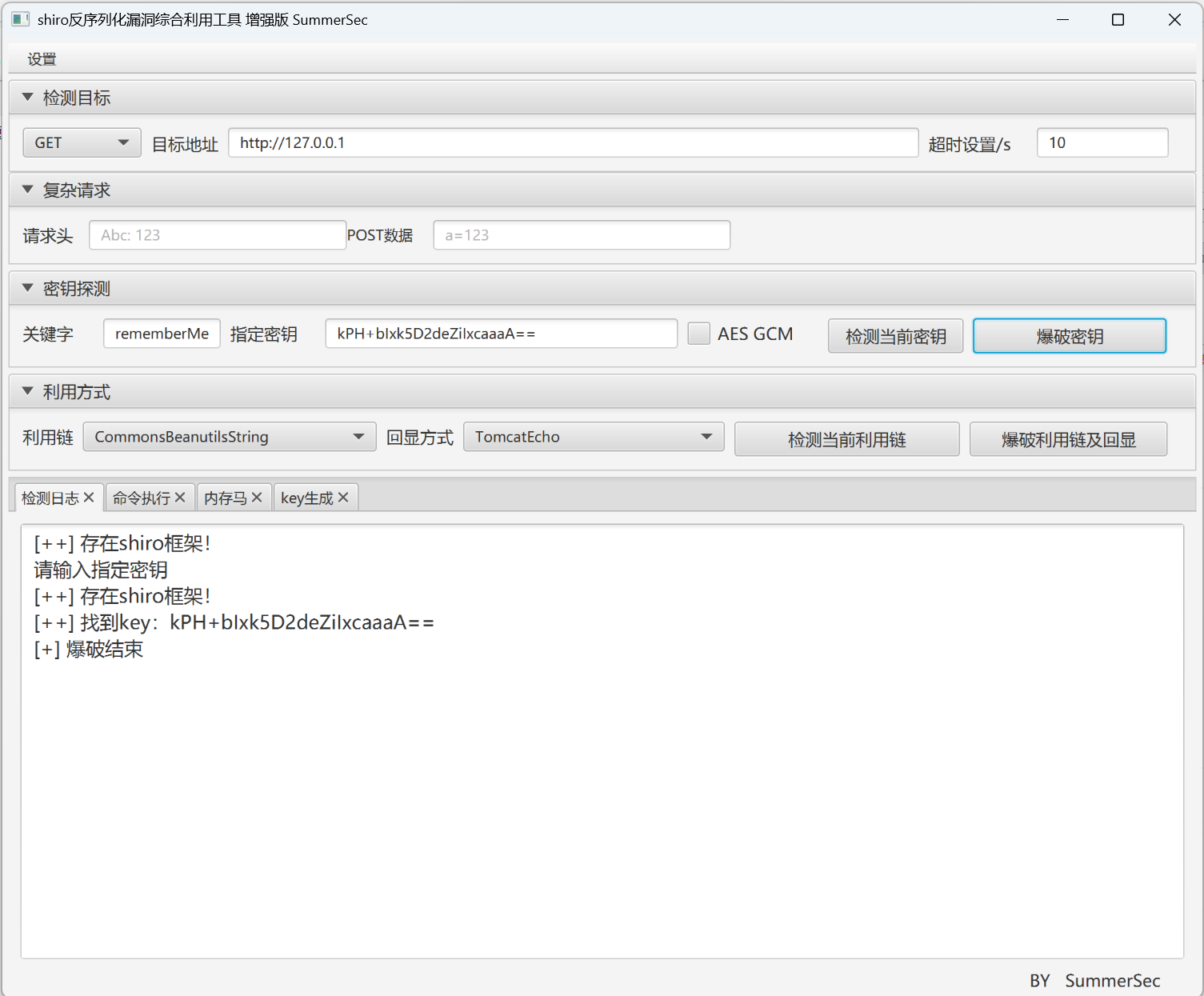 1.爆破密钥:输入目标 URL 后,工具会自动爆破默认硬编码密钥。