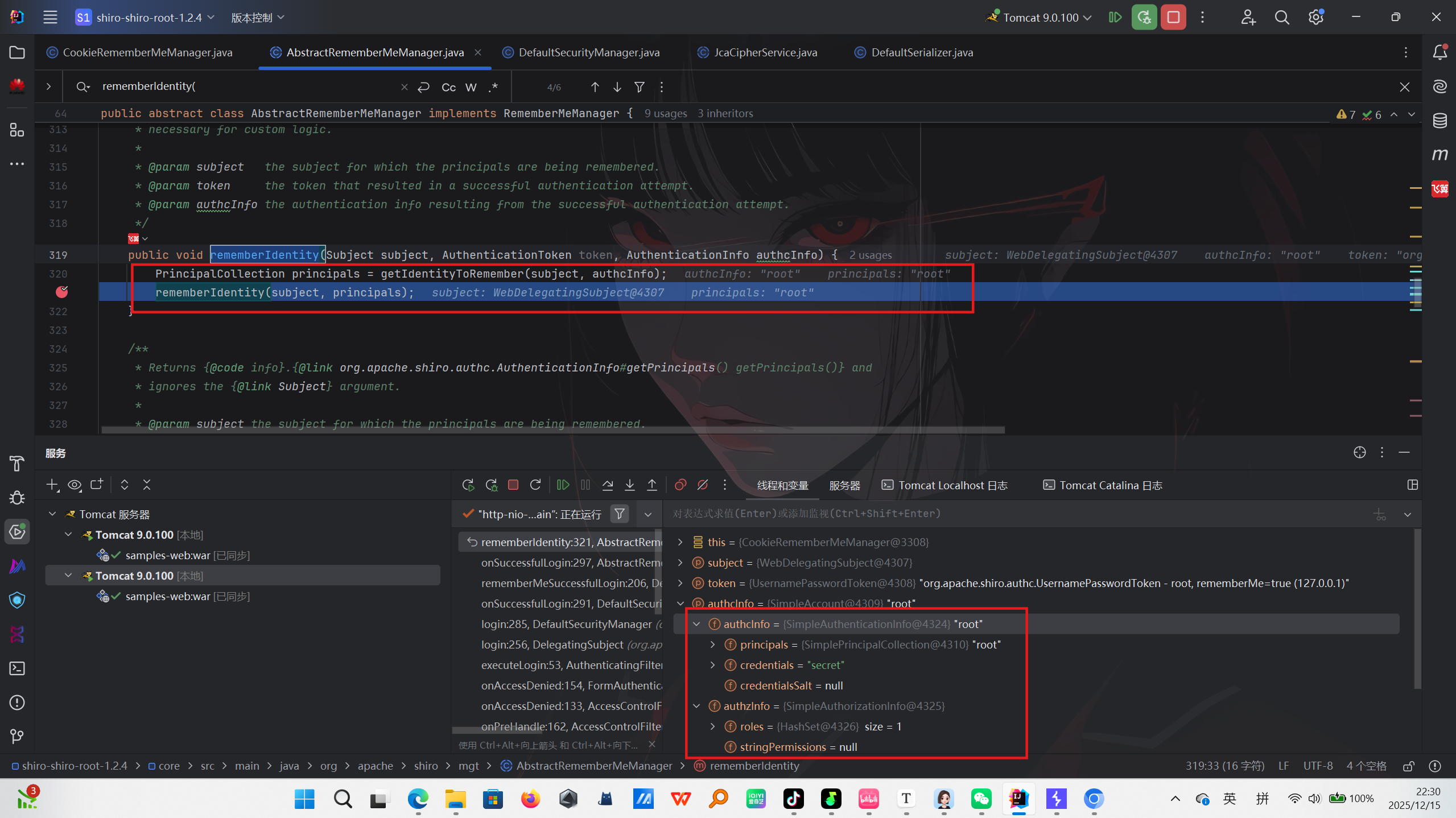 AbstractRememberMeManager类的rememberIdentity方法打下断点
