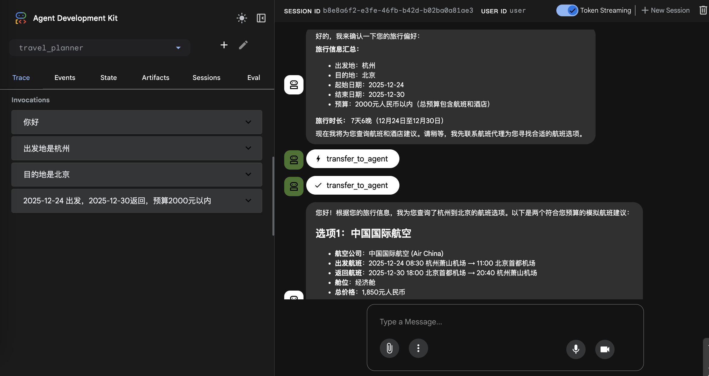 - 多代理协作:主代理 (Coordinator) 与子代理 (Flight Agent、Hotel Agent) 协同工作