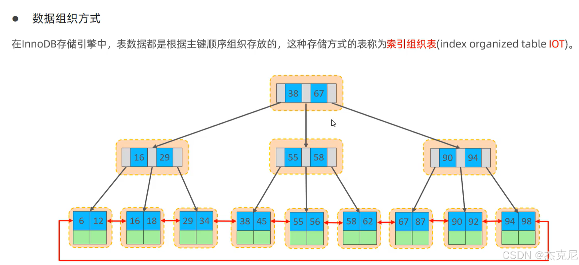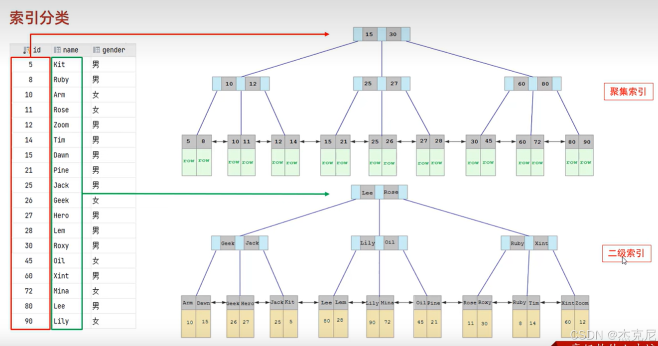 主要看叶子节点挂载的区别,聚集挂载的是这一行的数据, 二级挂载的是id