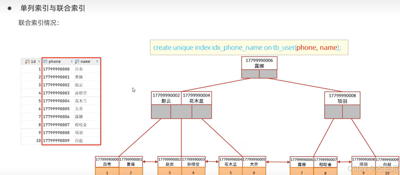 联合索引 (也叫复合索引 )是数据库中基于多个字段组合创建的索引,而非单一字段。它可以理解为把多个字段的值按顺序拼接后生成的索引结构,用于加速多字段组合条件的查询。
