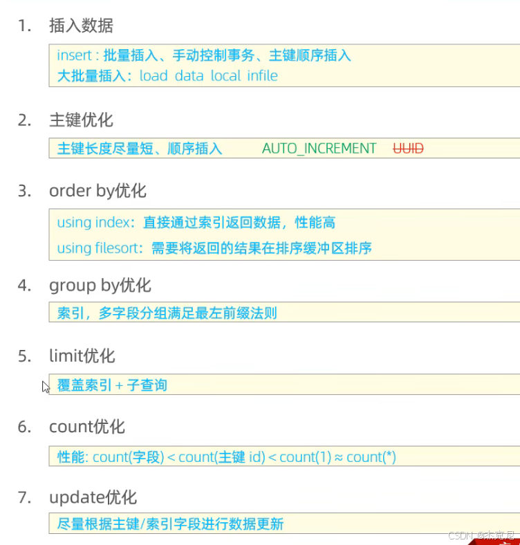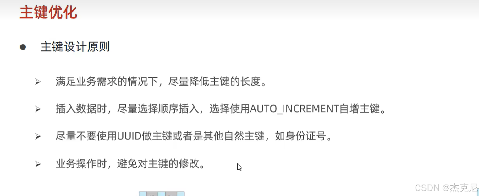 尽量降低主键长度,顺序插入(auto_increment自增主键),尽量不要使用uuid或者其他自然主键,避免对主键的修改