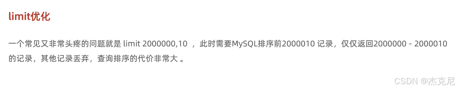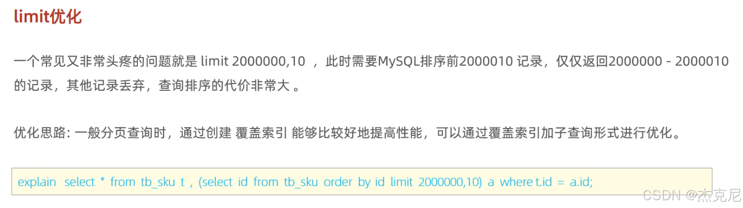 子查询select id from tb_sku order by id limit 2000000,10中,id是主键(默认会有主键索引),而查询字段只有id,此时主键索引就是覆盖索引(因为索引本身包含了查询所需的所有字段)。