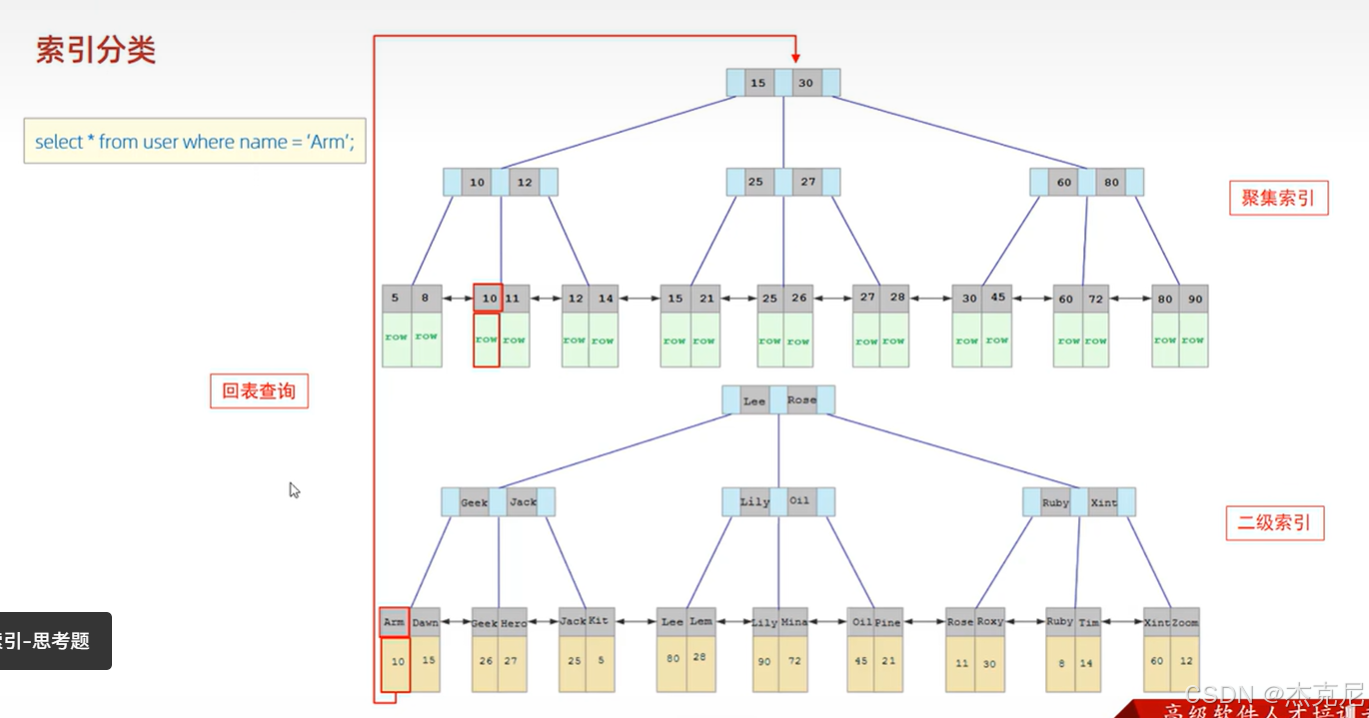 是查询语句现在二级索引的叶子节点处找到id值,然后拿着这个id值去聚集索引里面查询这个行数据就叫回表查询