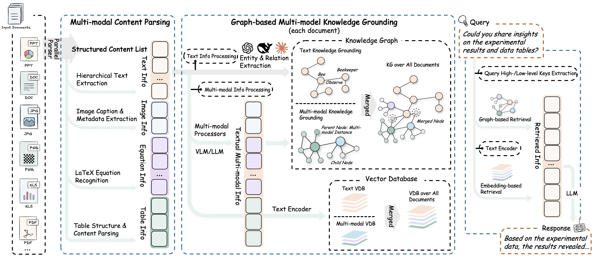 - RAG-Anything: All-in-One RAG Framework 这个框架支持端到端多模态流水线、MinerU和Docling的文档解析工具、混合智能检索等特性。另外其Knowledge Graph的构建,通过实体提取和跨模态关联,能够真正打通不同文本、图像、表格之间的信息孤岛。
