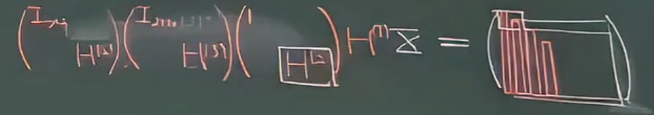 一共反射 MMM 列: H=[IM−1×M−1HM]⋅⋅⋅[I3×3H4][I2×2H3][1H2]H(1)H=\begin{bmatrix}I_{M-1\times M-1}&\\&H^{M}\end{bmatrix}···\begin{bmatrix}I_{3\times 3}&\\&H^{4}\end{bmatrix}\begin{bmatrix}I_{2\times 2}&\\&H^{3}\end{bmatrix}\begin{bmatrix}1&\\&H^{2}\end{bmatrix}H^{(1)}H=[IM−1×M−1HM]⋅⋅⋅[I3×3H4][I2×2H3][1H2]H(1)