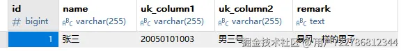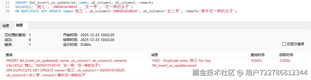 id,但有name,可想而知判断数据行是否存在,用到的是唯一索引,因为name=张三的记录已经存在,所以根据 name 去更新其他字段值;那么执行结果与如下 SQL 一致iniUPDATE tbl_insert_on_update SET uk_column1='20050101003', uk_column2='男三号', remark='暴风一样的男子' WHERE name = '张三';id = 1与name = '张三'指向的本来就是同一行数据,更新的列与列值都一致,那么执行结果自然就一样了 -