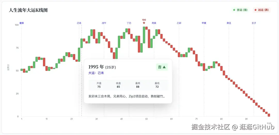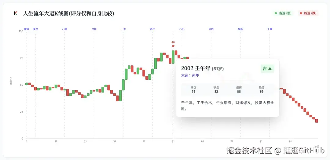 你只需要输入自己的生辰八字,就能生成类似下面这样的人生 K 线图: