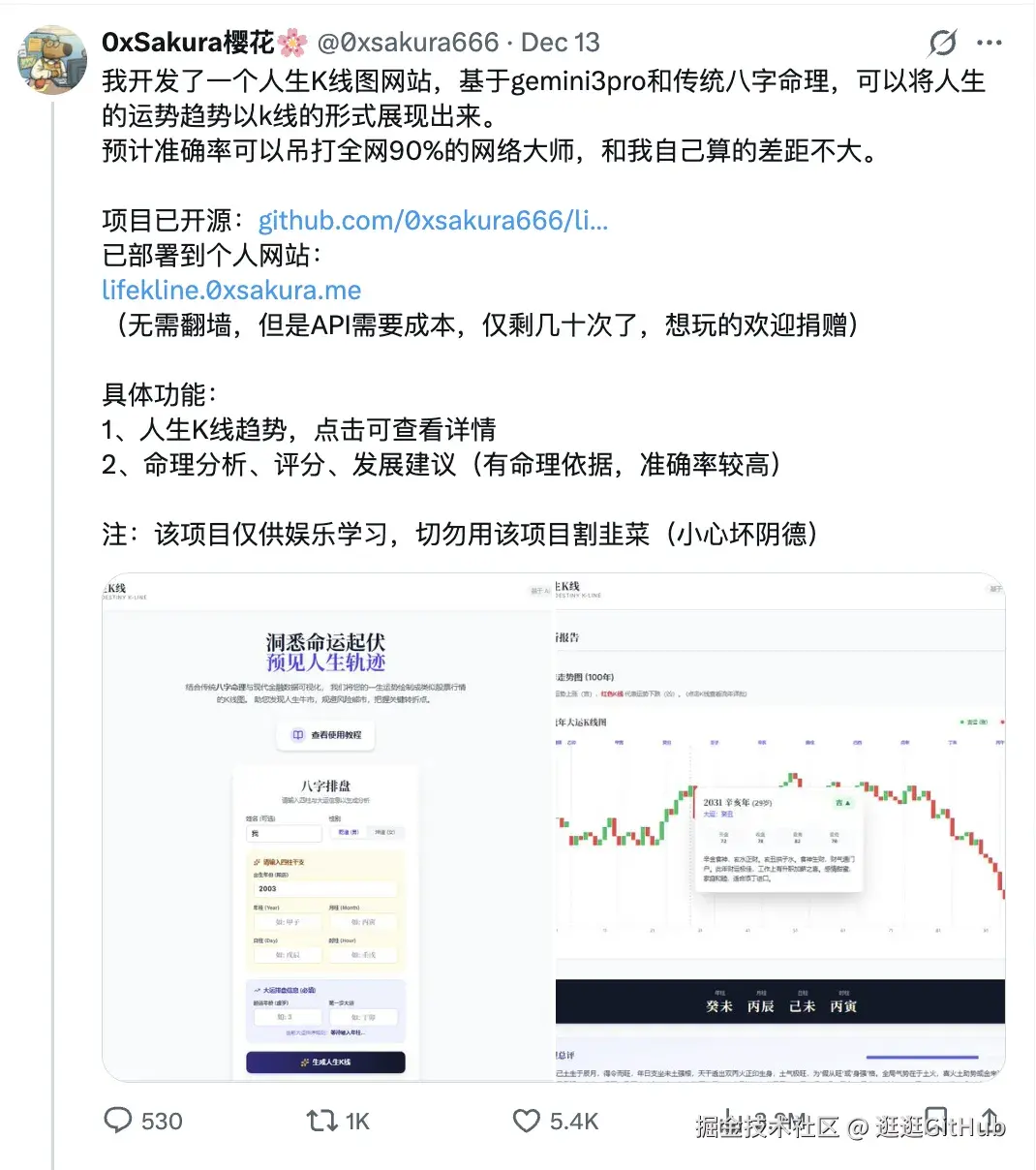 不过,我去 GitHub 上看了看,还是有挺多刚刚开源的人生 K 线开源项目。比如这个 @curionox 开源的 lifekline,它其实是一个纯前端的开源网页。